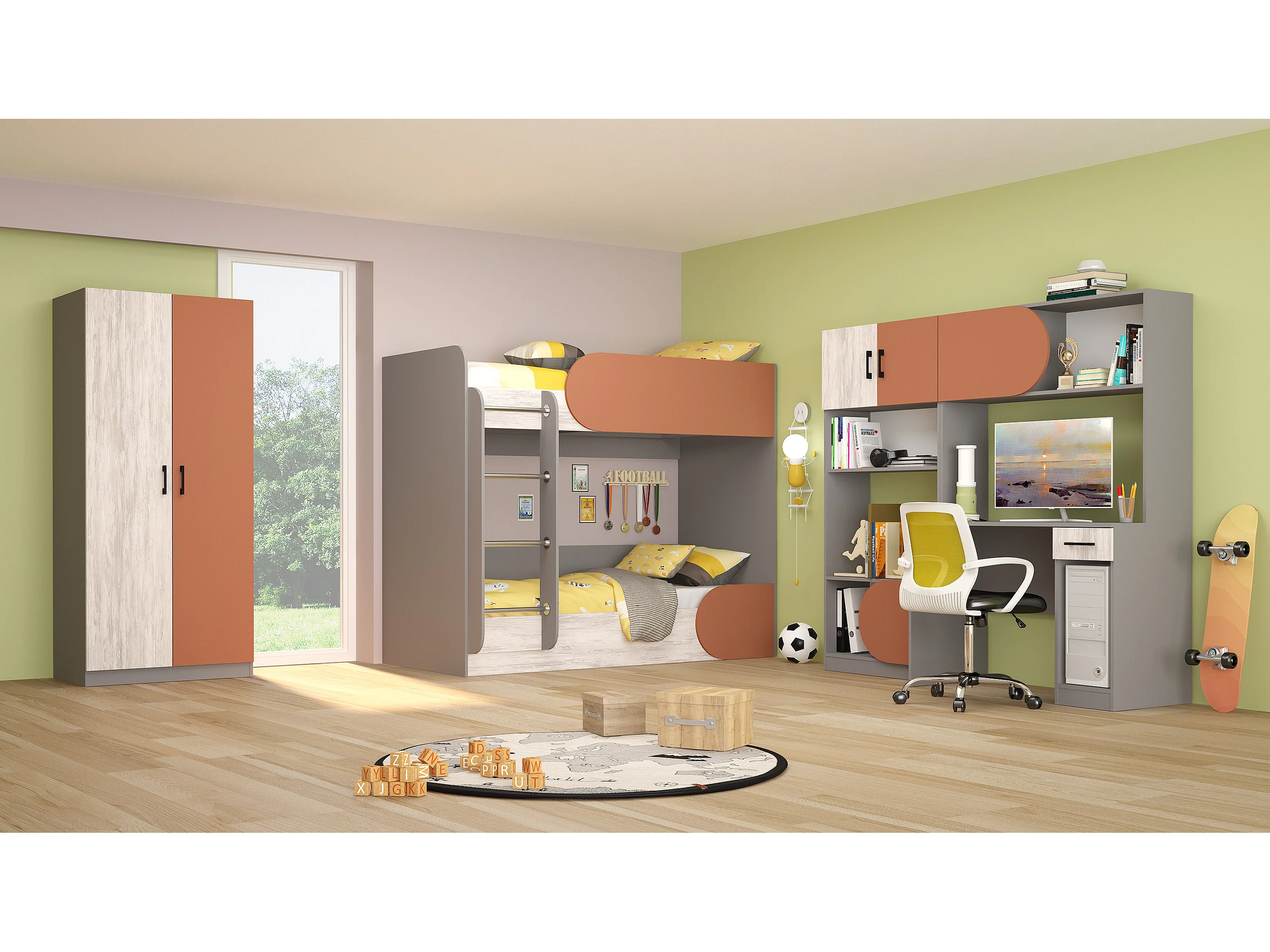 Cameretta completa con letto a castello grigio, bianco legno, arancio CBG1
