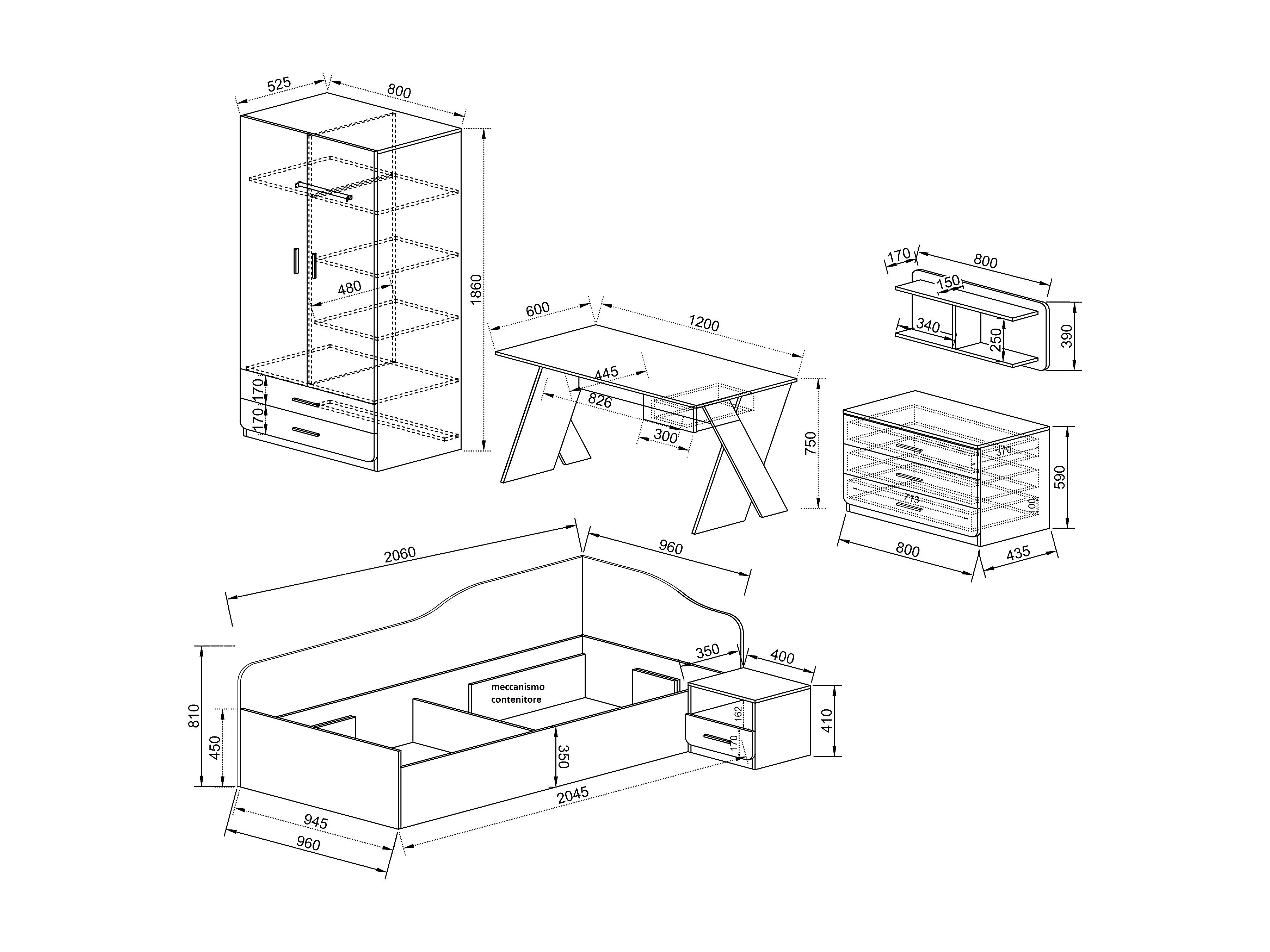 Cameretta completa moderna con letto contenitore 90x200 cm in rovere, antracite e bianco CBG12