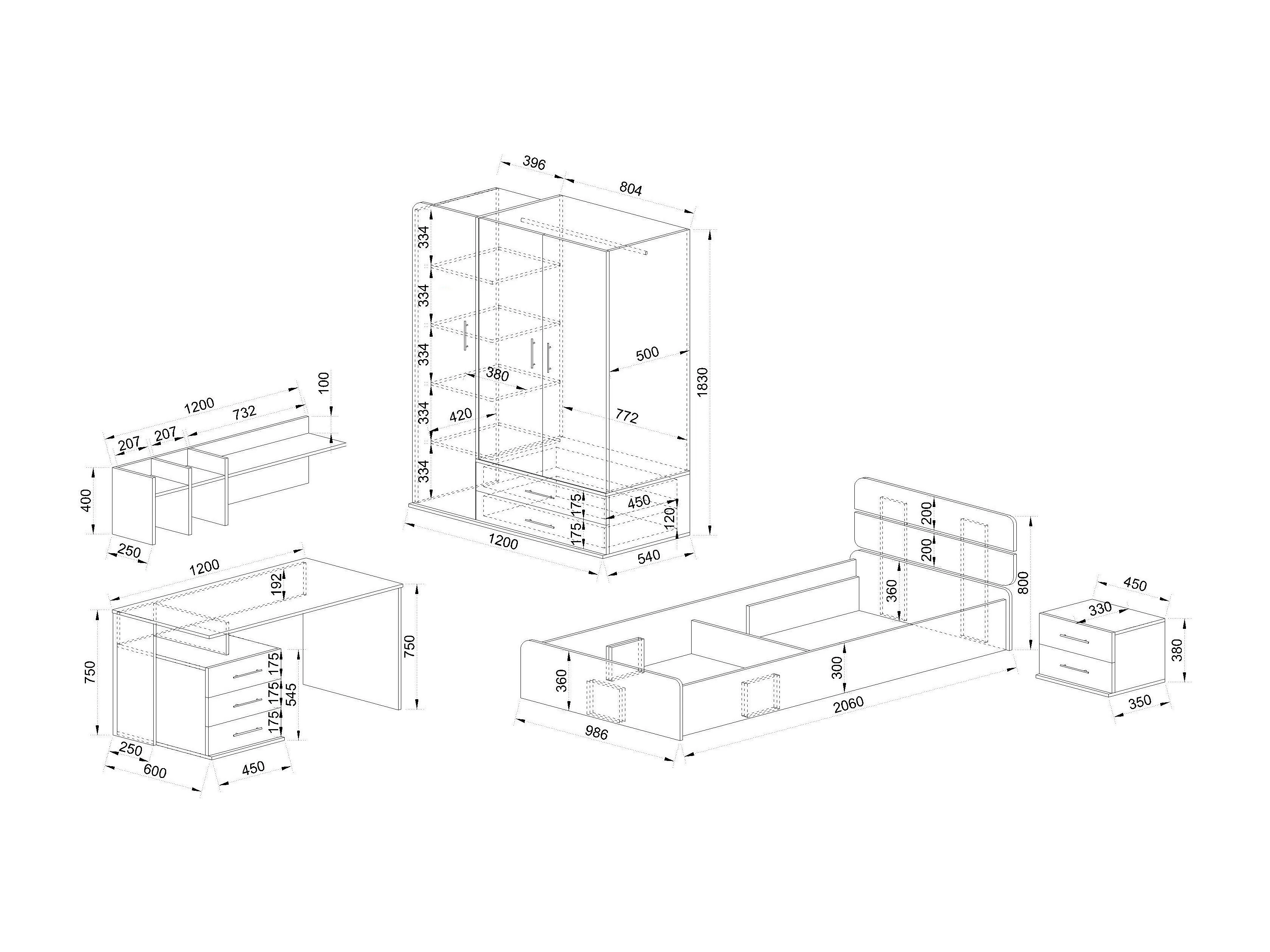 Cameretta completa 90x200 cm in rovere chiaro, bianco lucido e grigio antracite CBG16