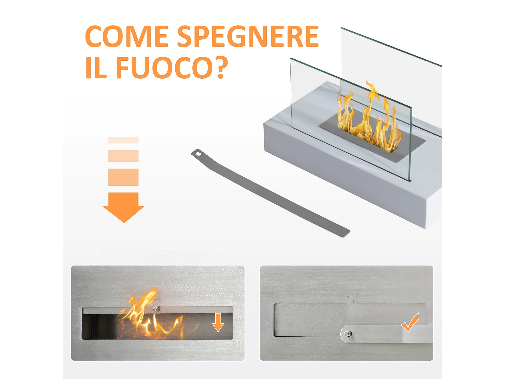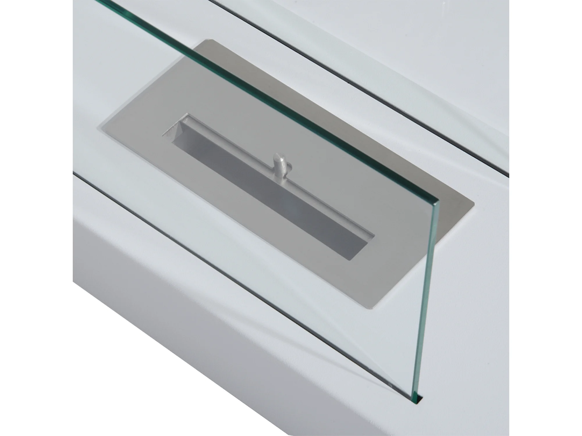 Camino a bioetanolo da tavolo in vetro e acciaio bianco