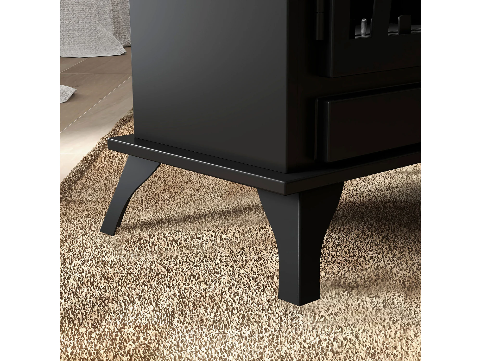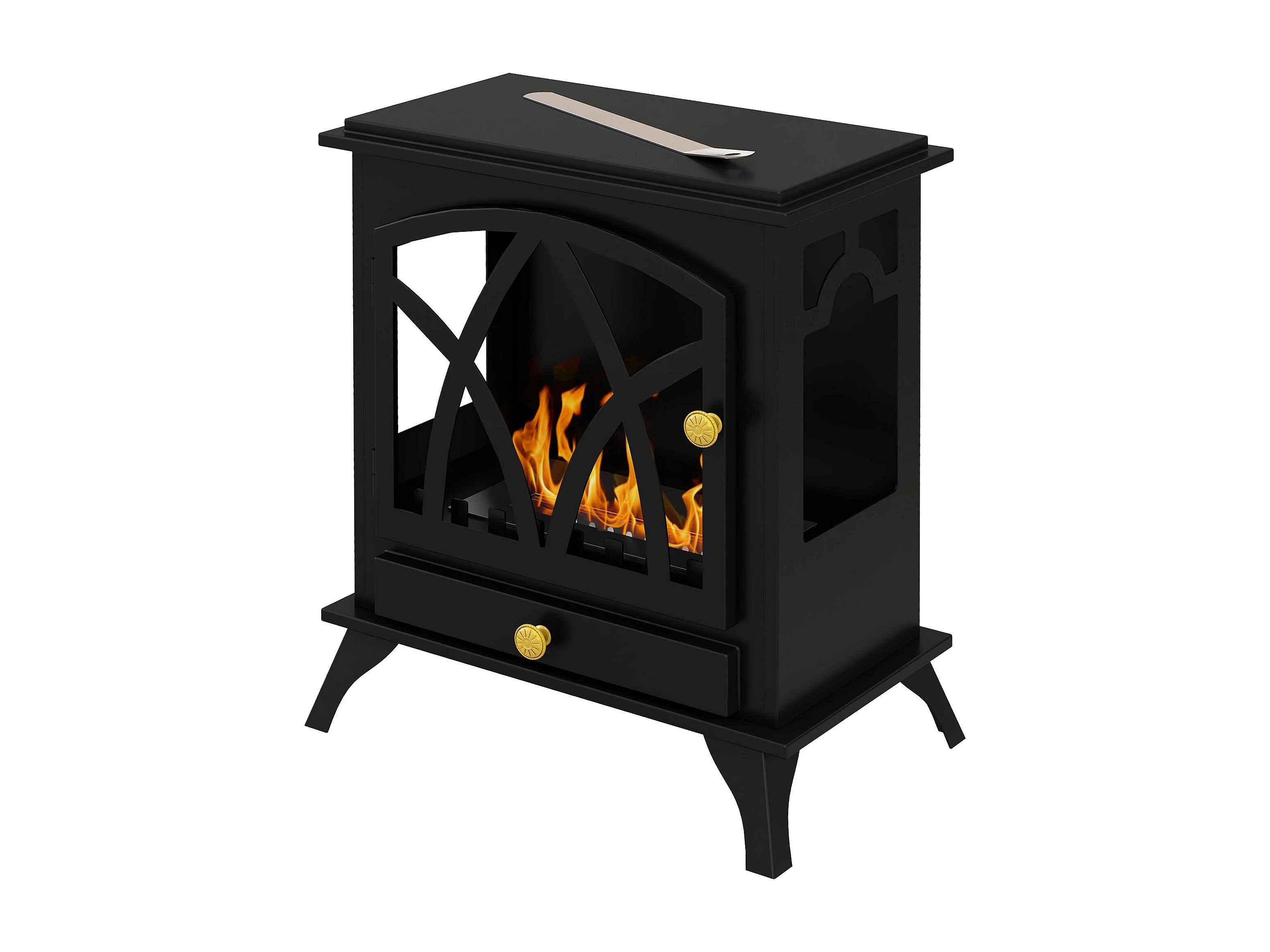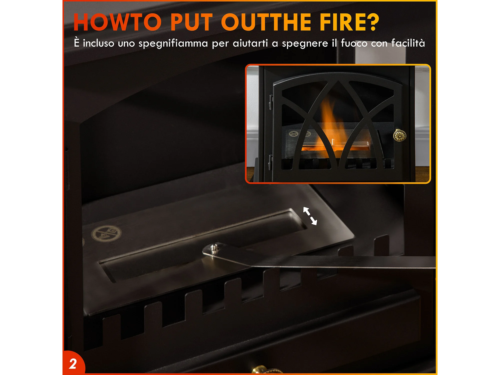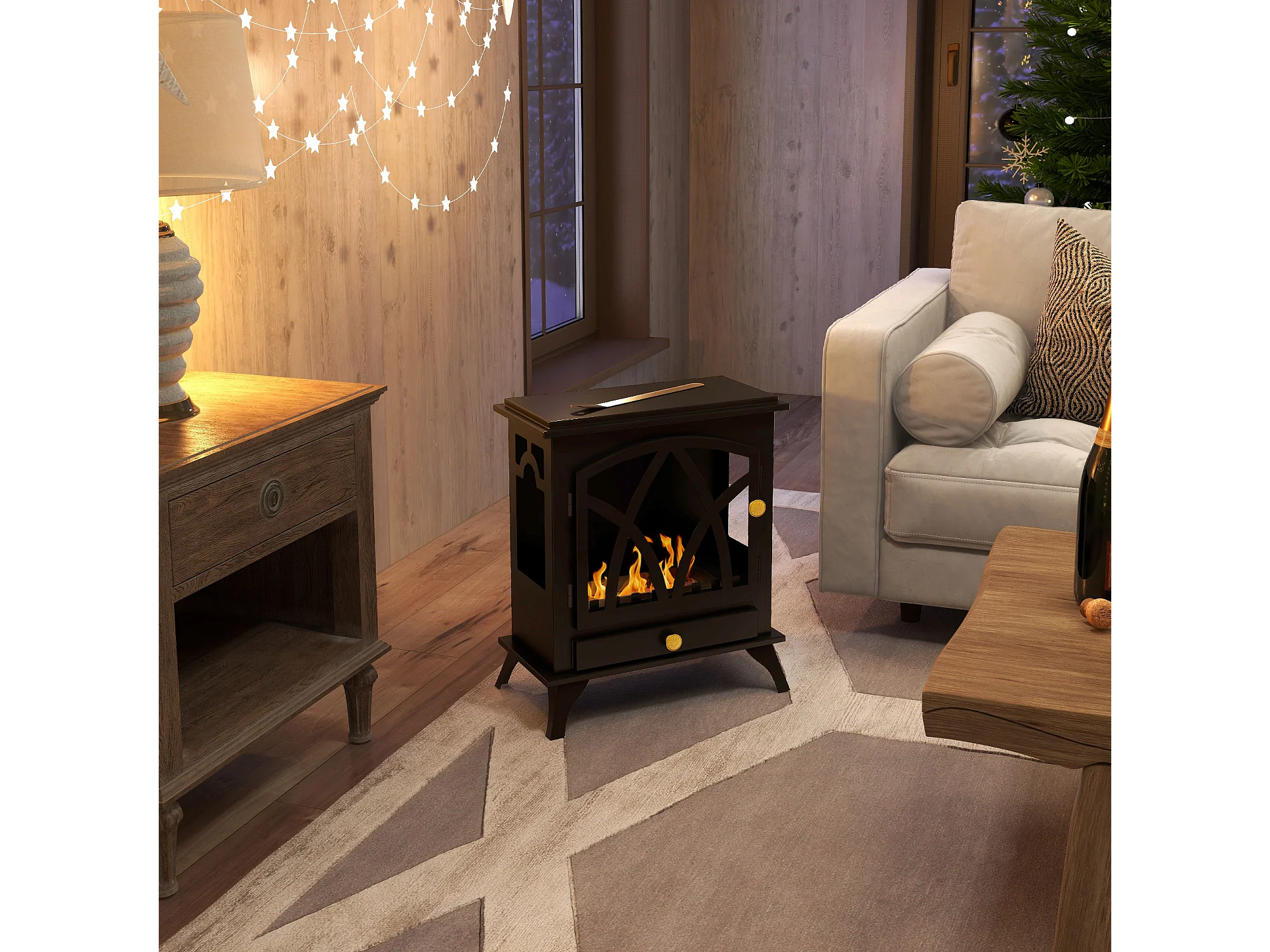 Camino a bioetanolo da interno con pannello in vetro e acciaio nero