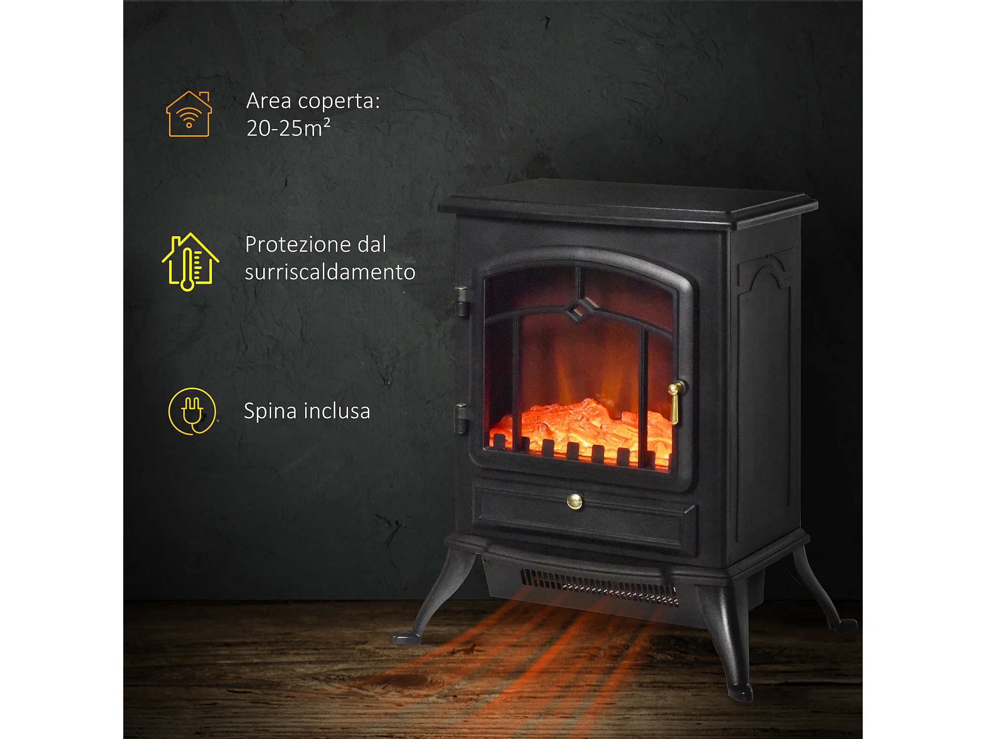 Easycomfort Camino Elettrico Da Terra Con Effetto Fiamma, Temperatura Regolabile 900w-1800w, Copertura 15-20m², 39x26x54.8cm, Nero