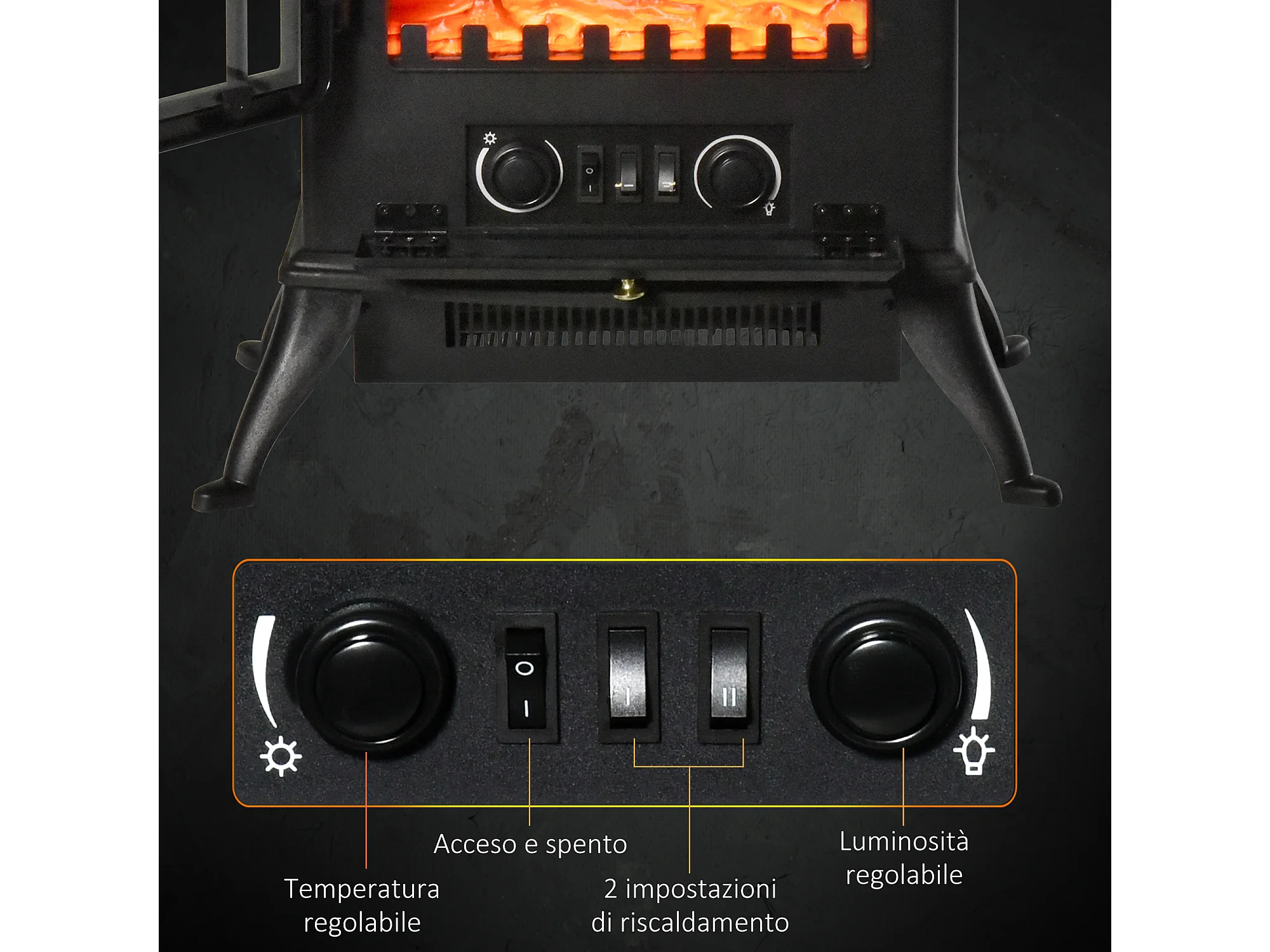 Camino elettrico effetto fiamma e termostato 1000-2000W nero