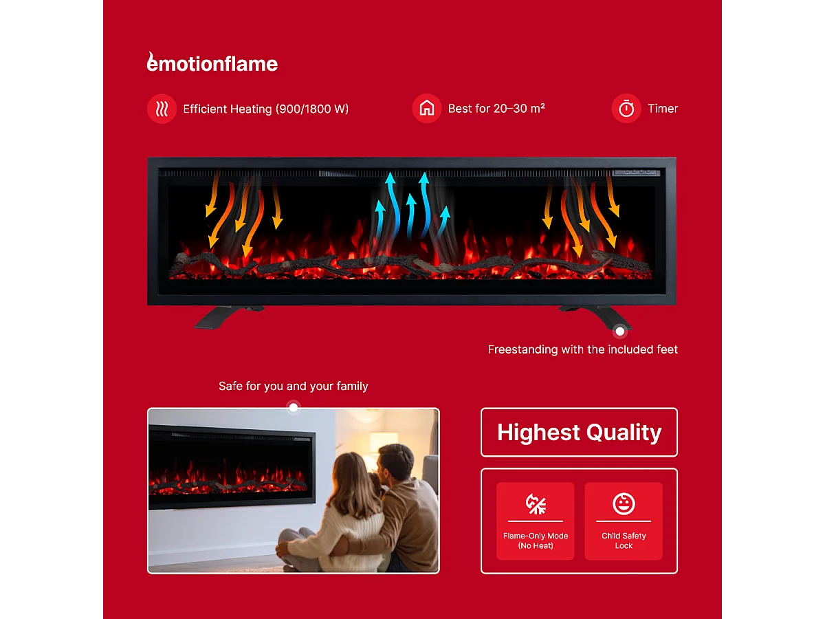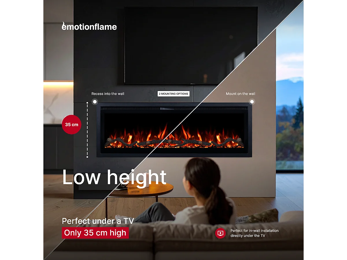 Camino elettrico REGAL 152 - fuoco premium - a parete e incassato - 152x35x12 cm - camino LED decorativo con riscaldamento 900/1800 W