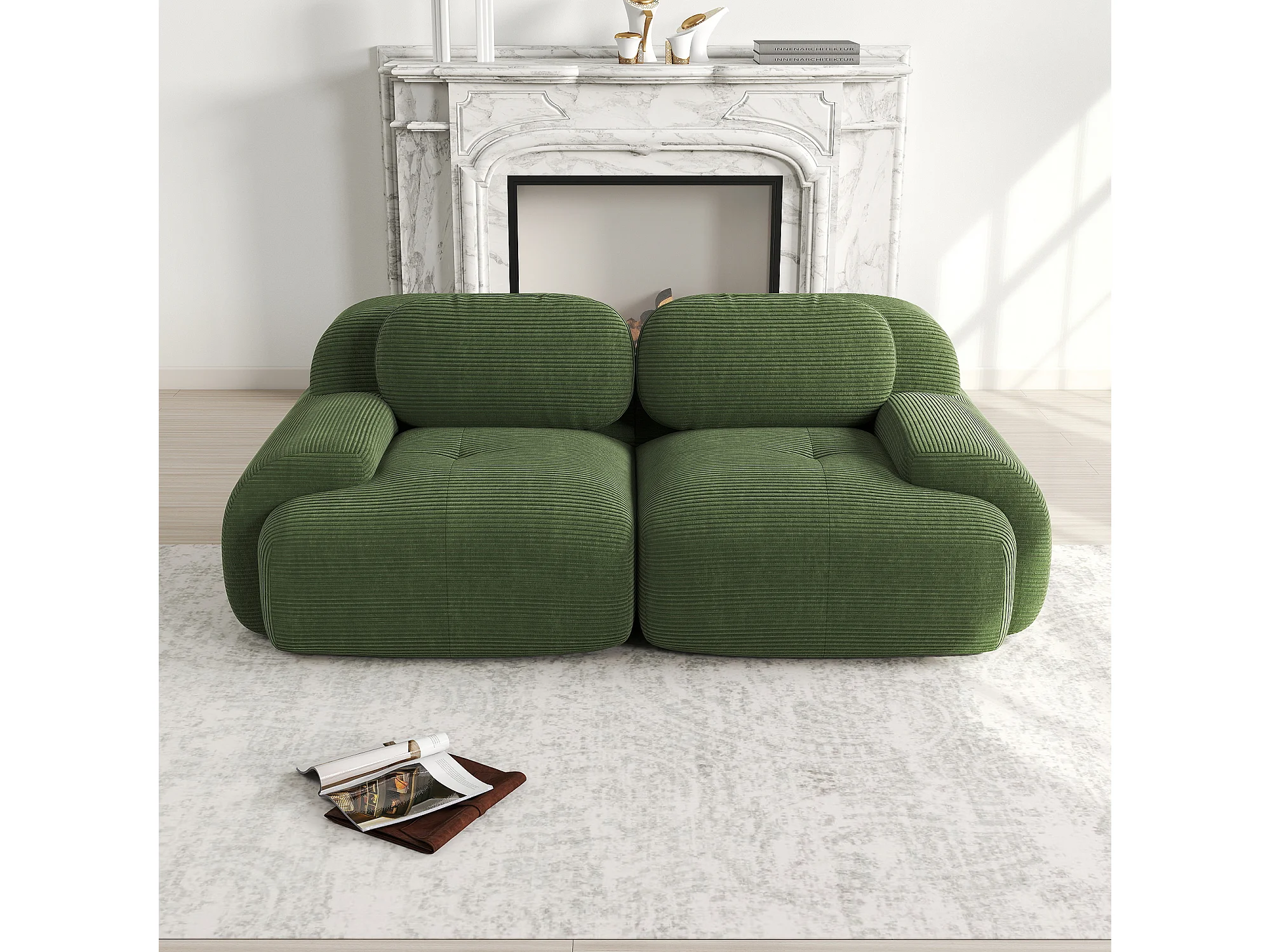 Canapé modulabile 2 posti velours côtelé vert con accoudoirs courbés et coussins élastiques 82''