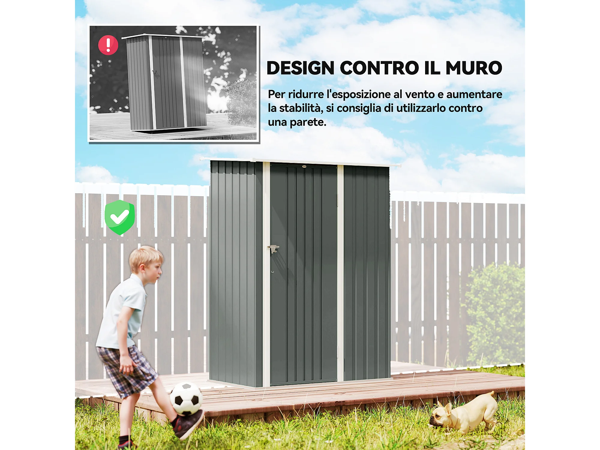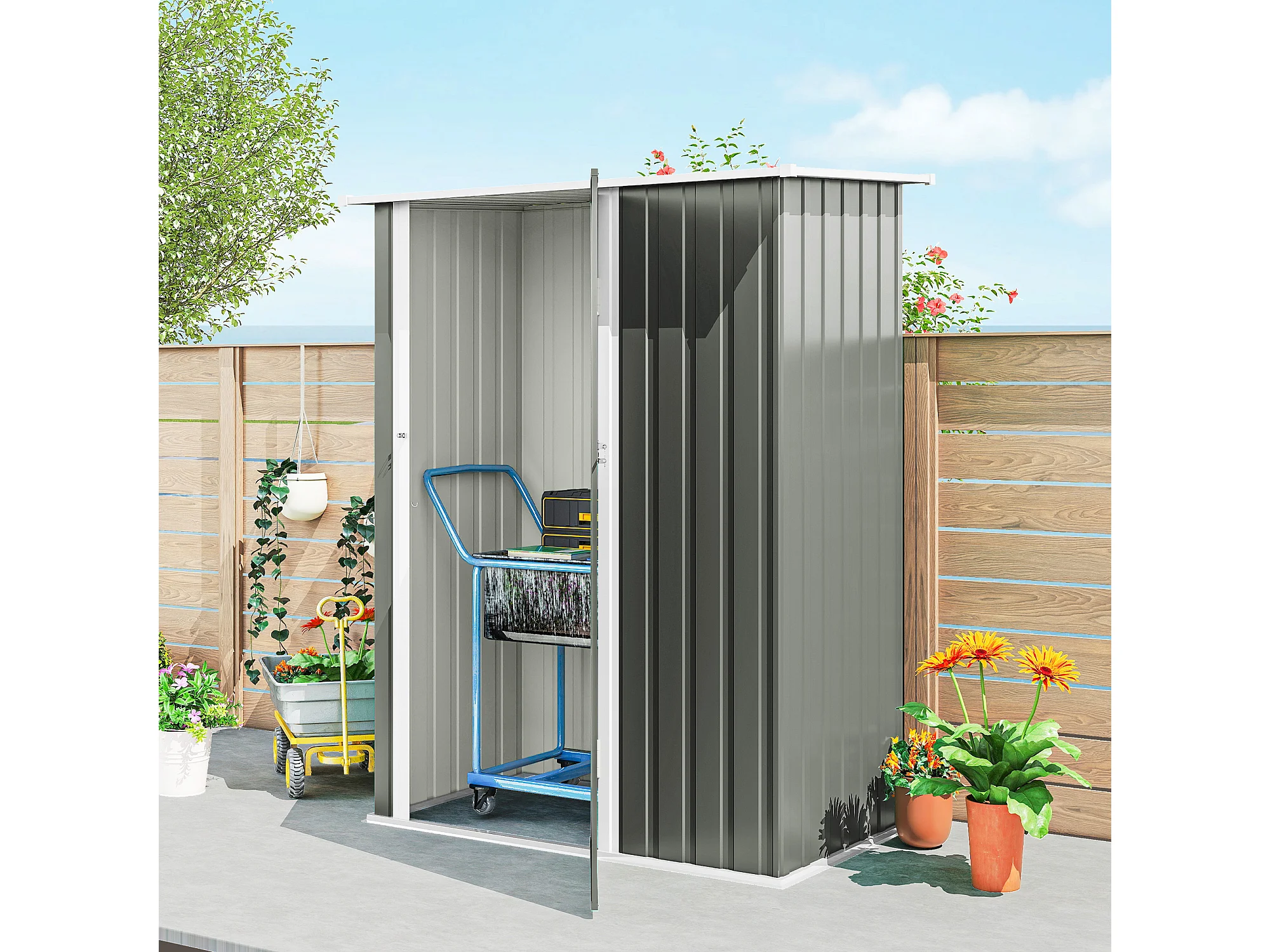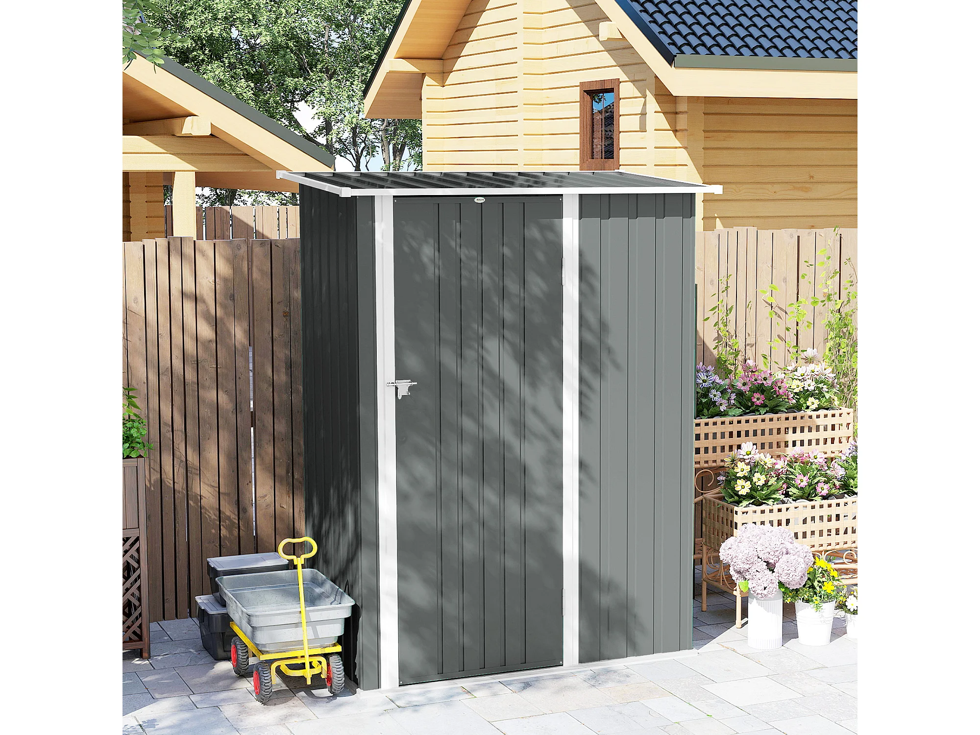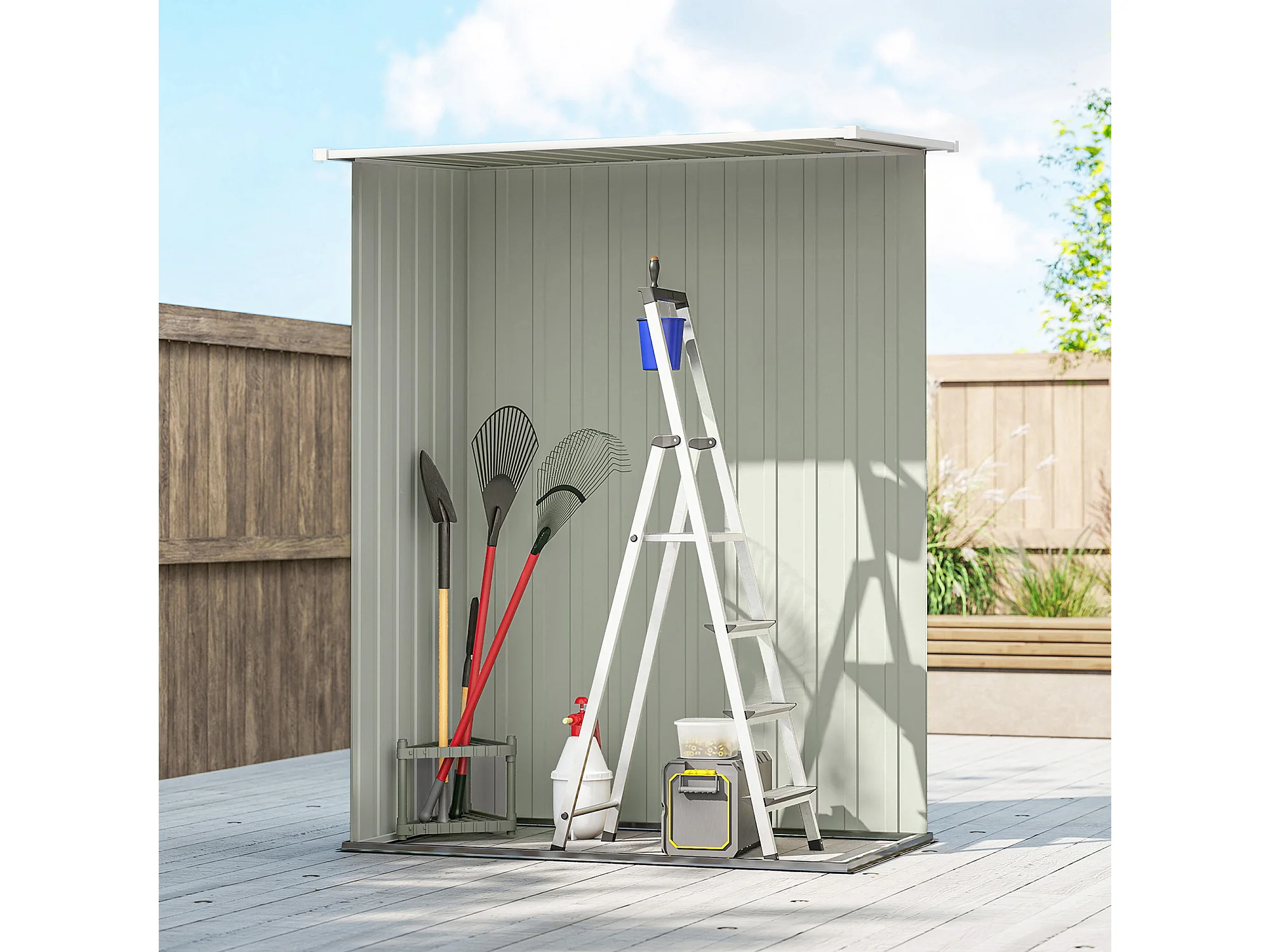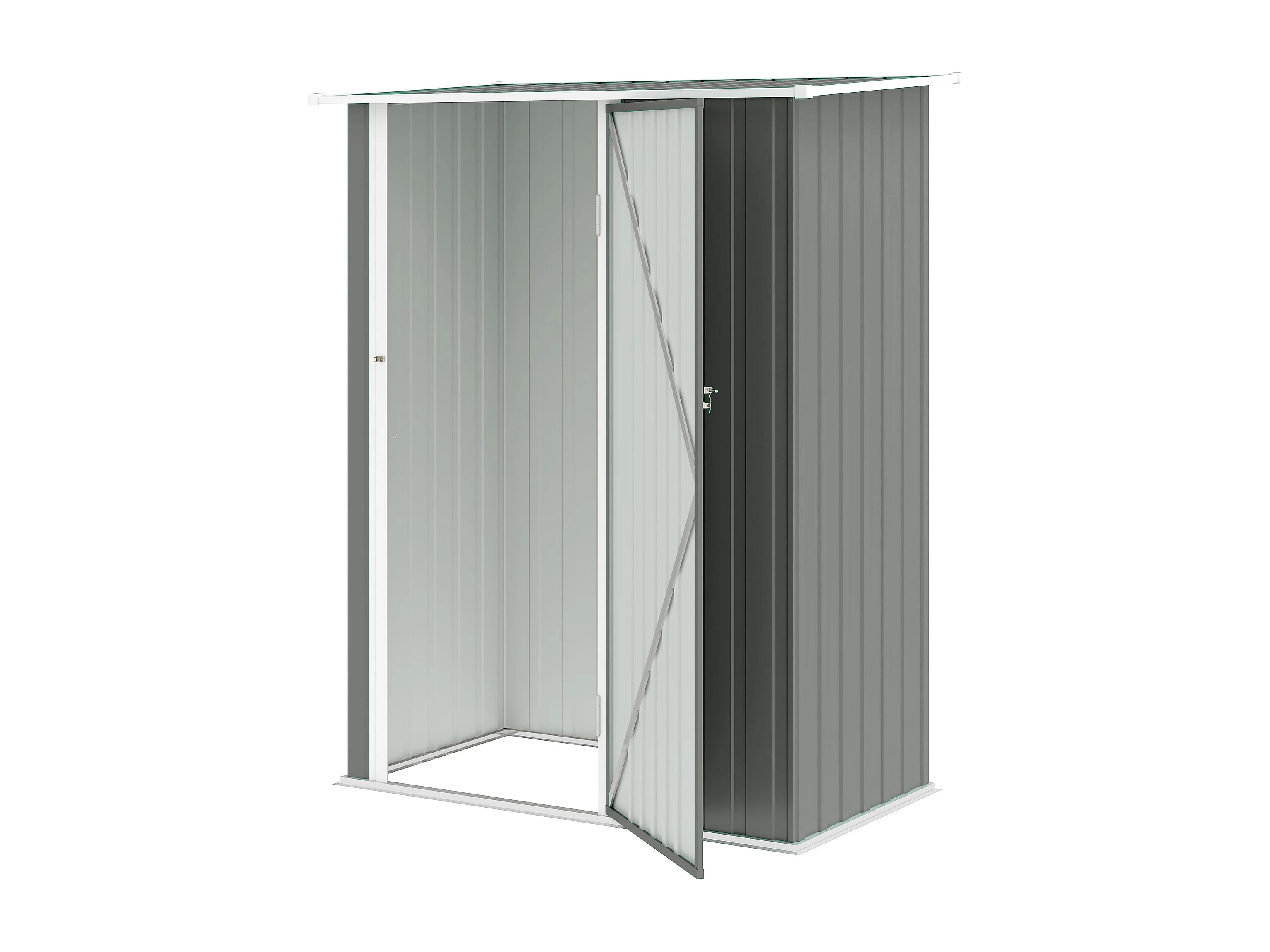 Capanno attrezzi in metallo con tetto inclinato grigio chiaro