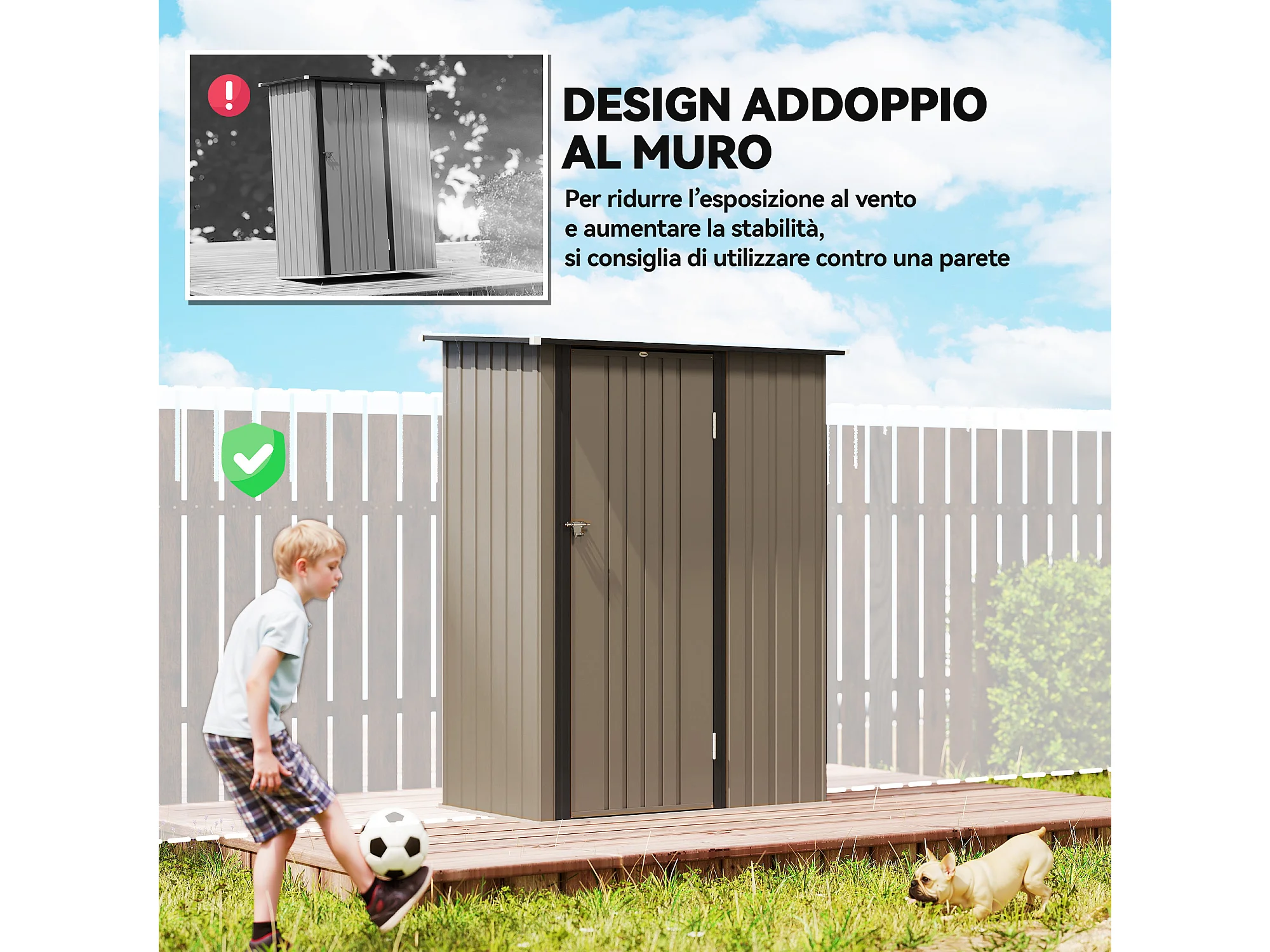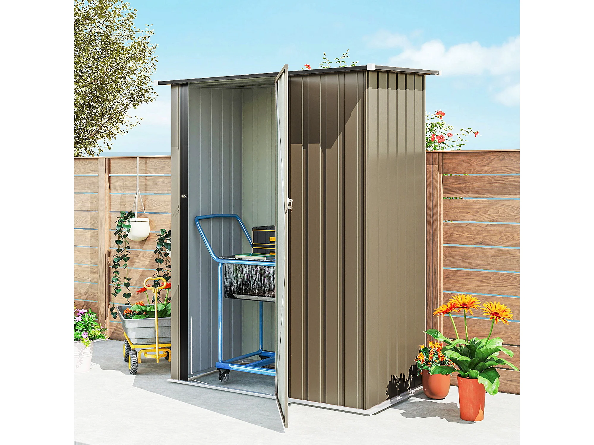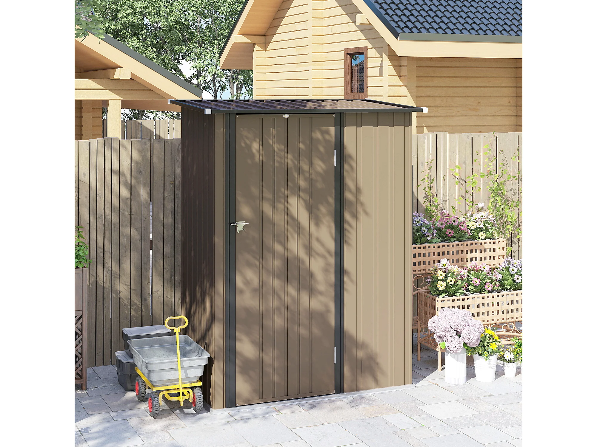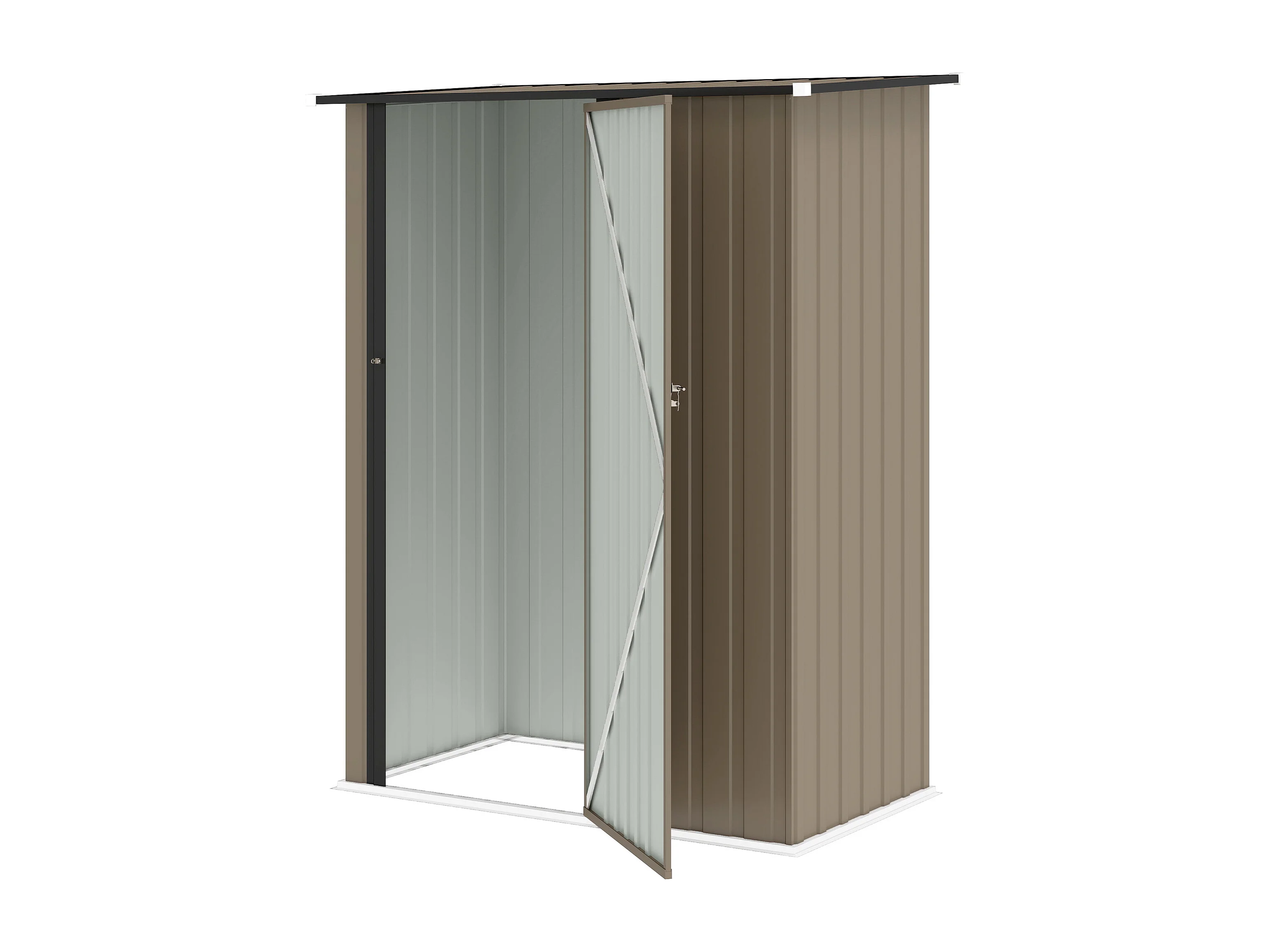 Capanno attrezzi in metallo con tetto inclinato marrone