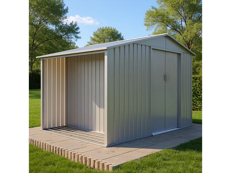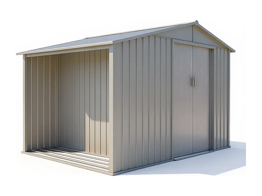 Casetta da giardino in metallo con portalegna integrato – Effetto Legno Invecchiato - 5,3 m²