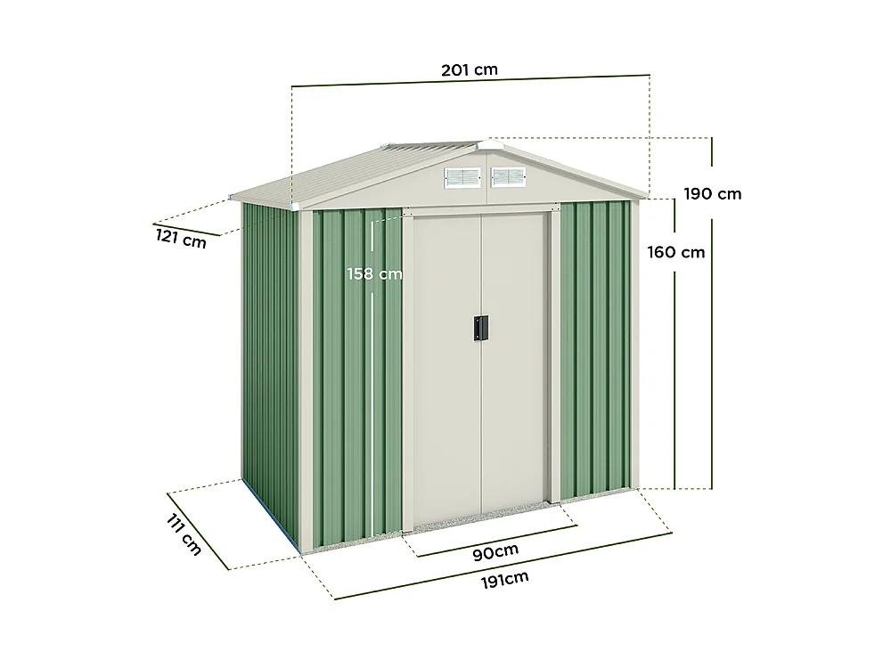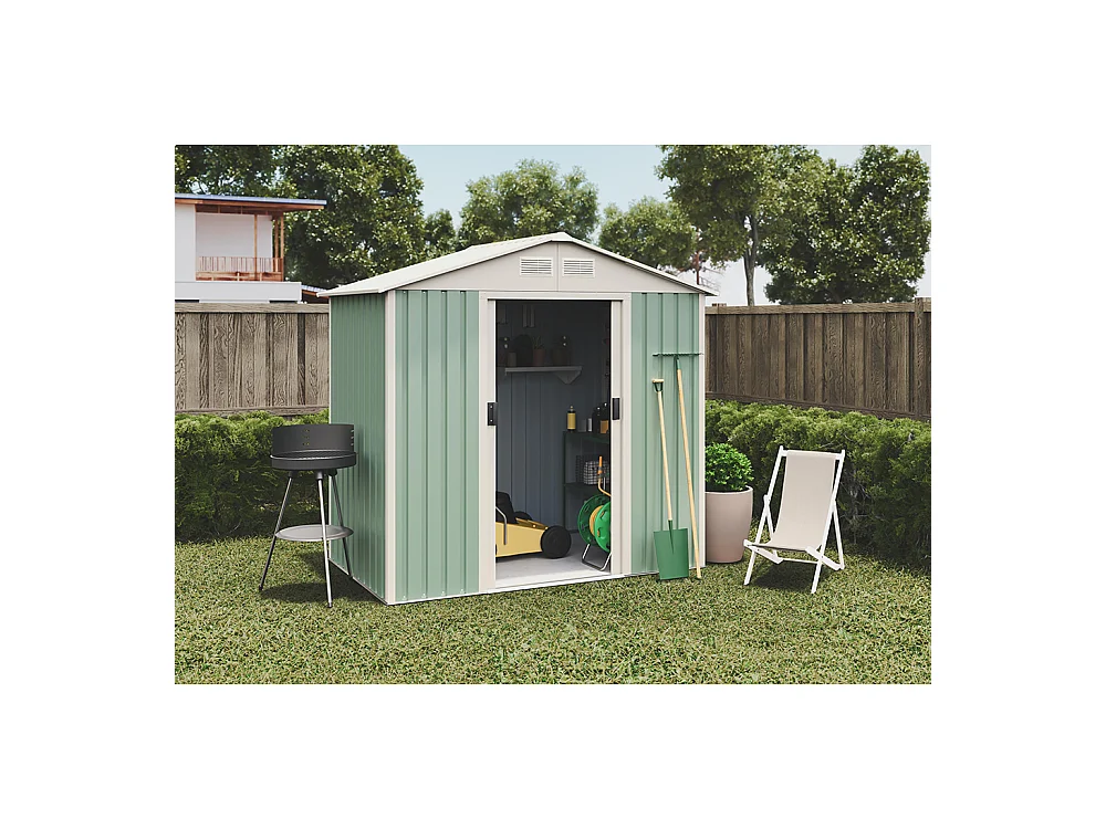 Casetta da giardino con tetto inclinato e prese d'aria acciaio verde
