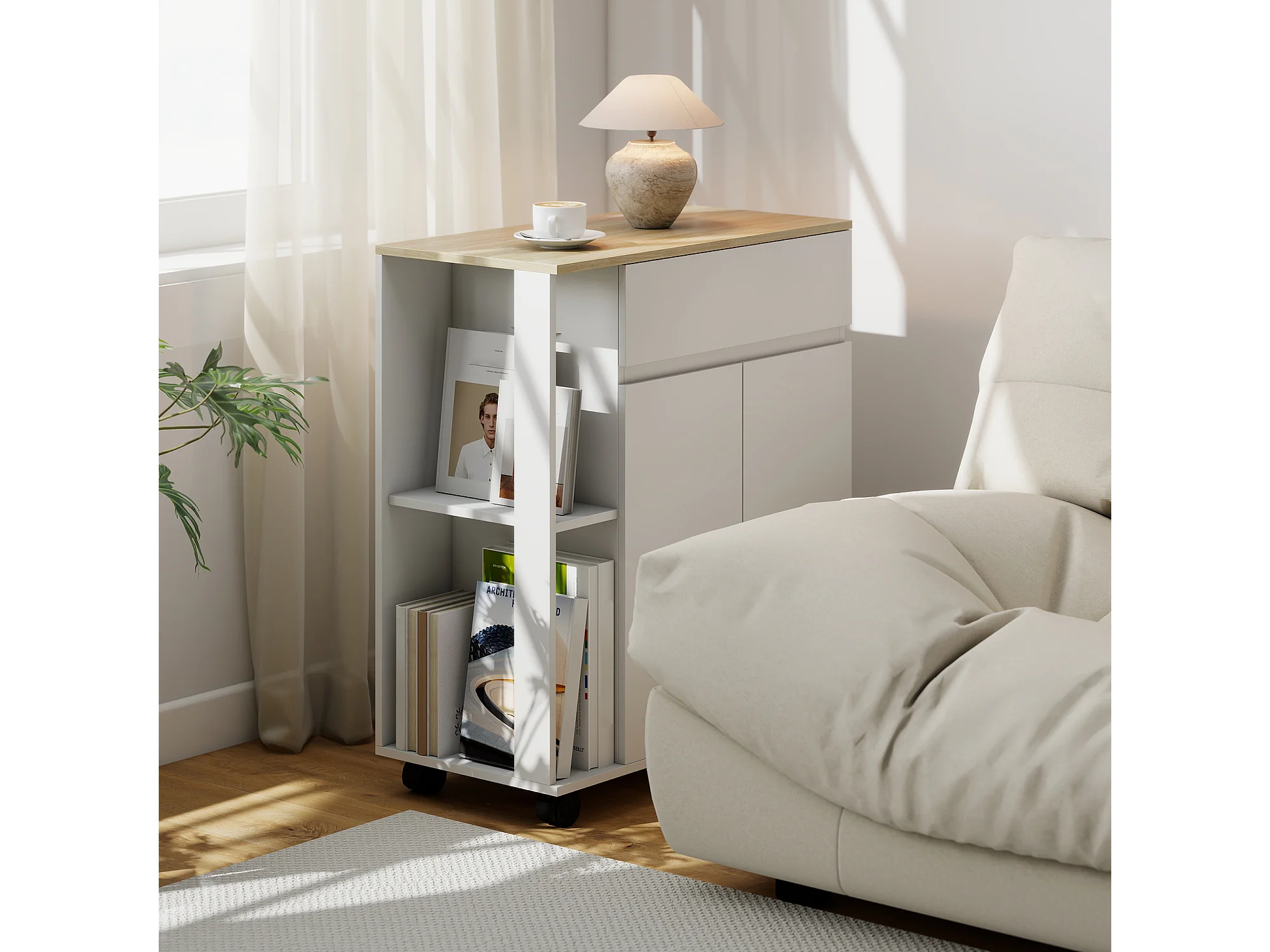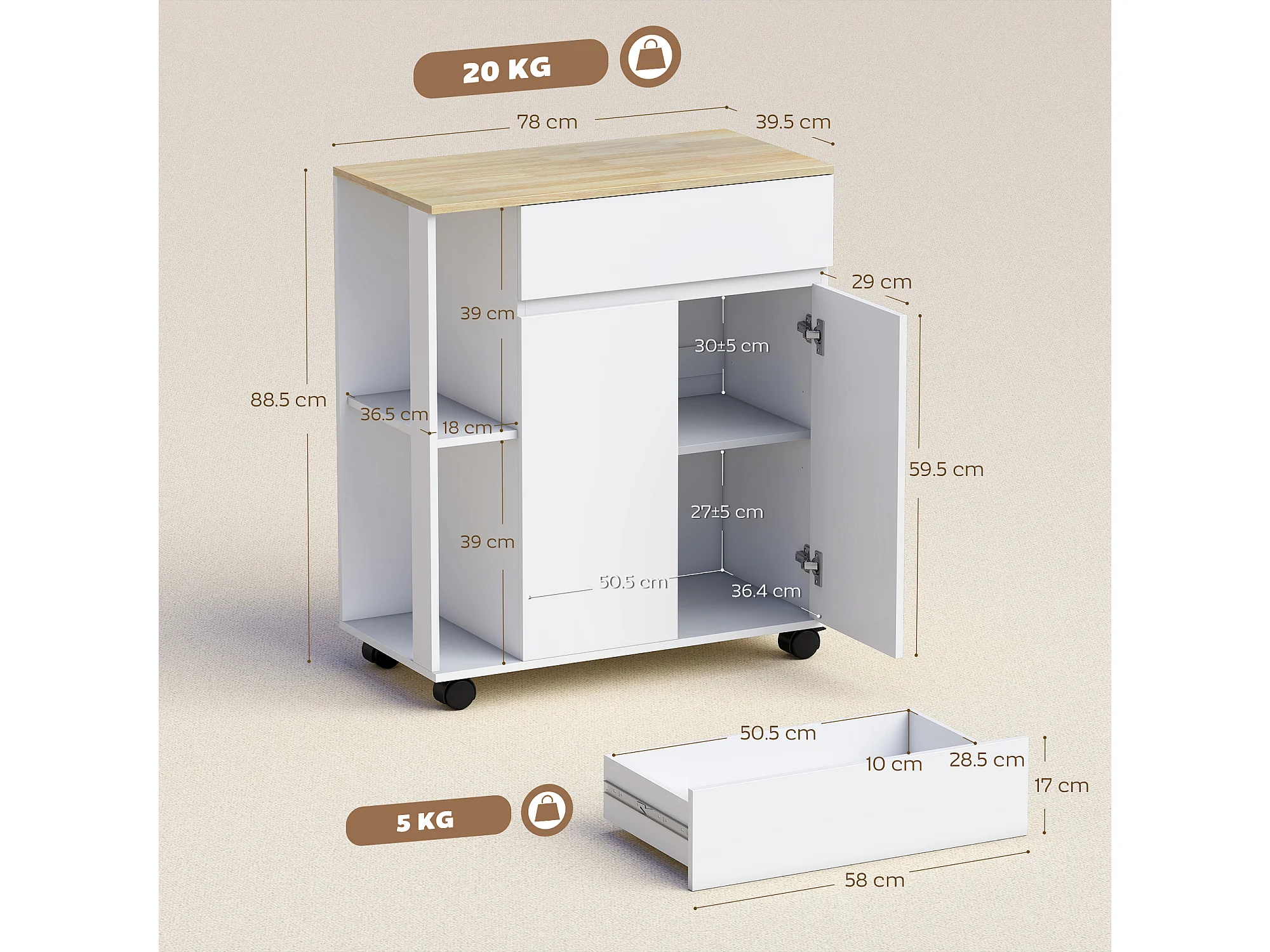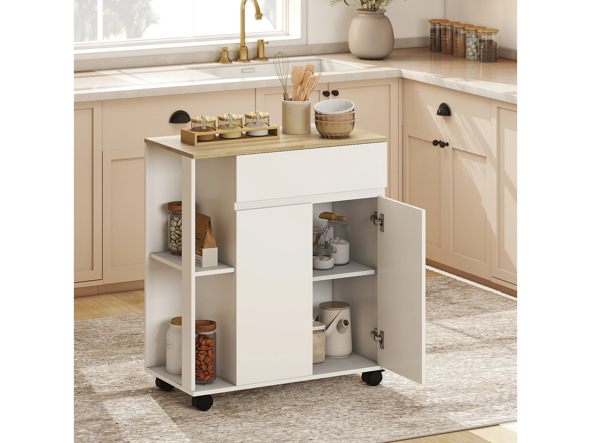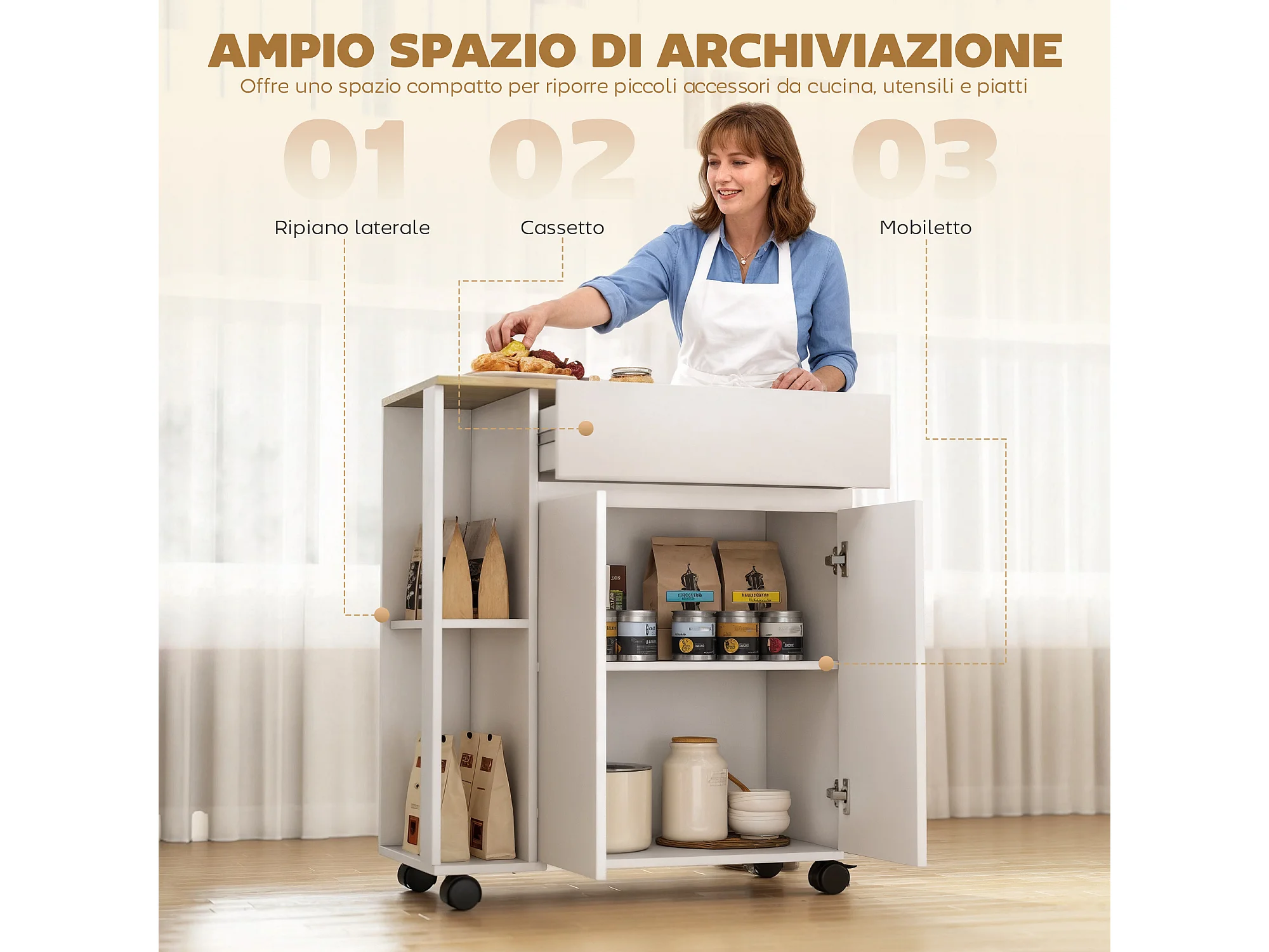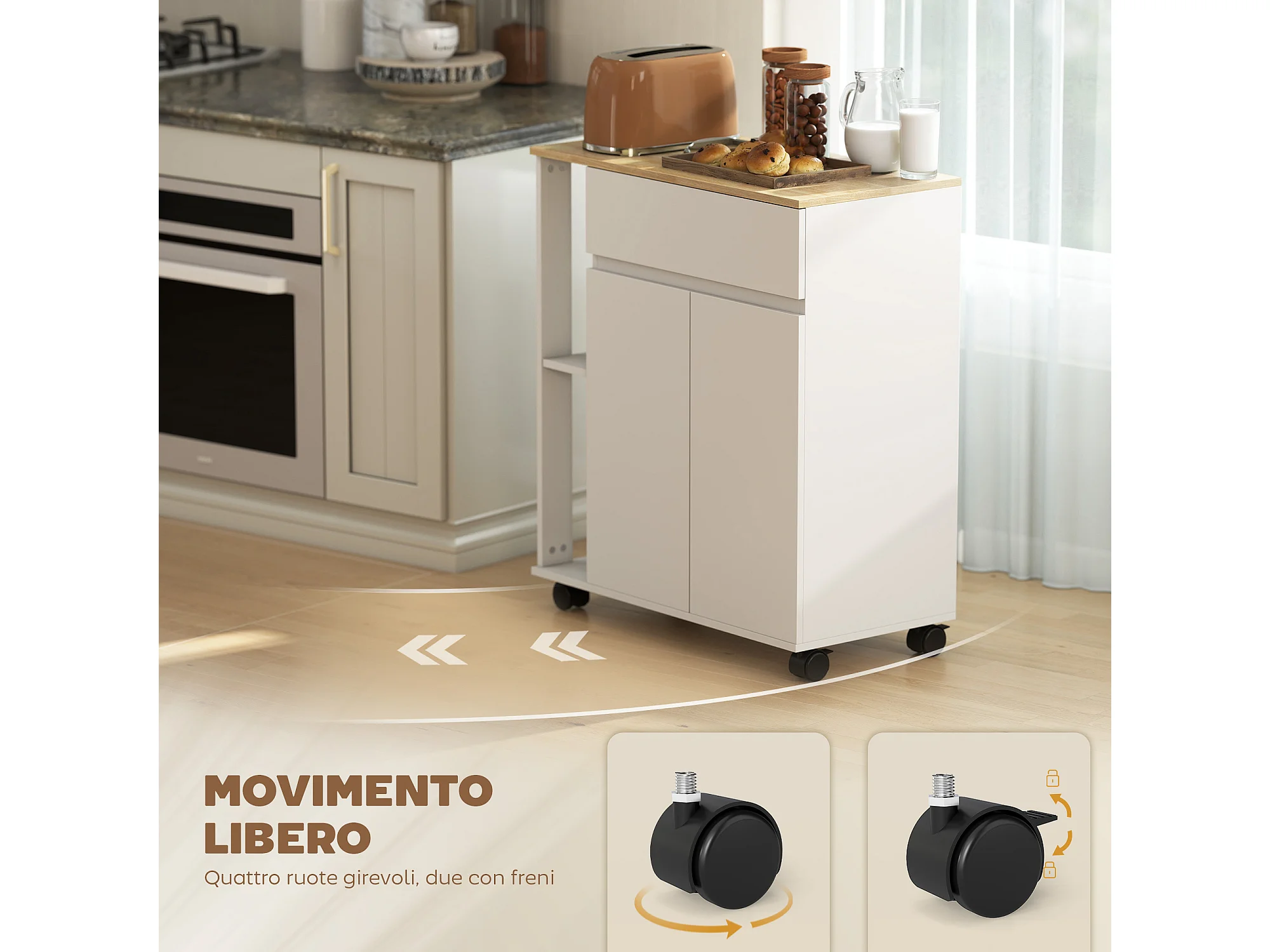 Carrello cucina con cassetto, armadietto e ripiani bianco e rovere