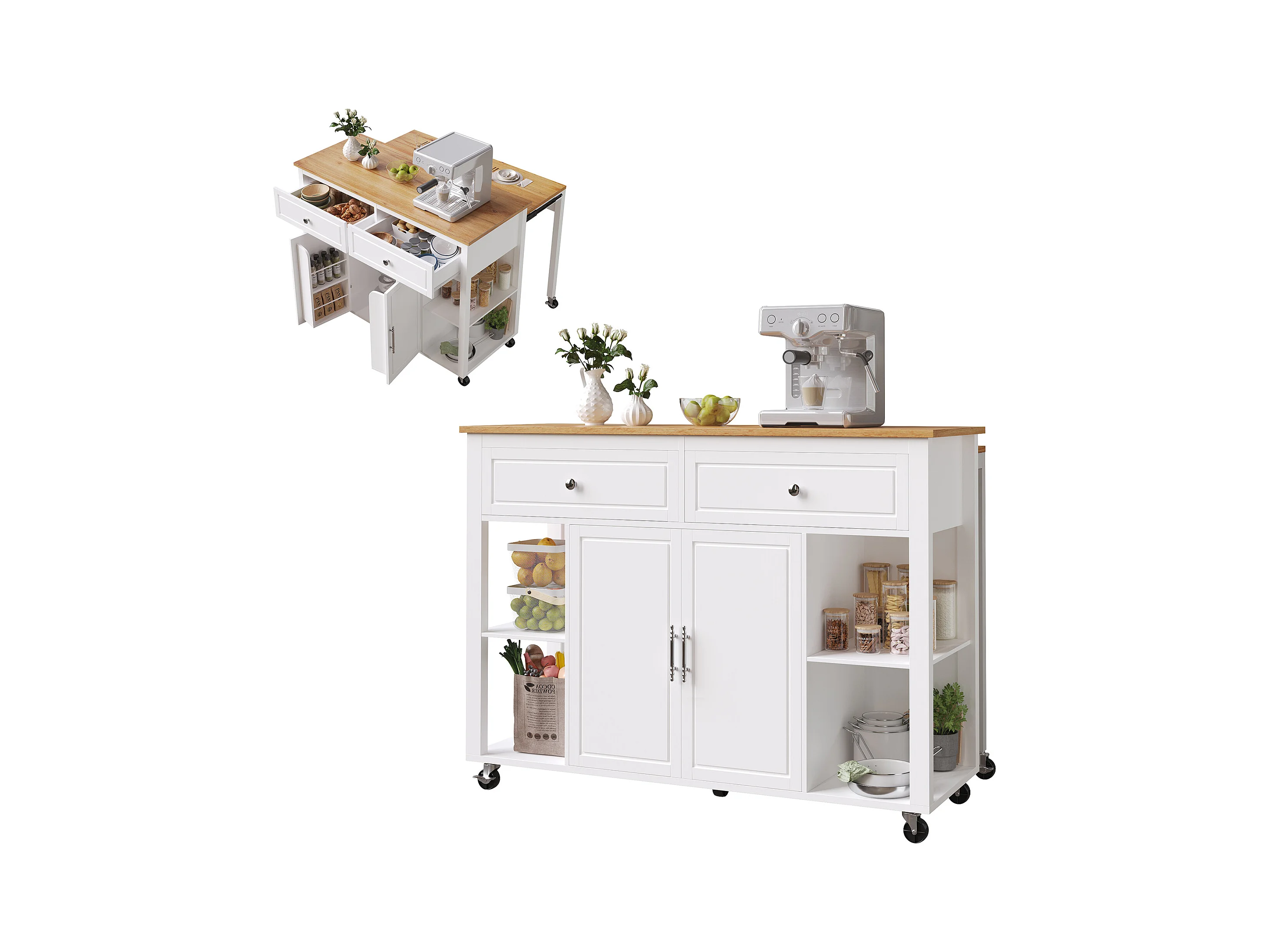 Carrello da cucina bianco con ruote, nicchie, 2 ante e 2 cassetti, piano superiore color naturale