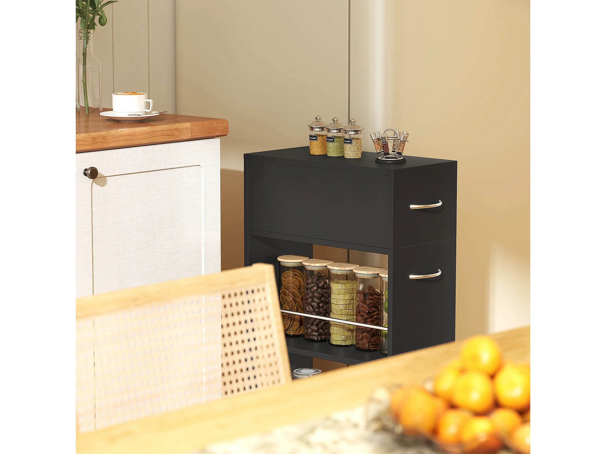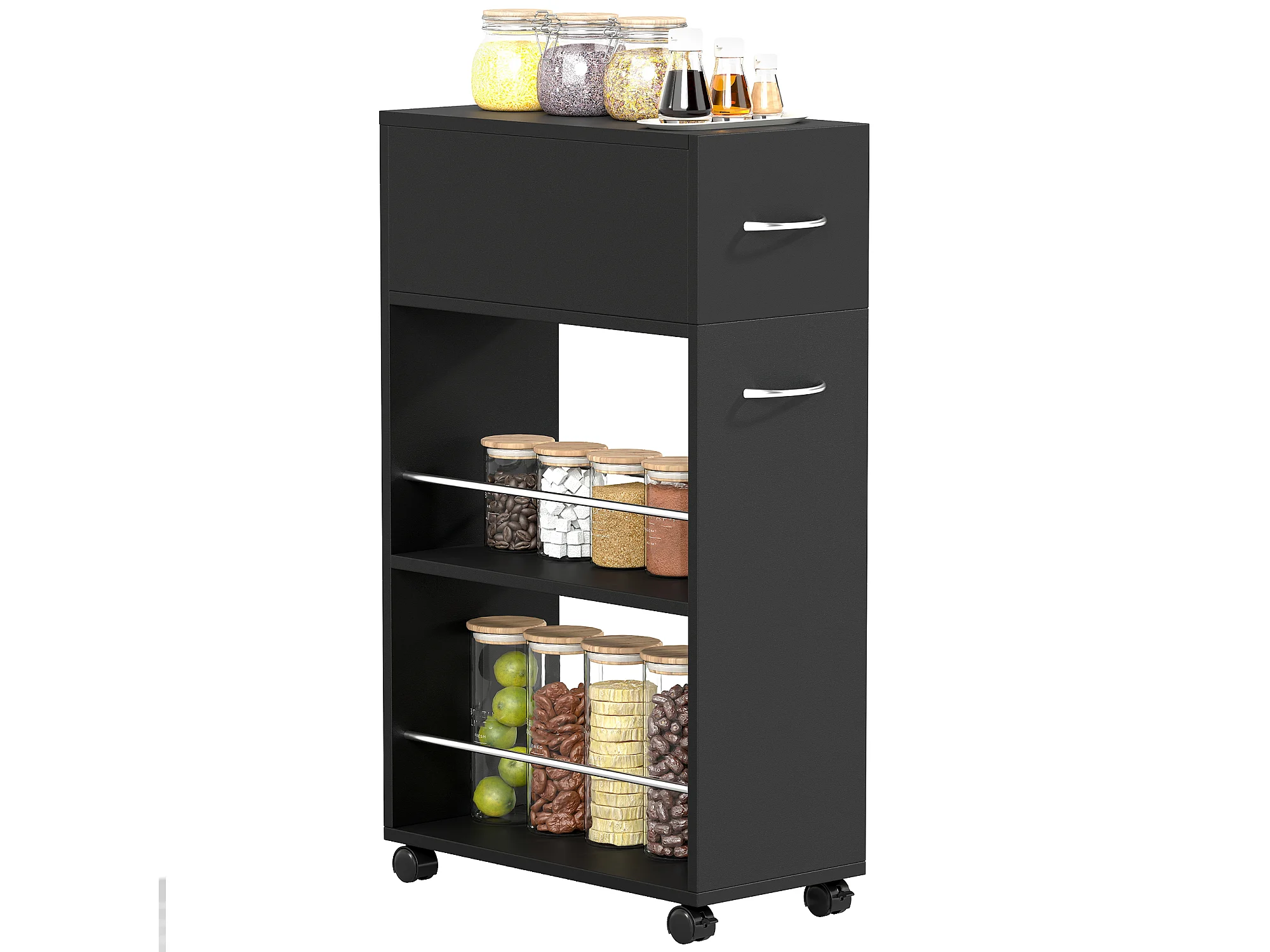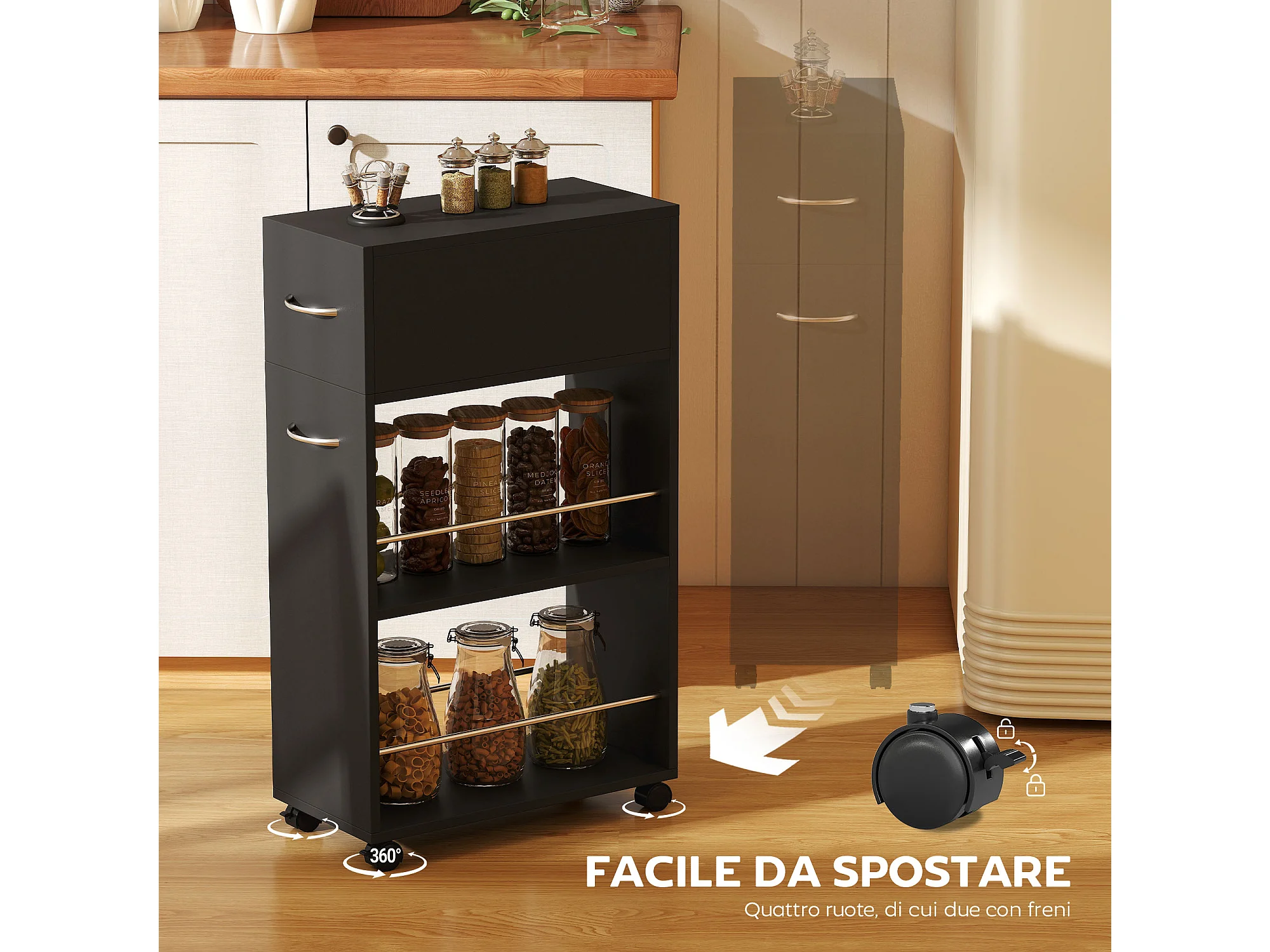 Carrello da cucina in legno con cassetto armadietto ruote nero