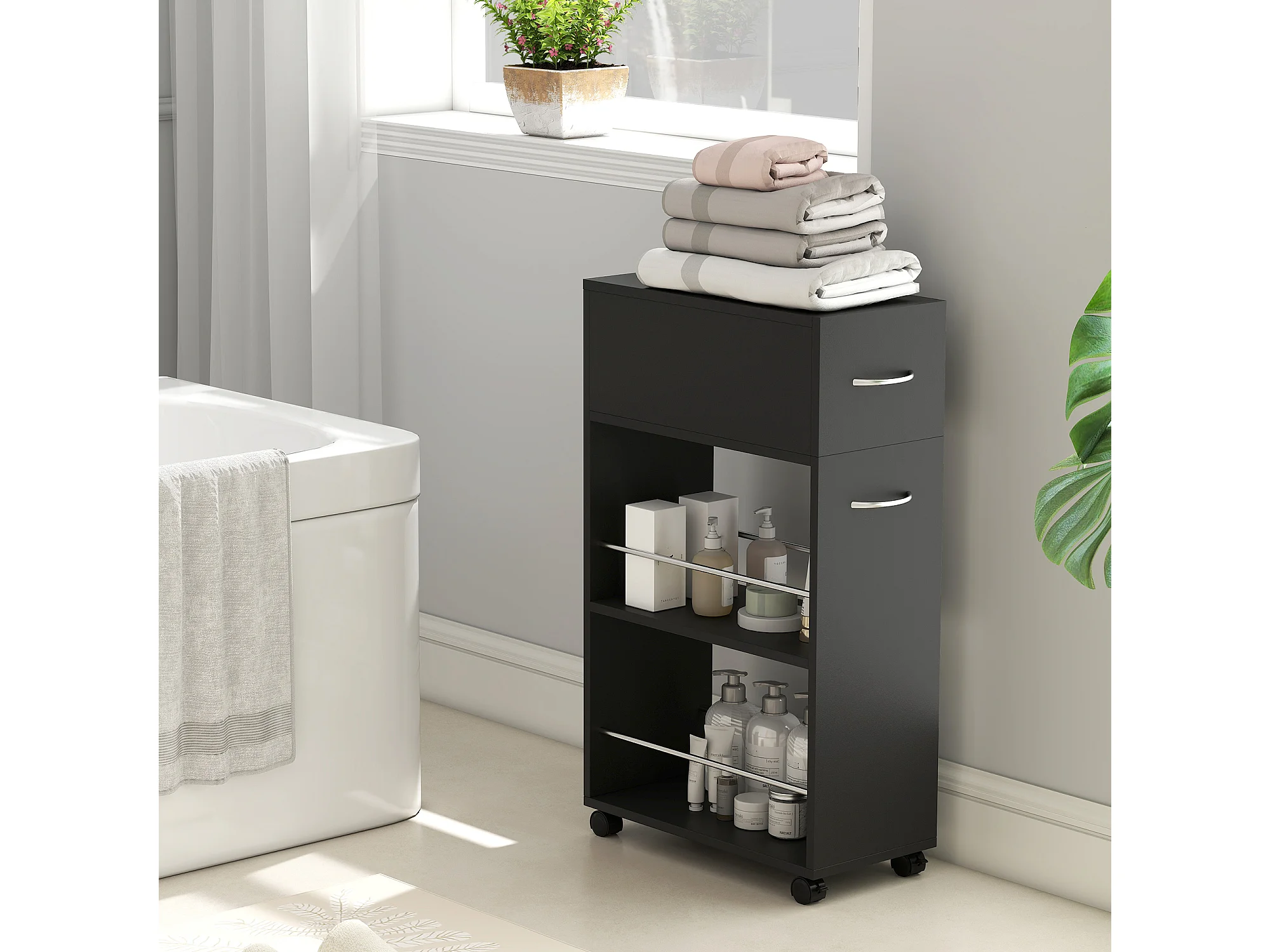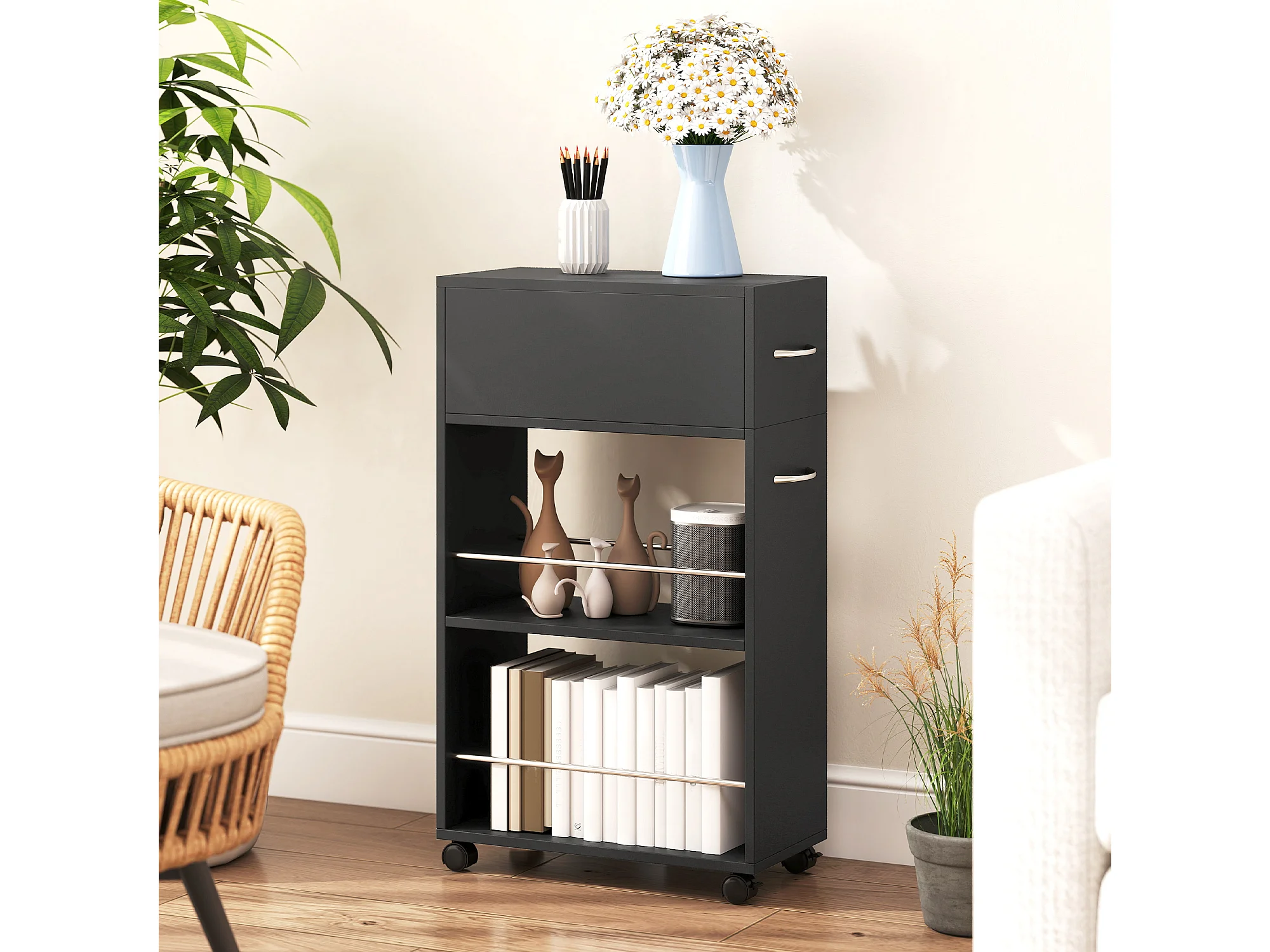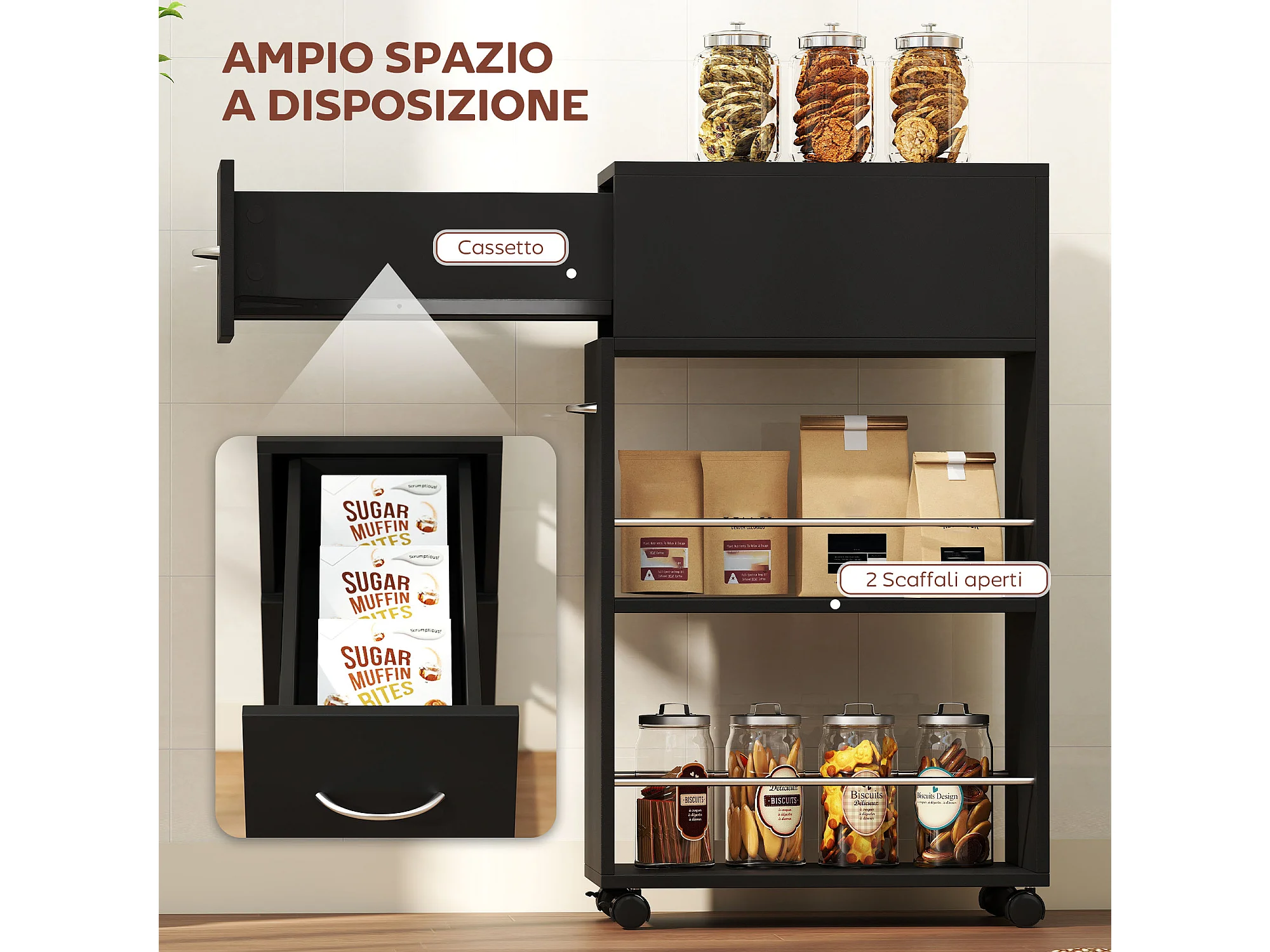 Carrello da cucina in legno con cassetto armadietto ruote nero