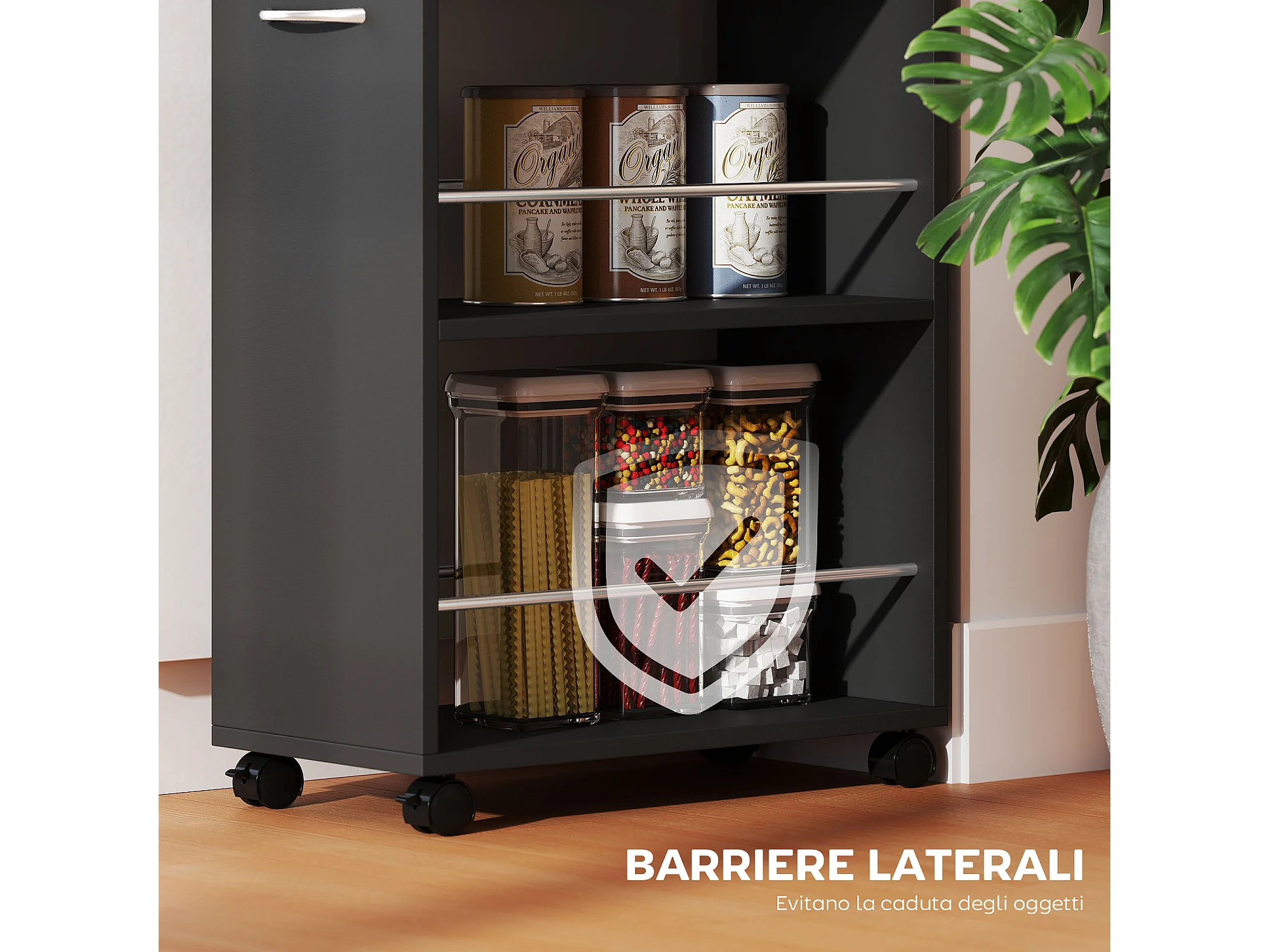 Carrello da cucina con 2 ripiani aperti, cassetto parapetti e ruote a freno