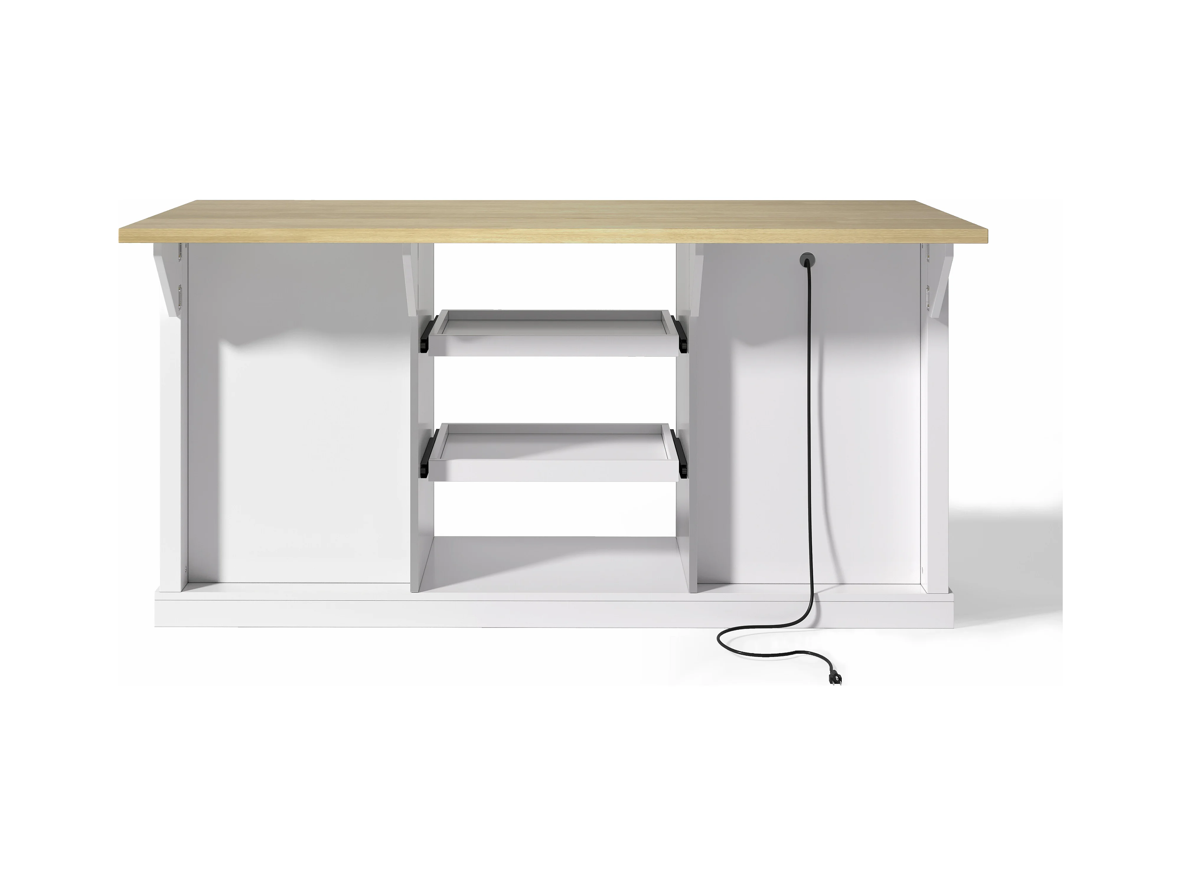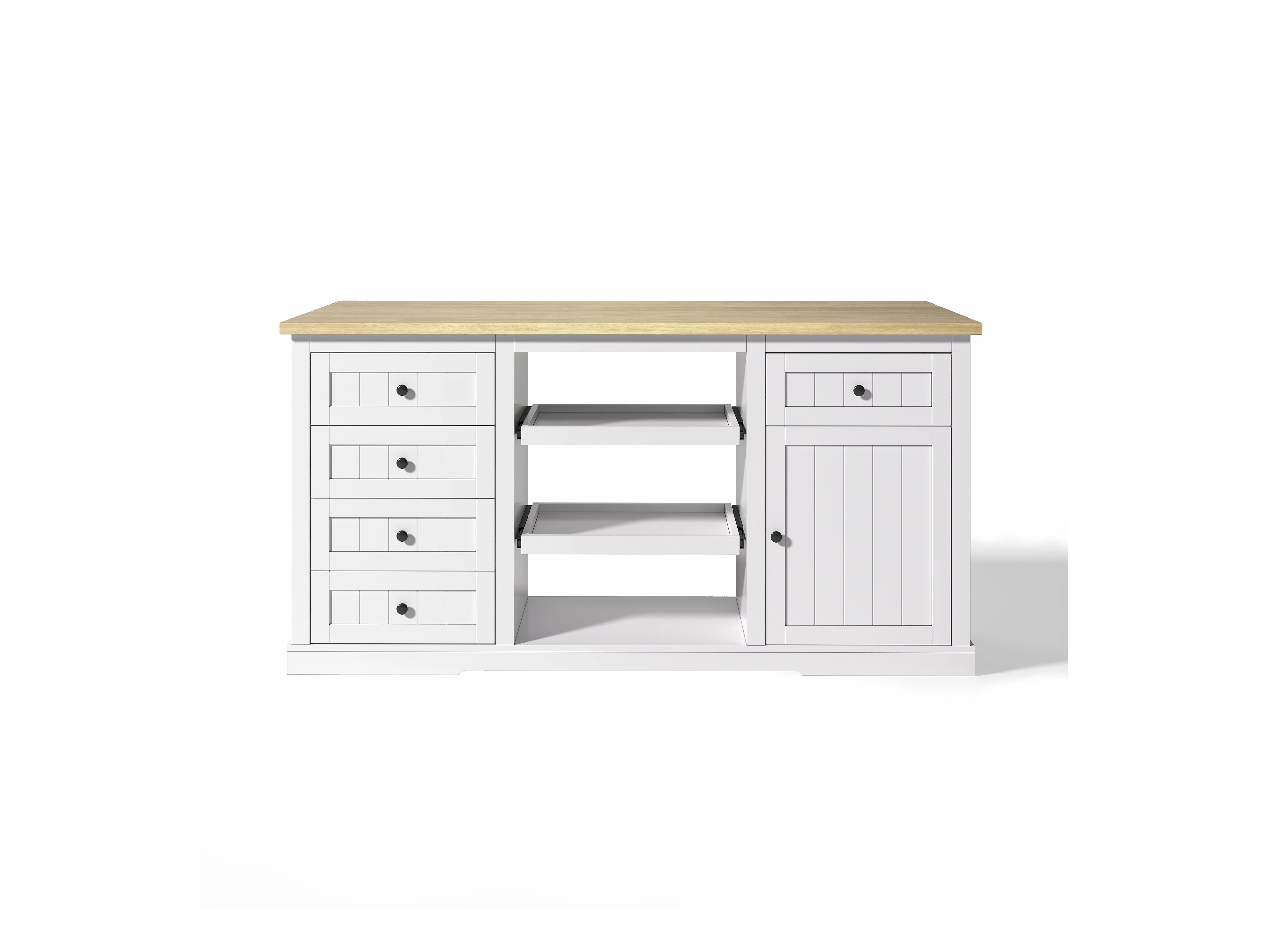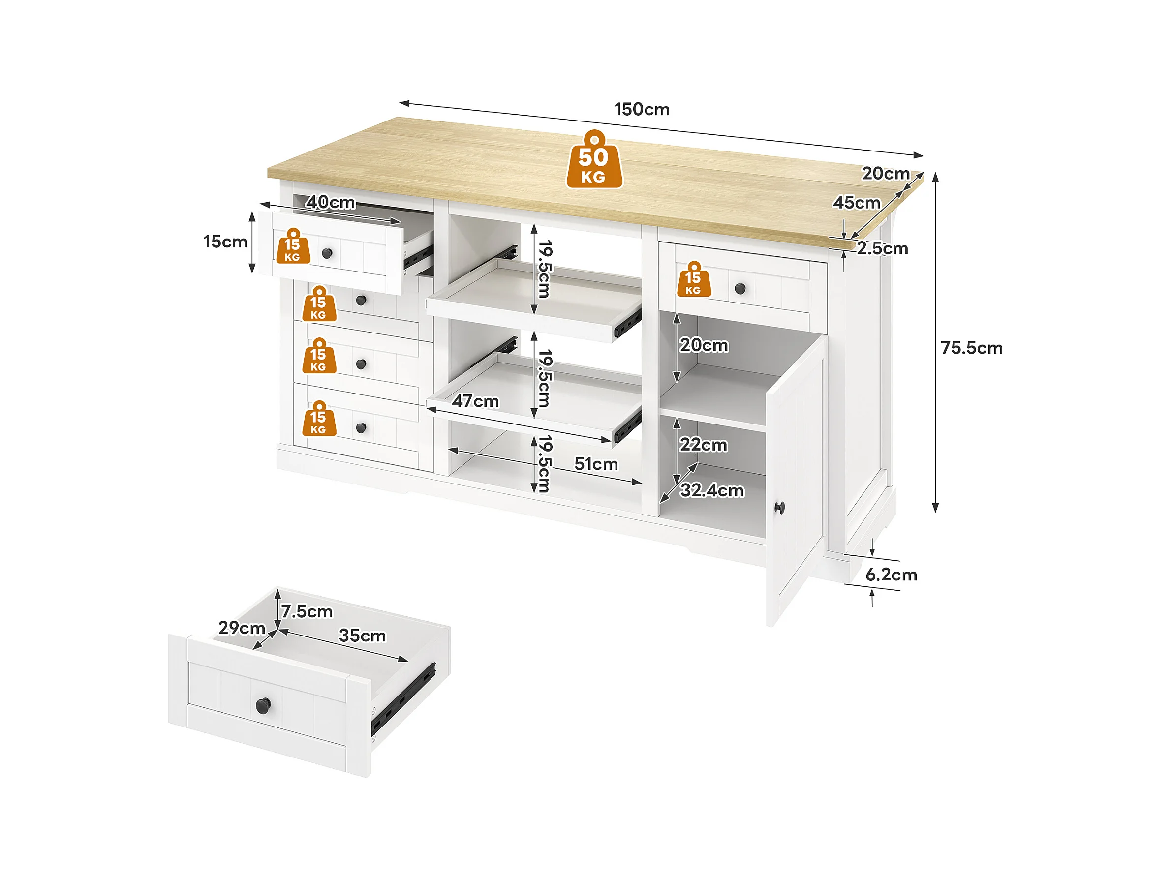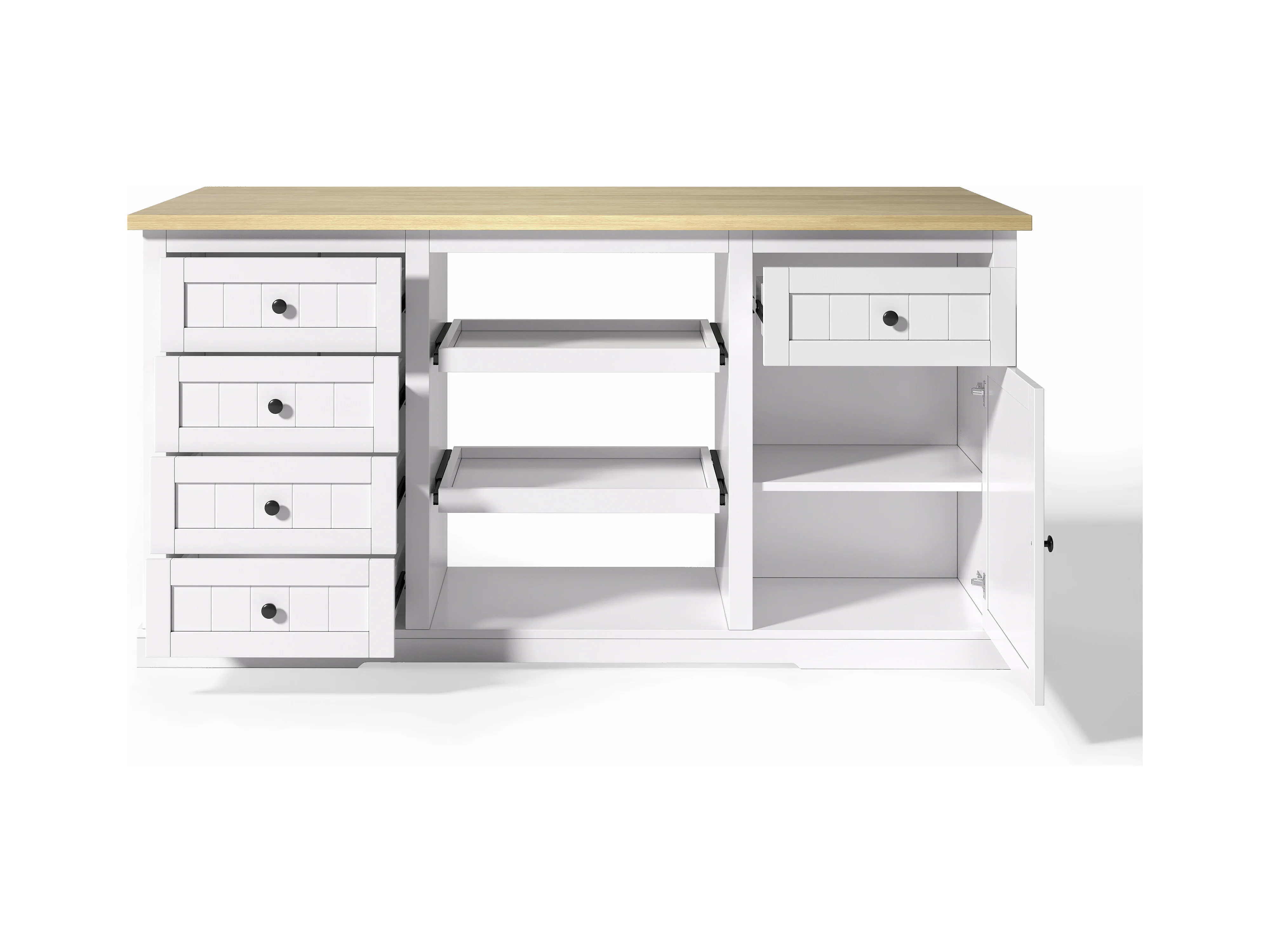 Carrello da cucina con 5 cassetti, 1 anta, 2 ripiani scorrevoli e presa elettrica, bianco e naturale