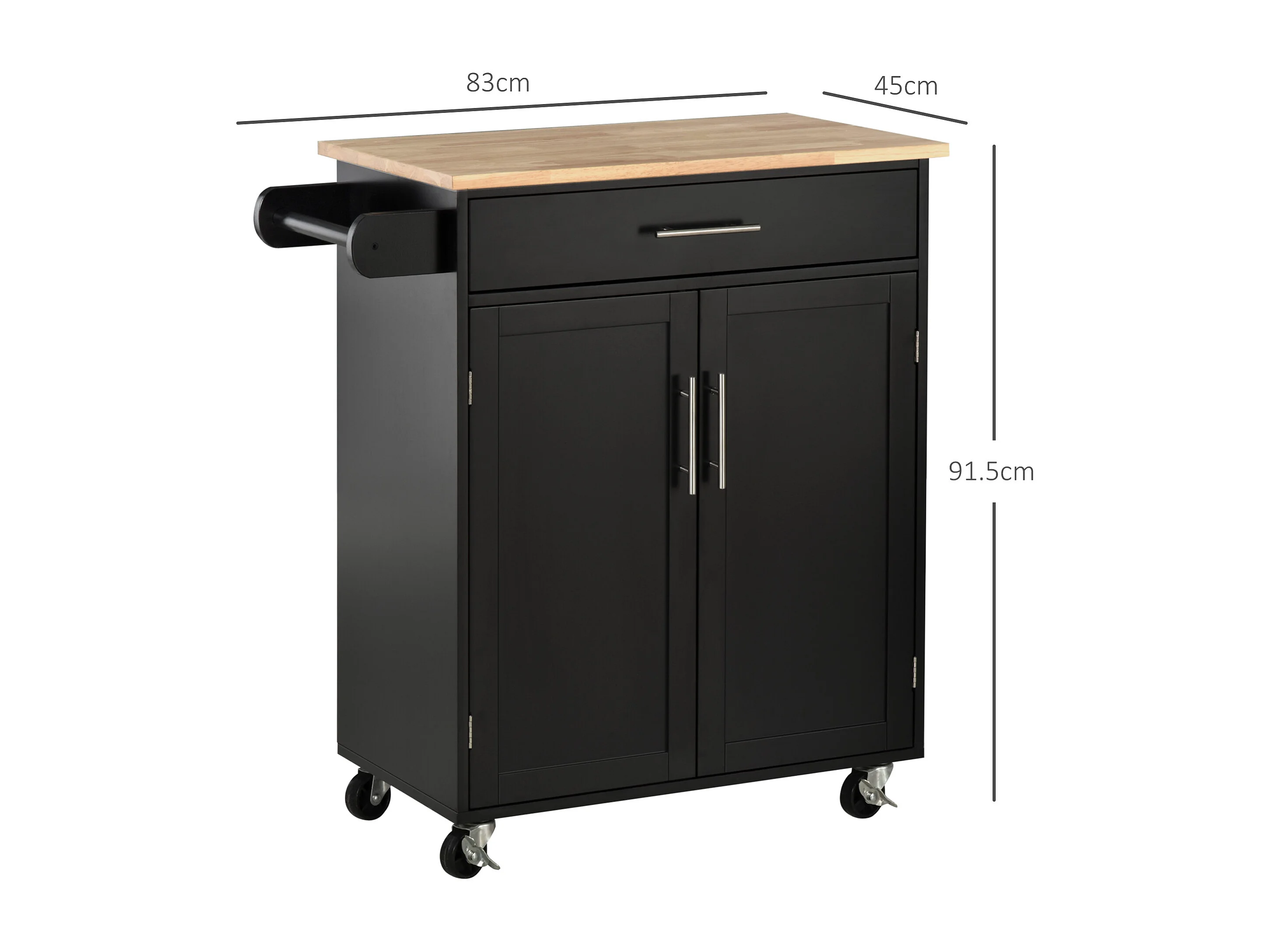 Carrello da cucina nero con 2 cassetti e 2 ante, piano in legno - per soggiorno e cucina