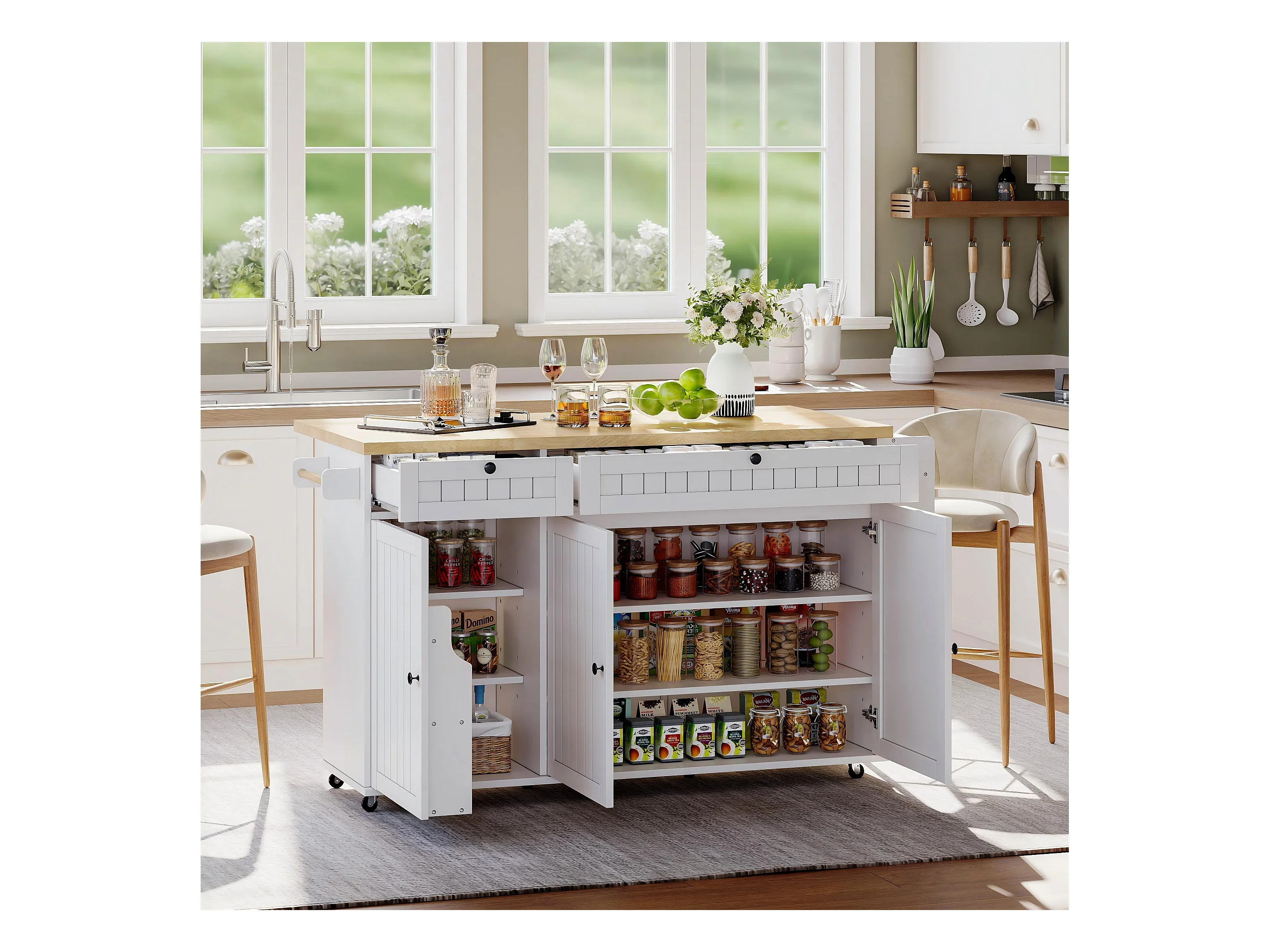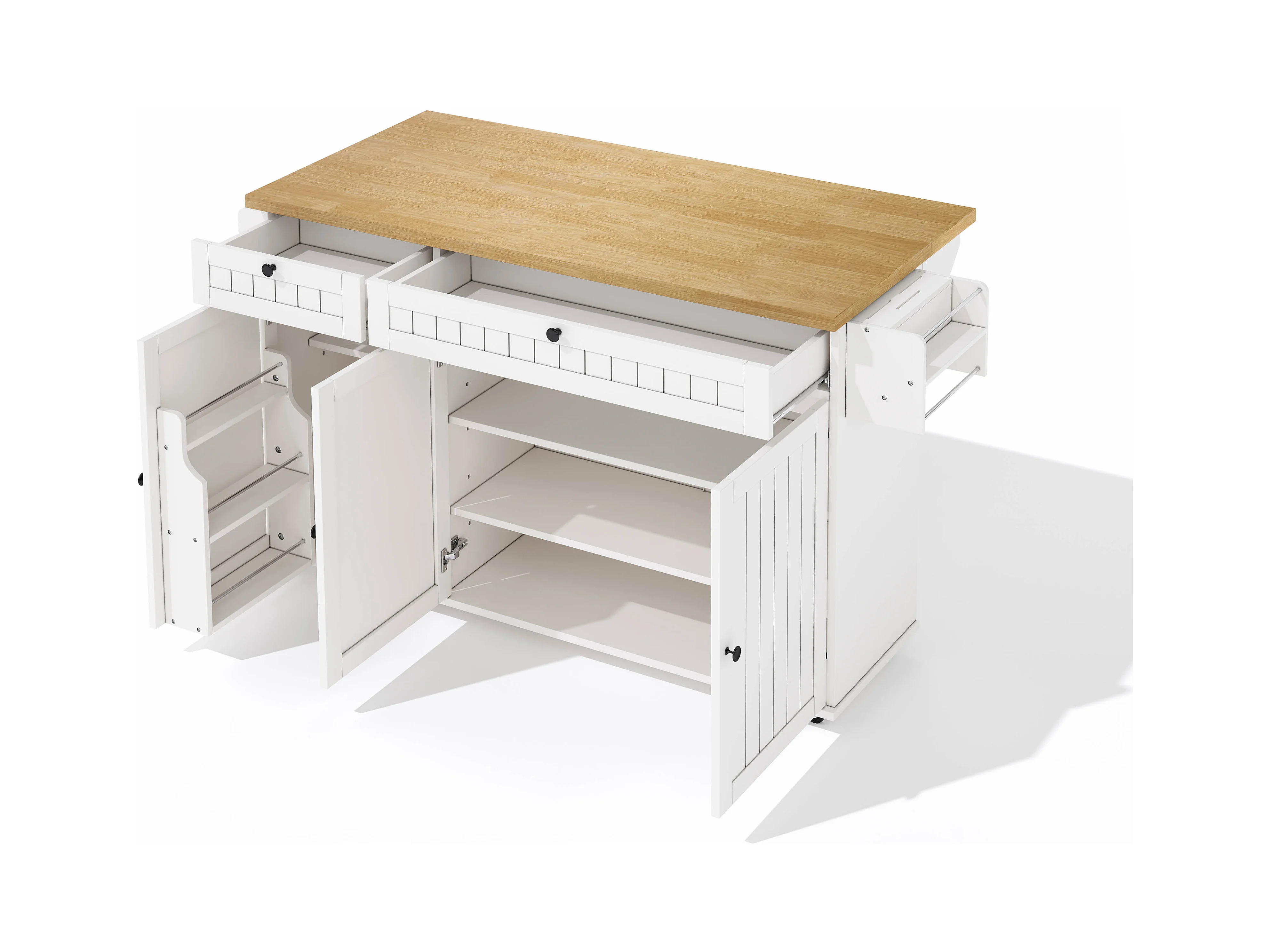 Carrello da cucina con piano ribaltabile, 2 cassetti e 3 ante, 6 ruote bloccabili, bianco