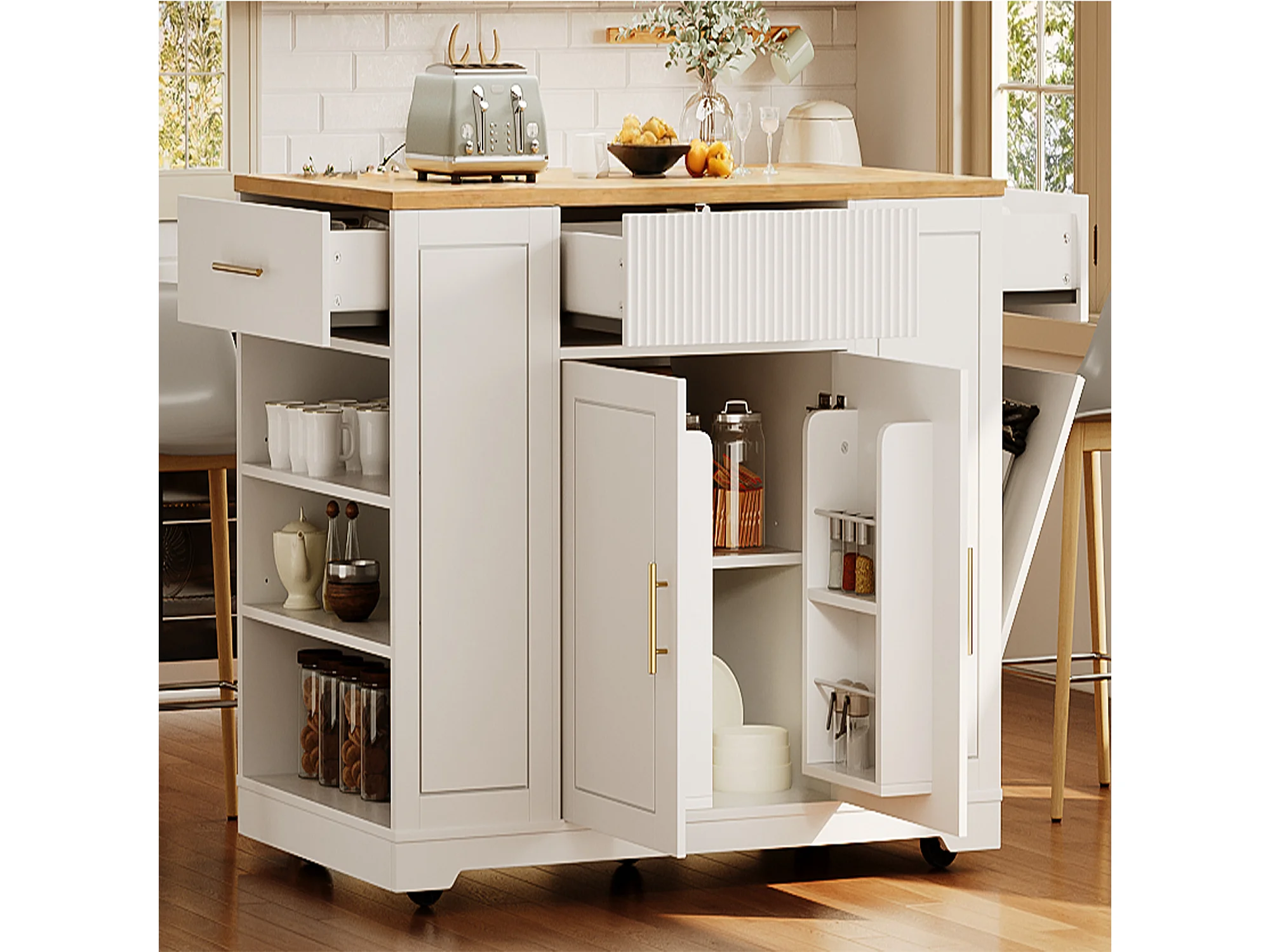 Carrello da cucina con ruote, Carrello da cucina bianco con 2 ante e 3 cassetti, ampi scomparti