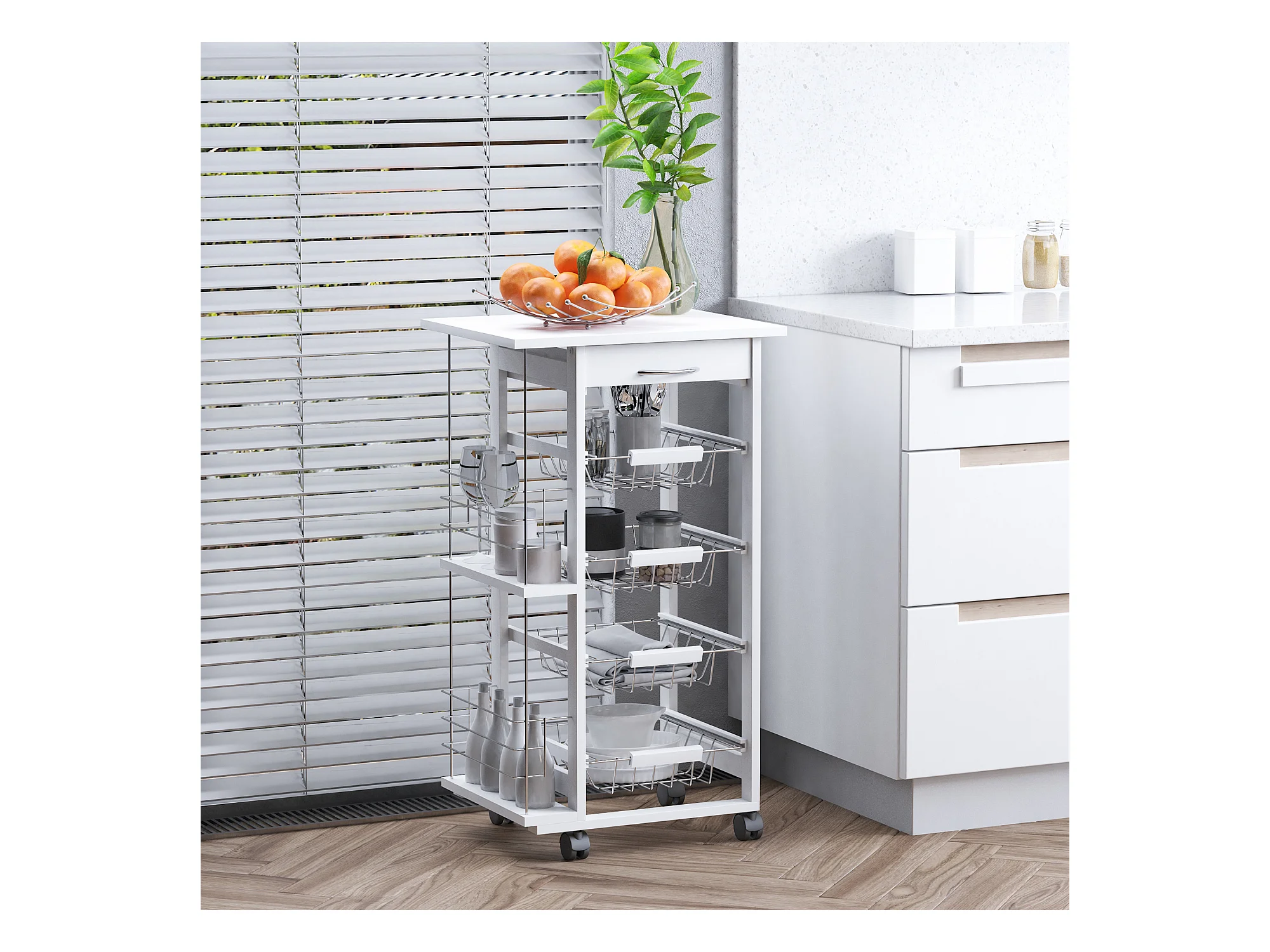 Carrello da cucina in legno bianco cassetto 4 cestelli e ruote