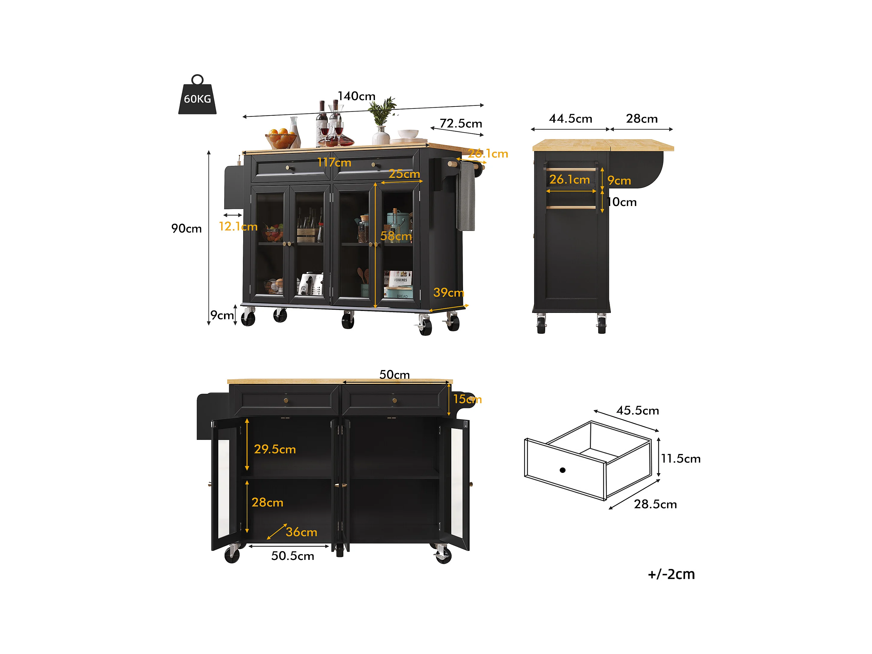 Carrello da cucina su ruote, 2 cassetti e 4 ante in vetro, piano estensibile, nero + naturale