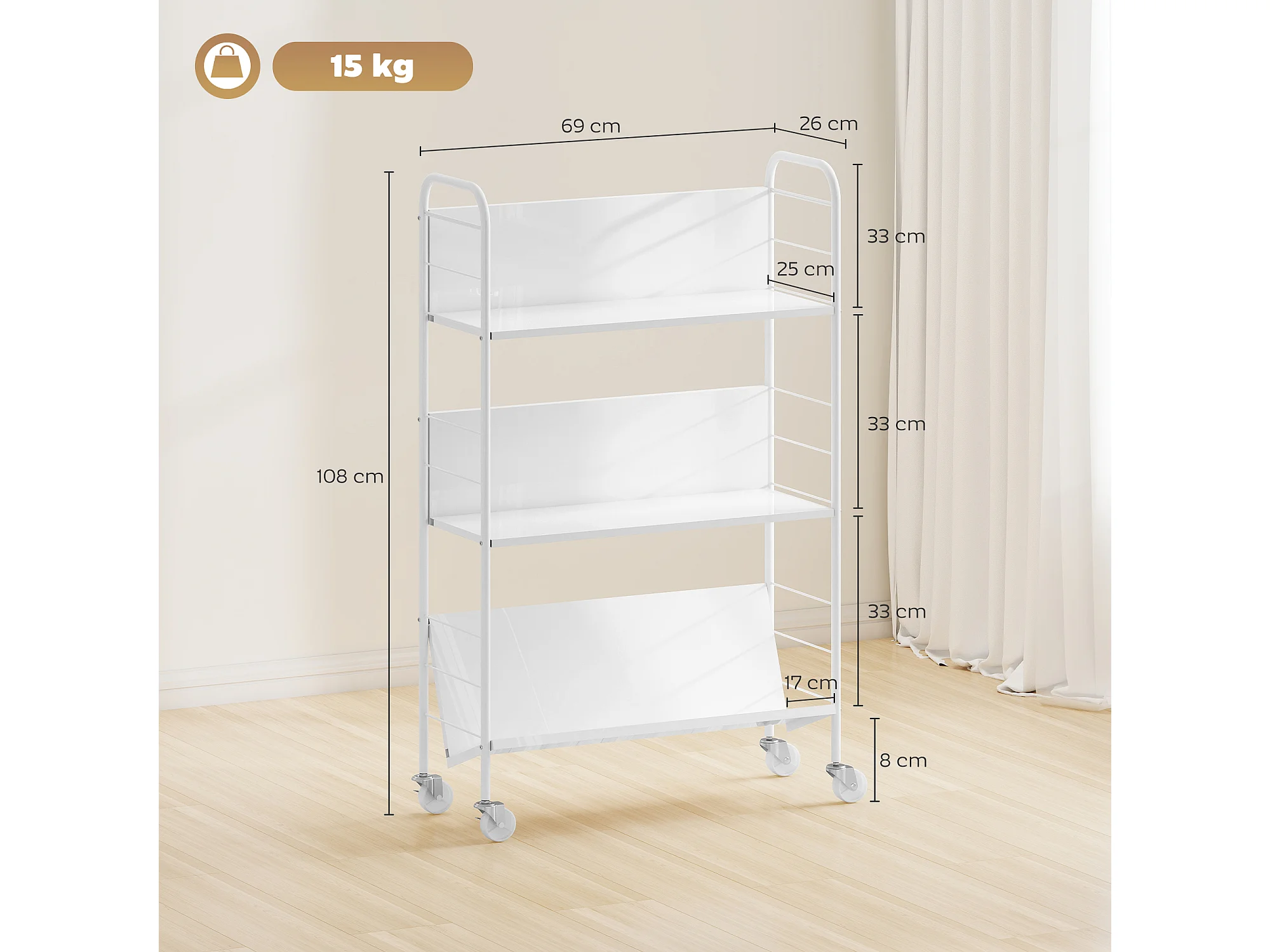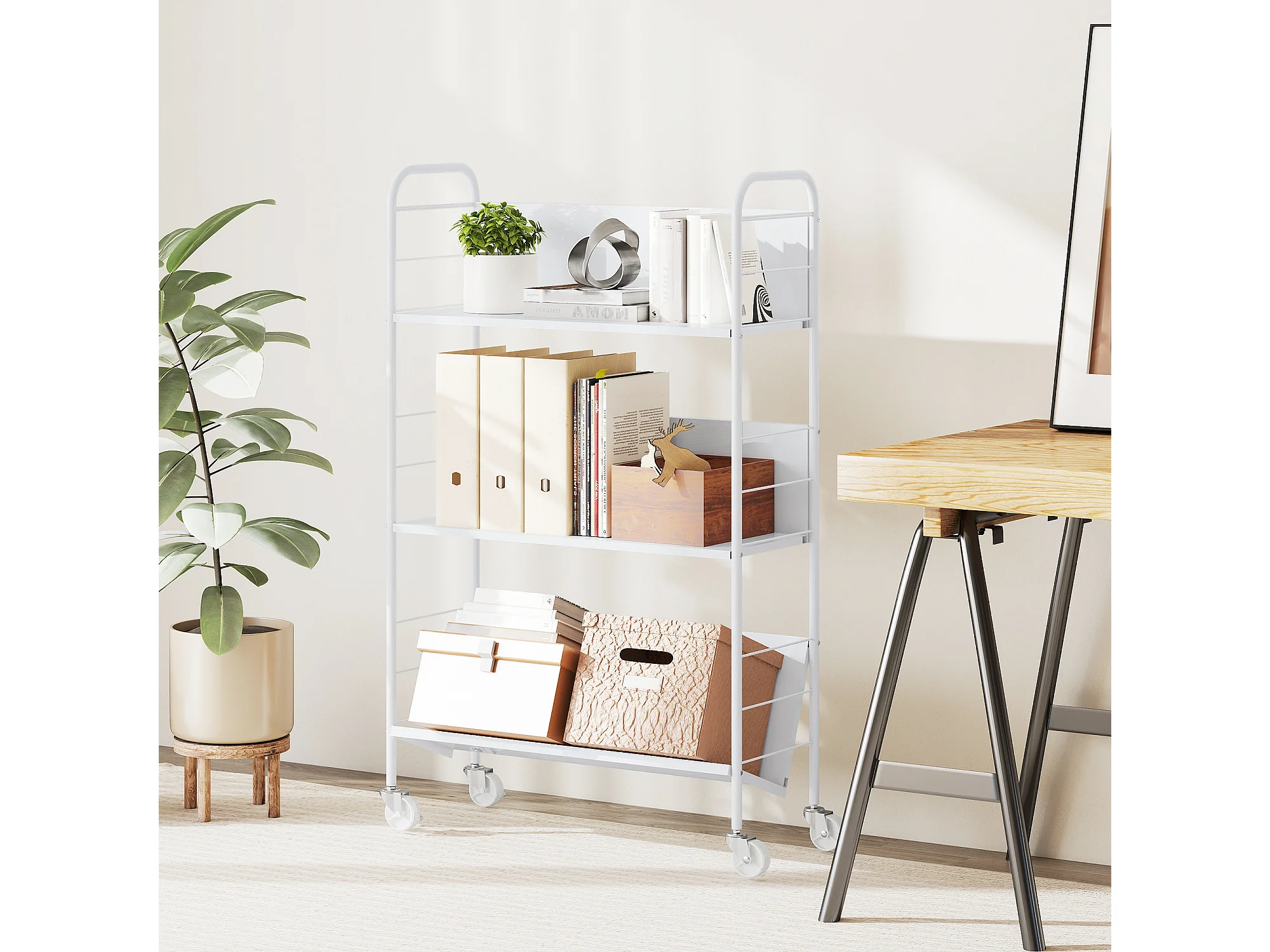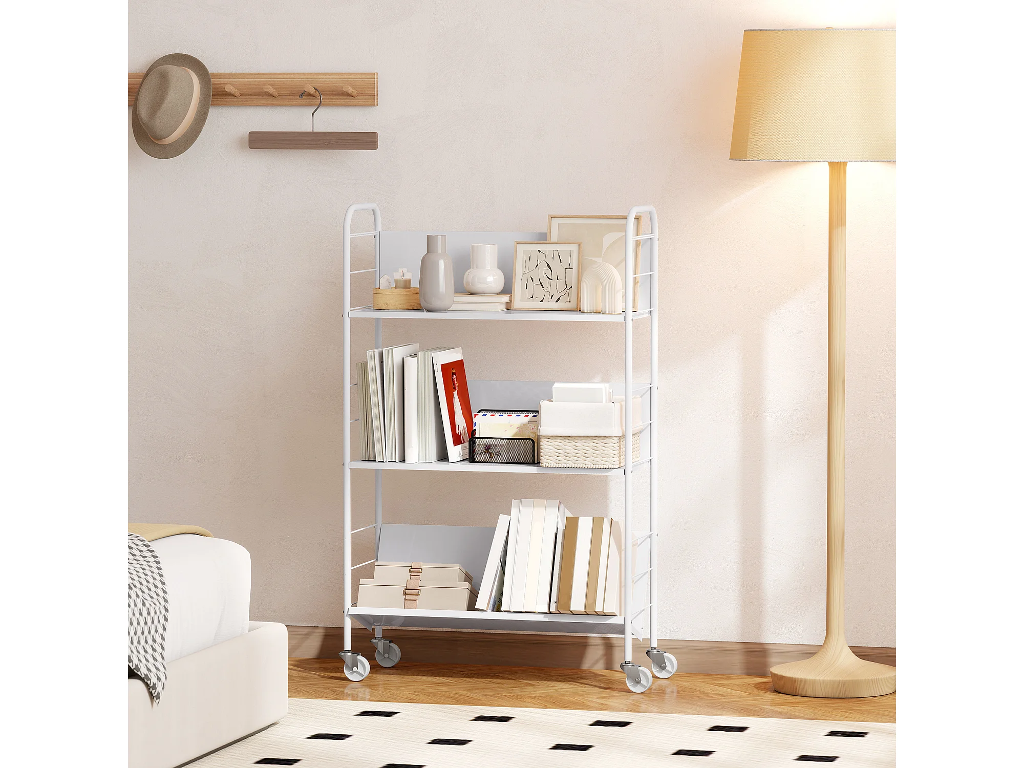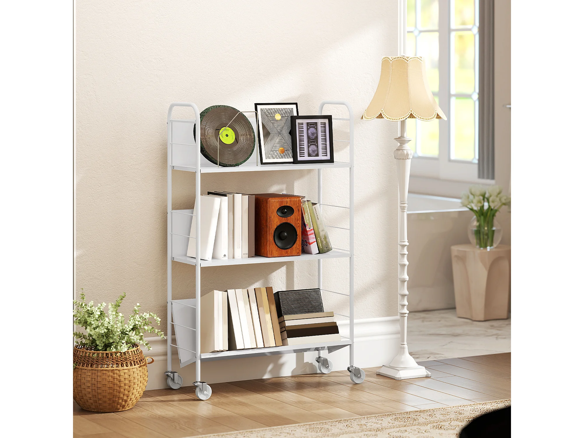 Carrello portalibri con ruote girevoli e 3 ripiani bianco