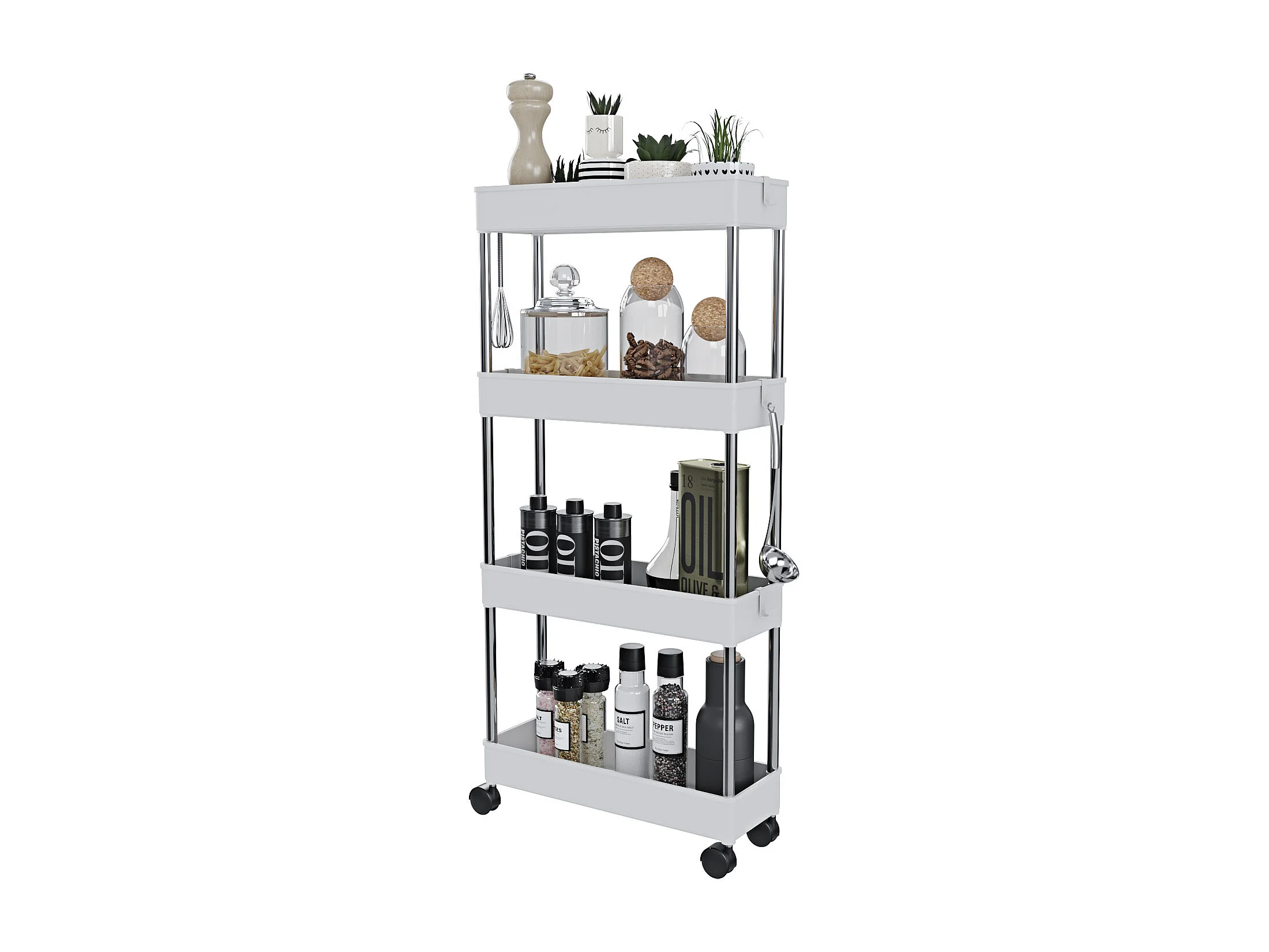 Carrello Portaoggetti 4 Ripiani Mobile Salvaspazio In Plastica Con Ruote Struttura In Acciaio Per Spazi Ridotti Cucina Bagno Salotto Studio 40 x 13 x 85 Cm (Bianco)