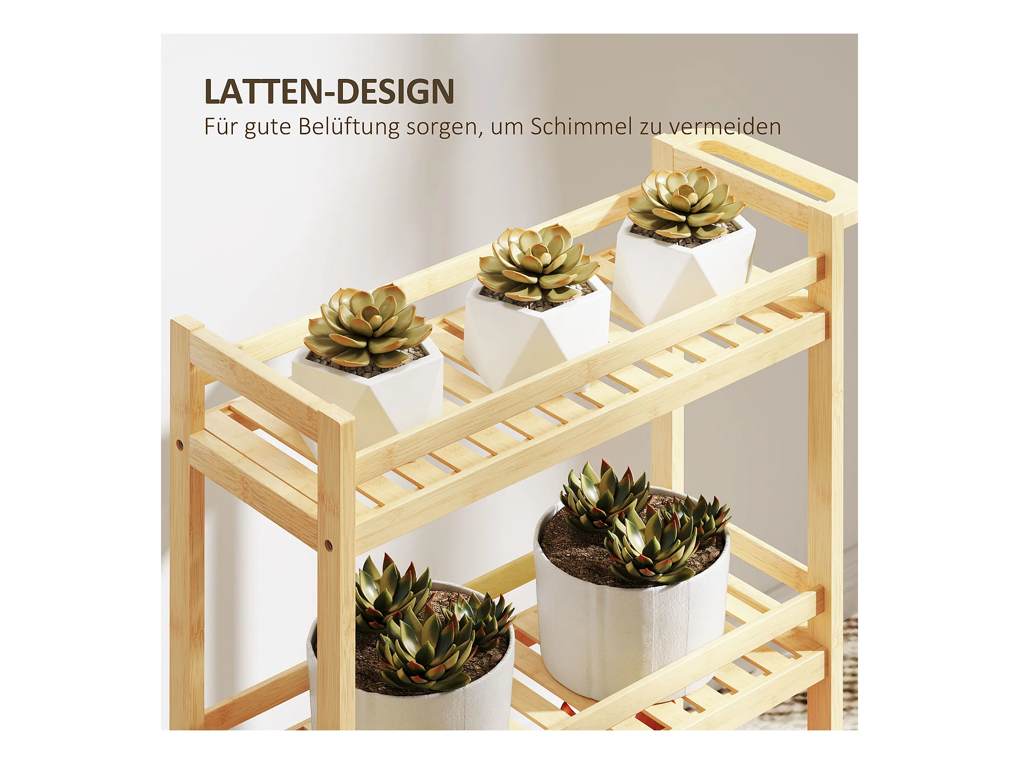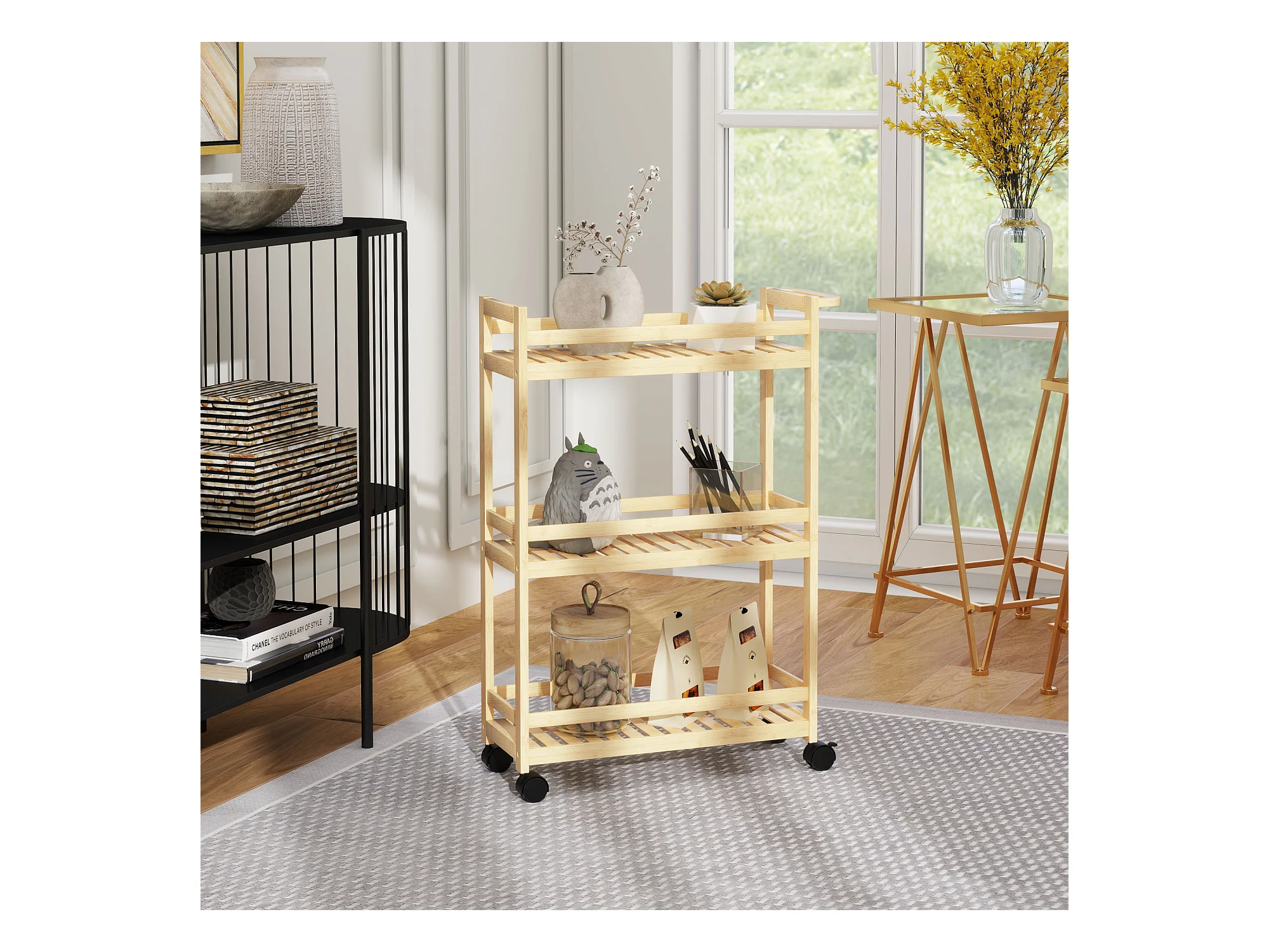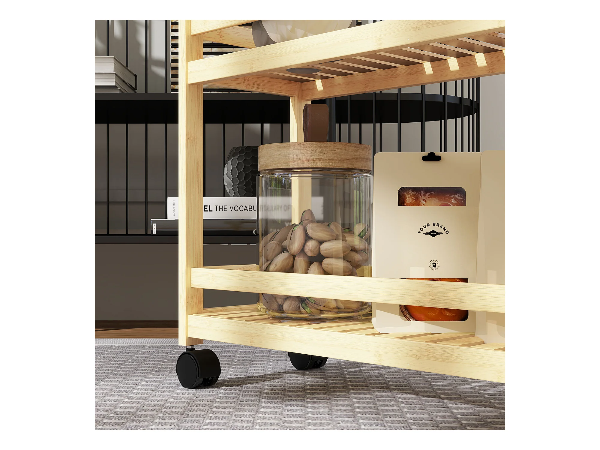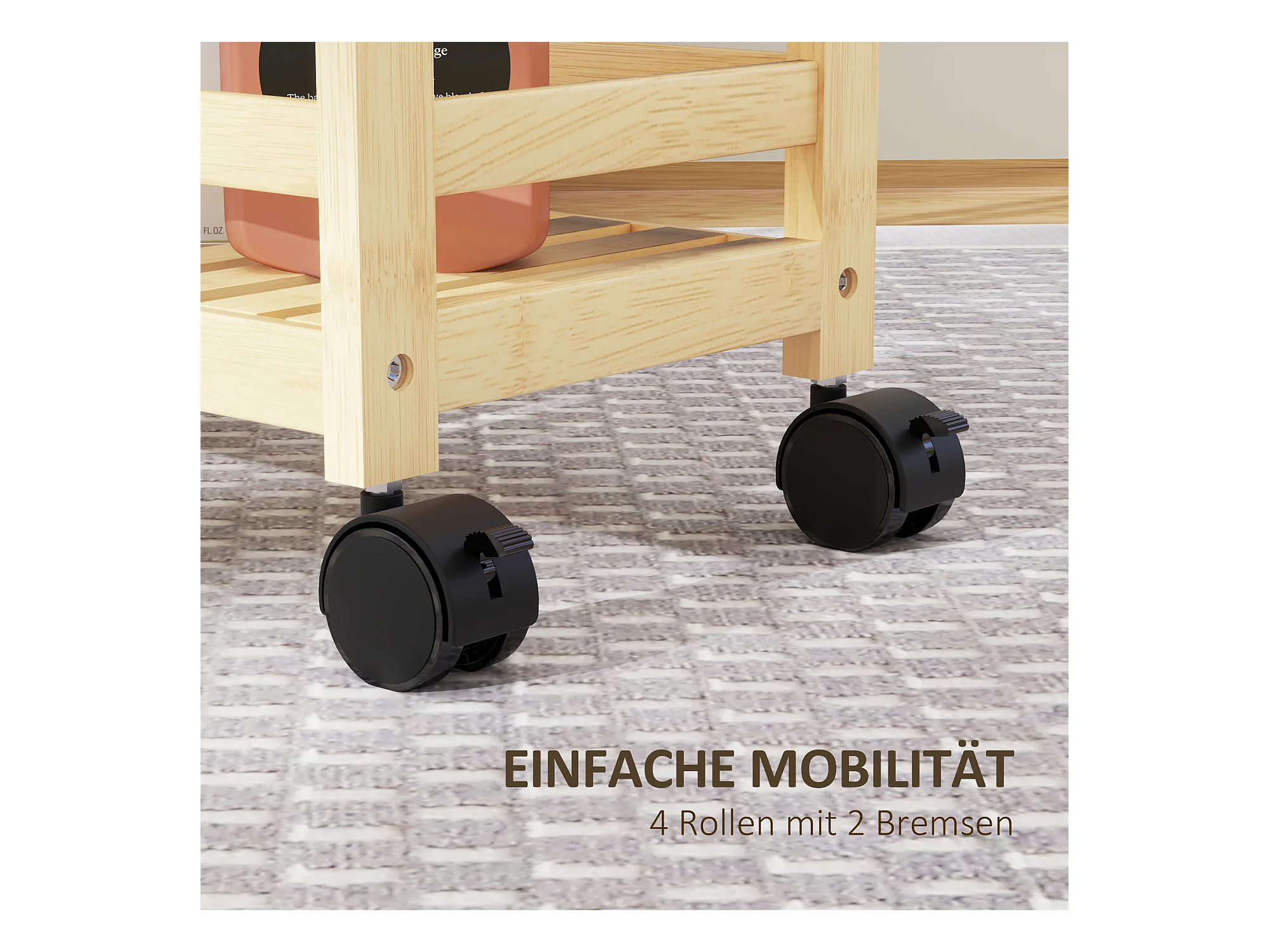 Carrello portaoggetti in bambù, 3 ripiani, con ruote e maniglie, naturale (55x20x75 cm)