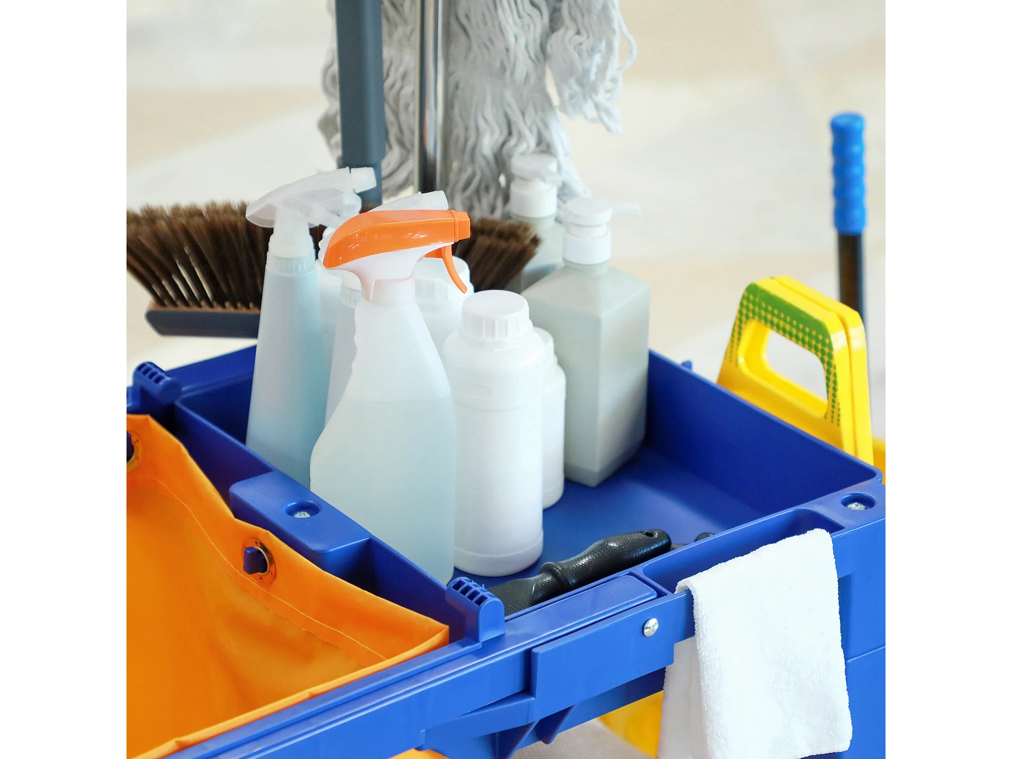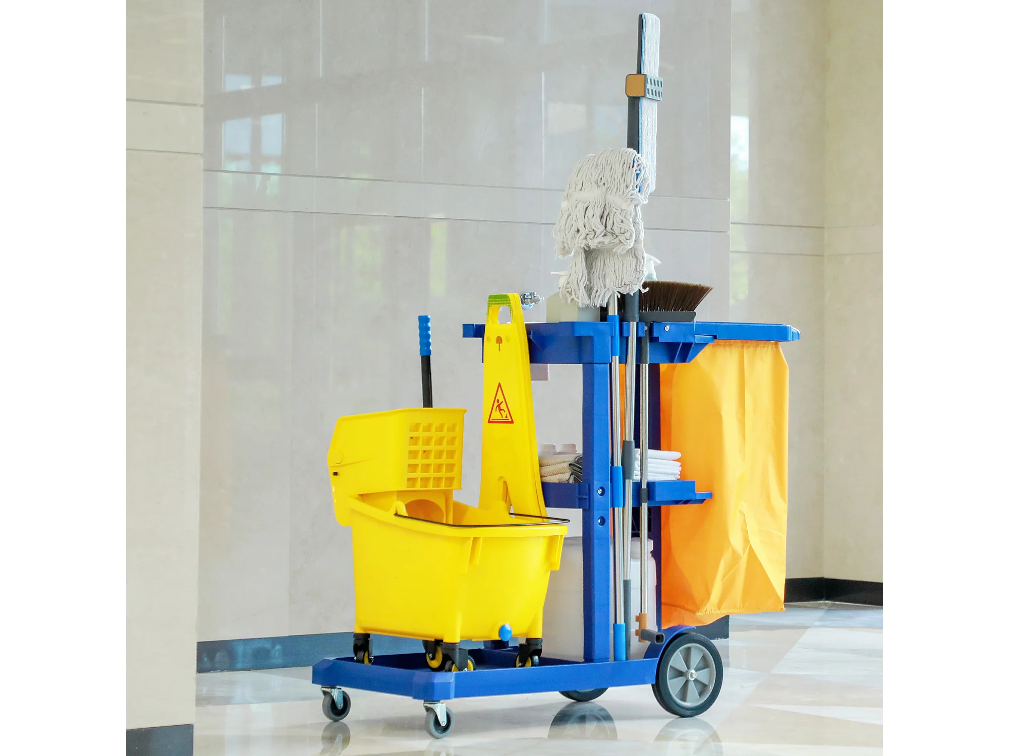 Carrello pulizie a 3 ripiani con ganci e sacco 100l blu giallo grigio