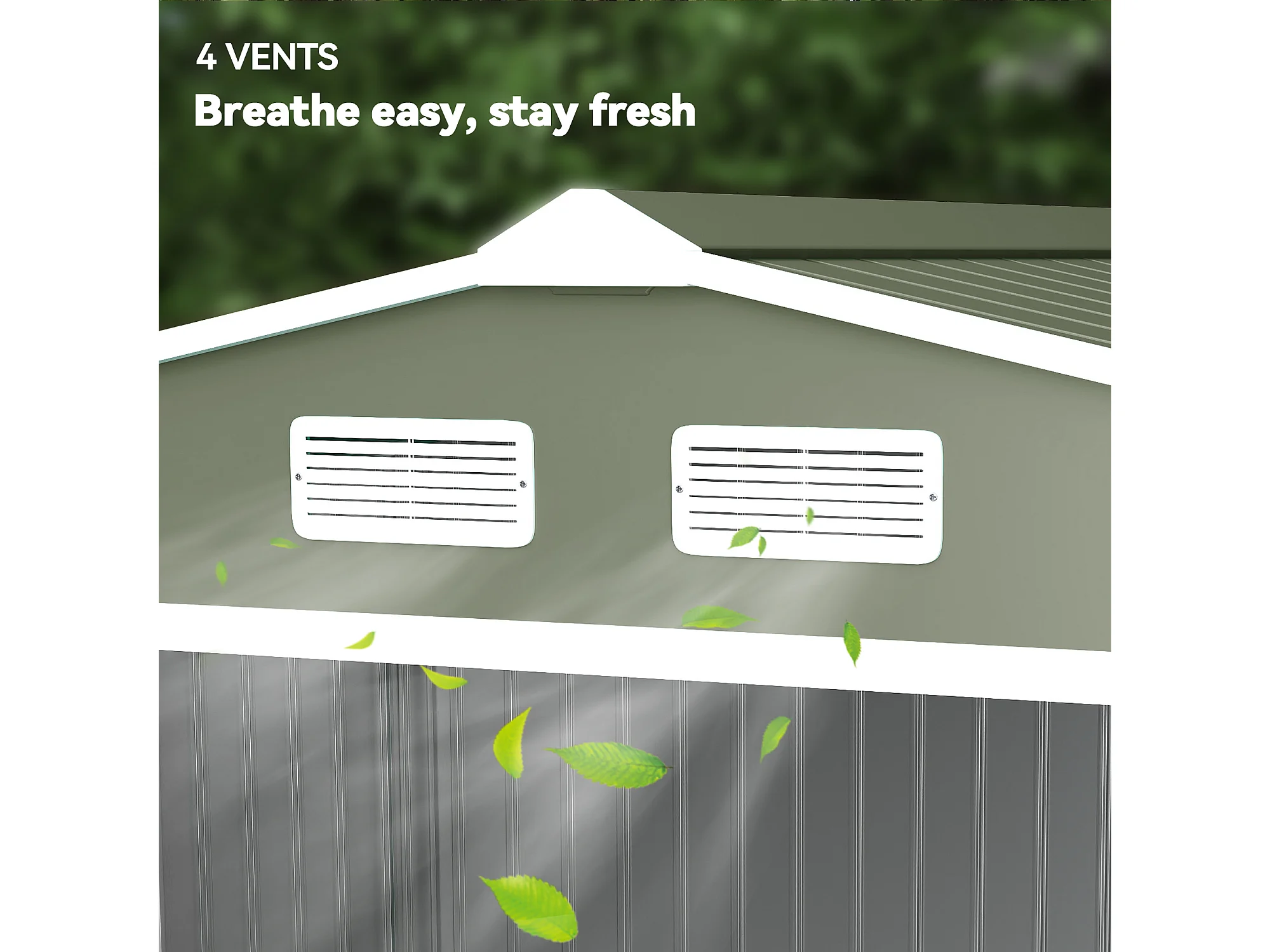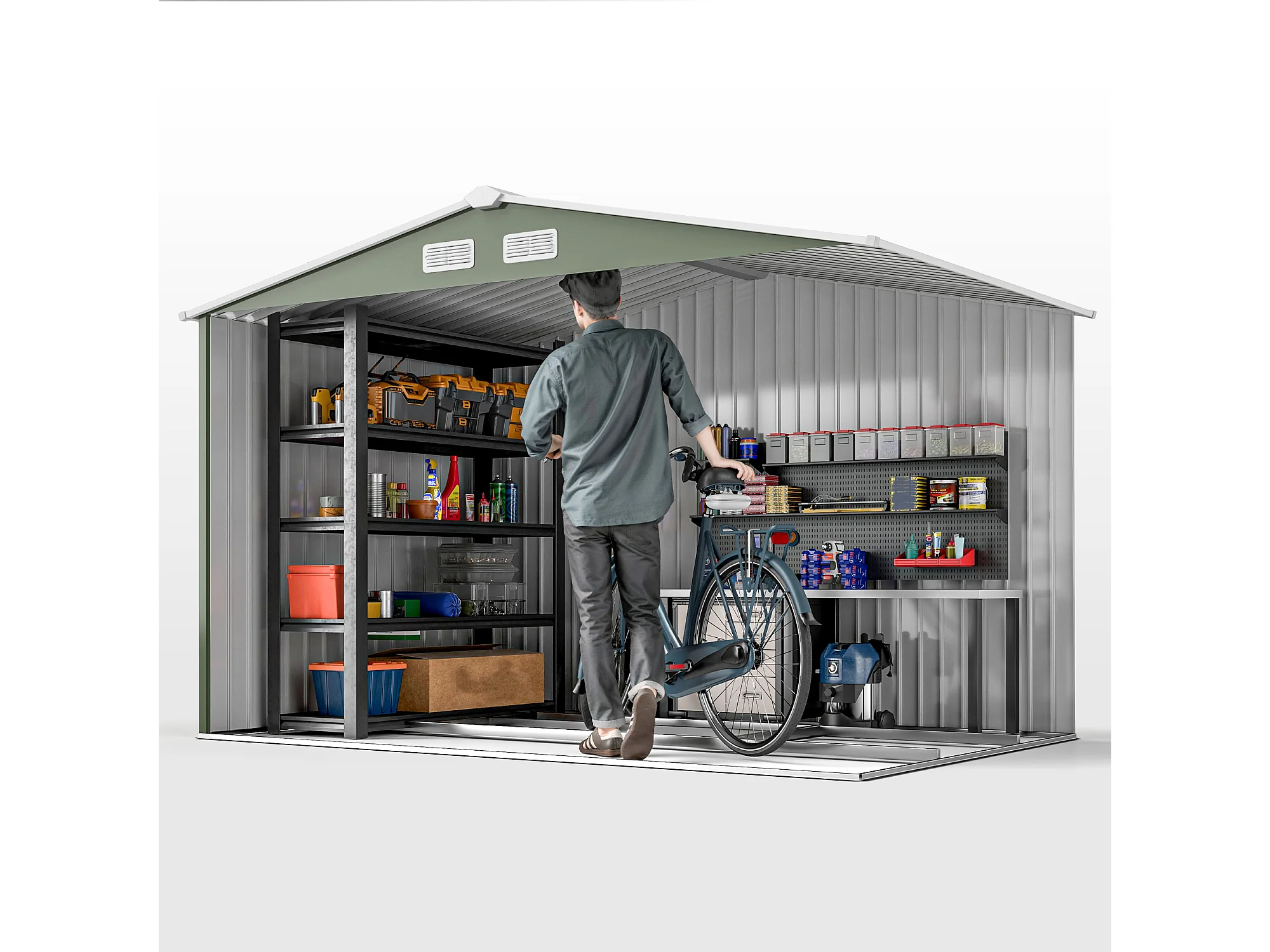 Casetta da giardino con tetto inclinato e prese d'aria acciaio verde