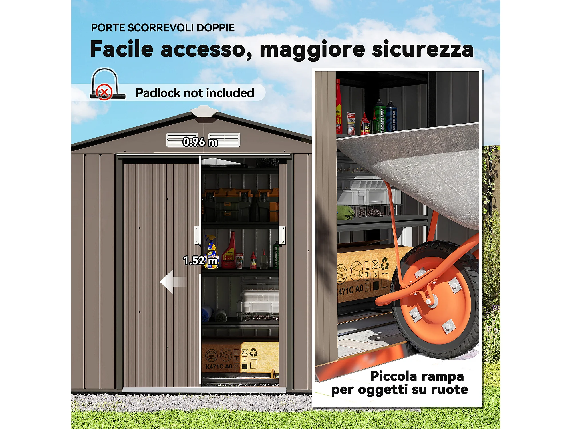 Casetta da giardino con porta scorrevole doppia in metallo marrone