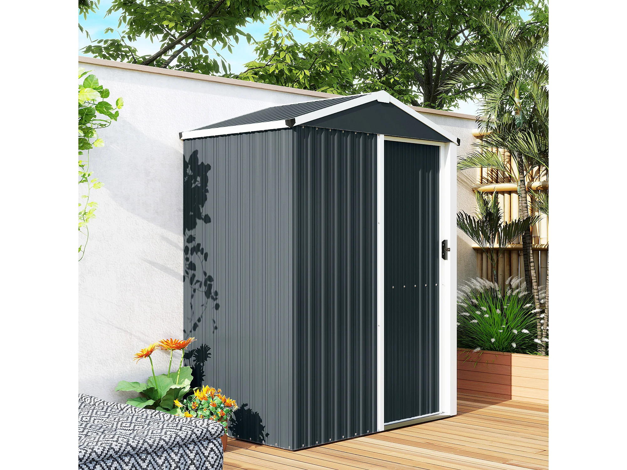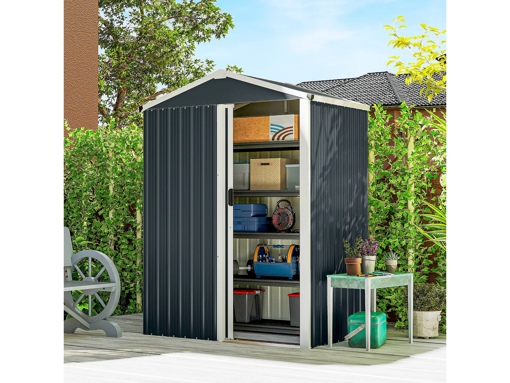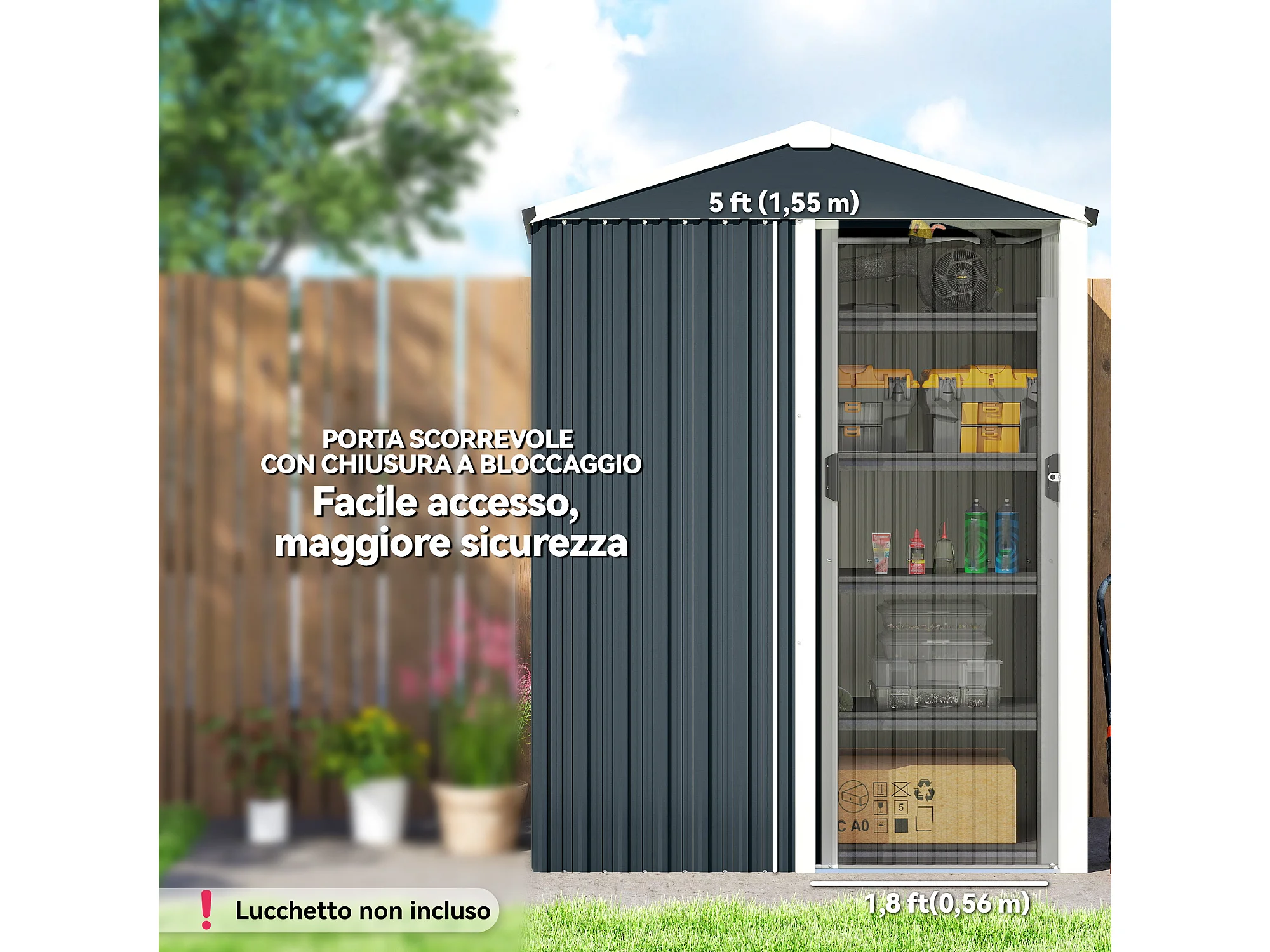 Casetta da giardino con porta scorrevole in acciaio grigio scuro