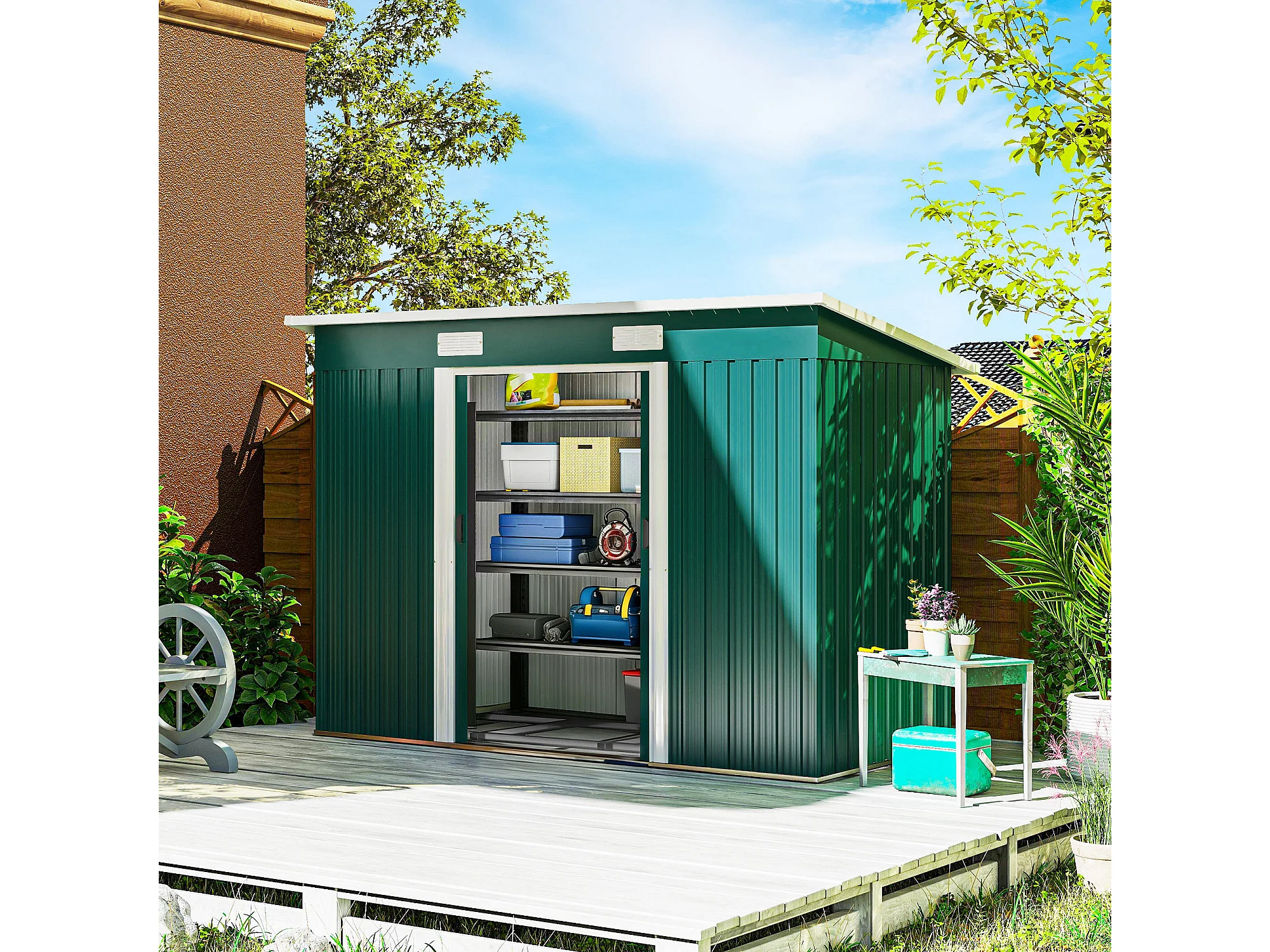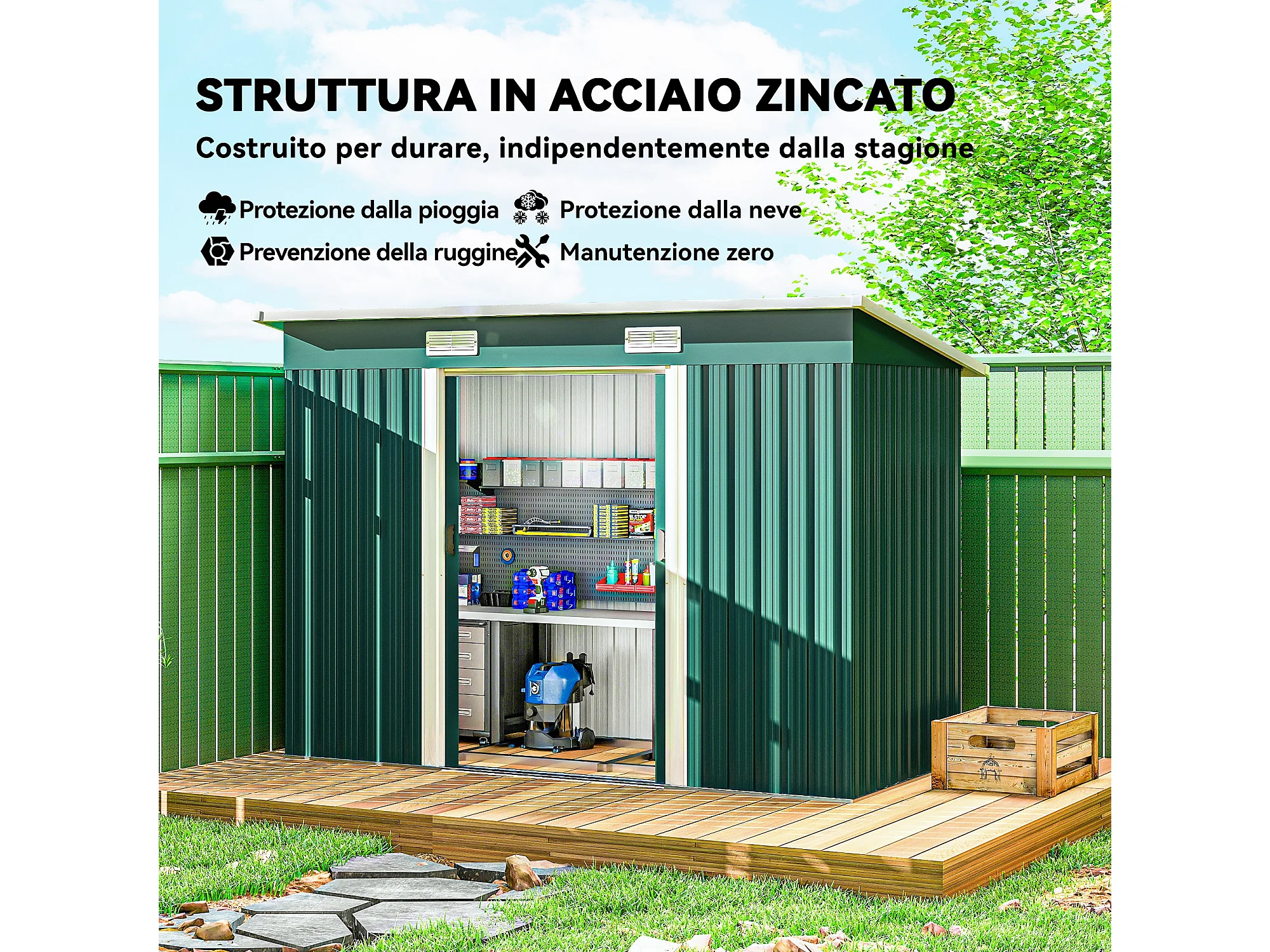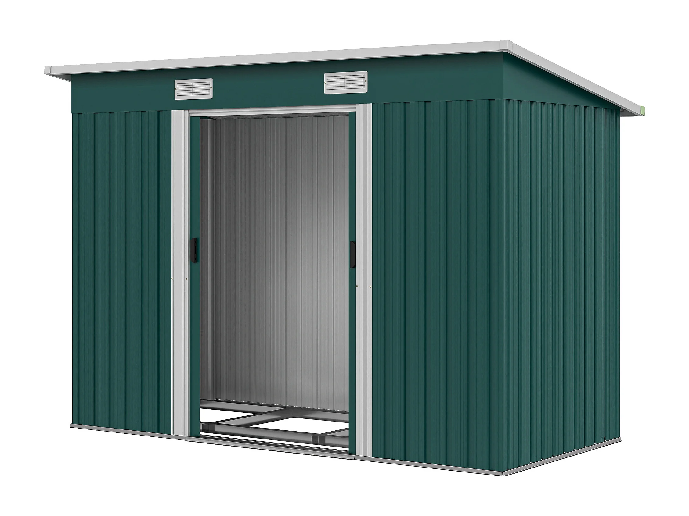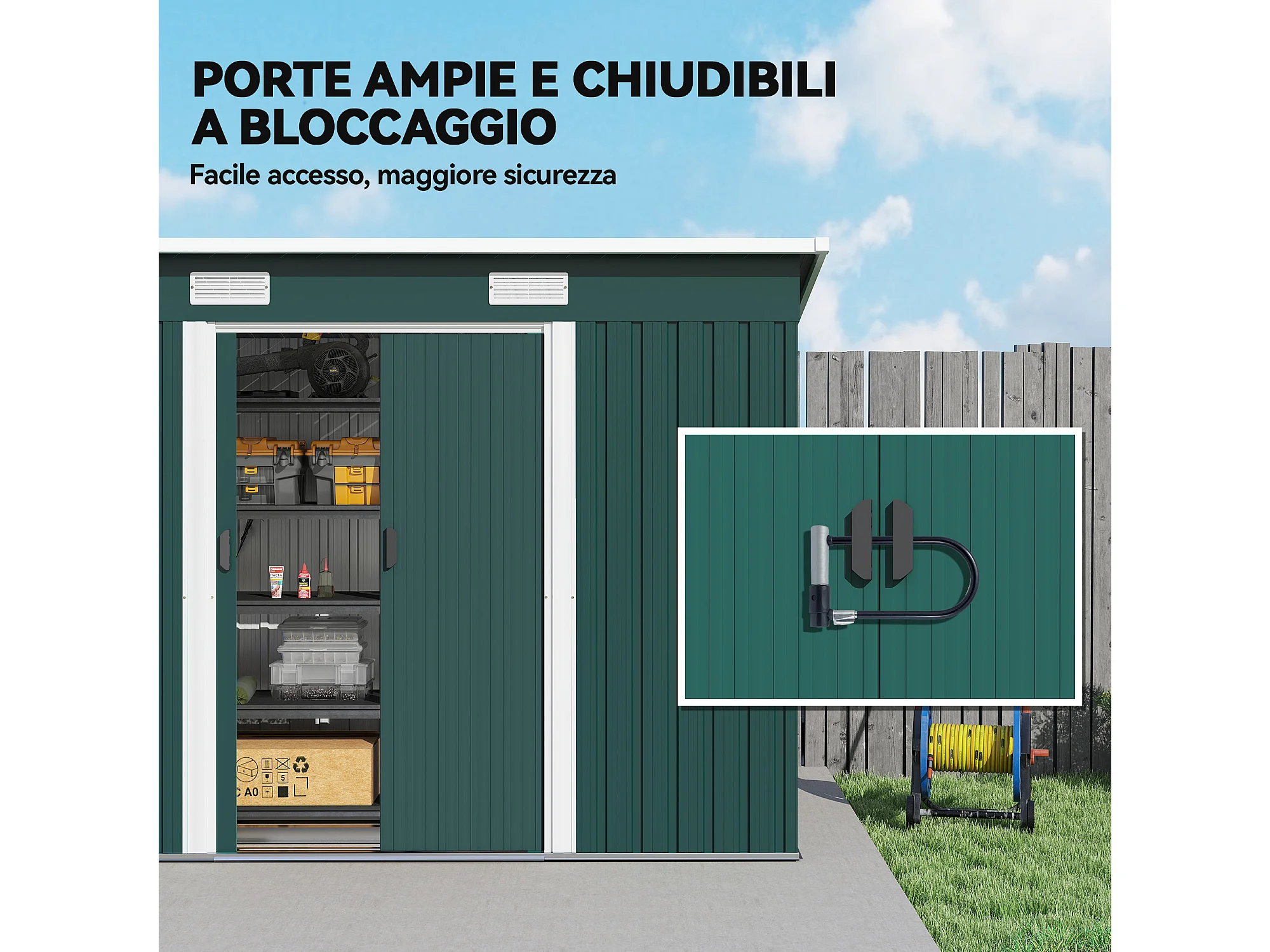 Casetta da giardino con porte scorrevoli in acciaio verde