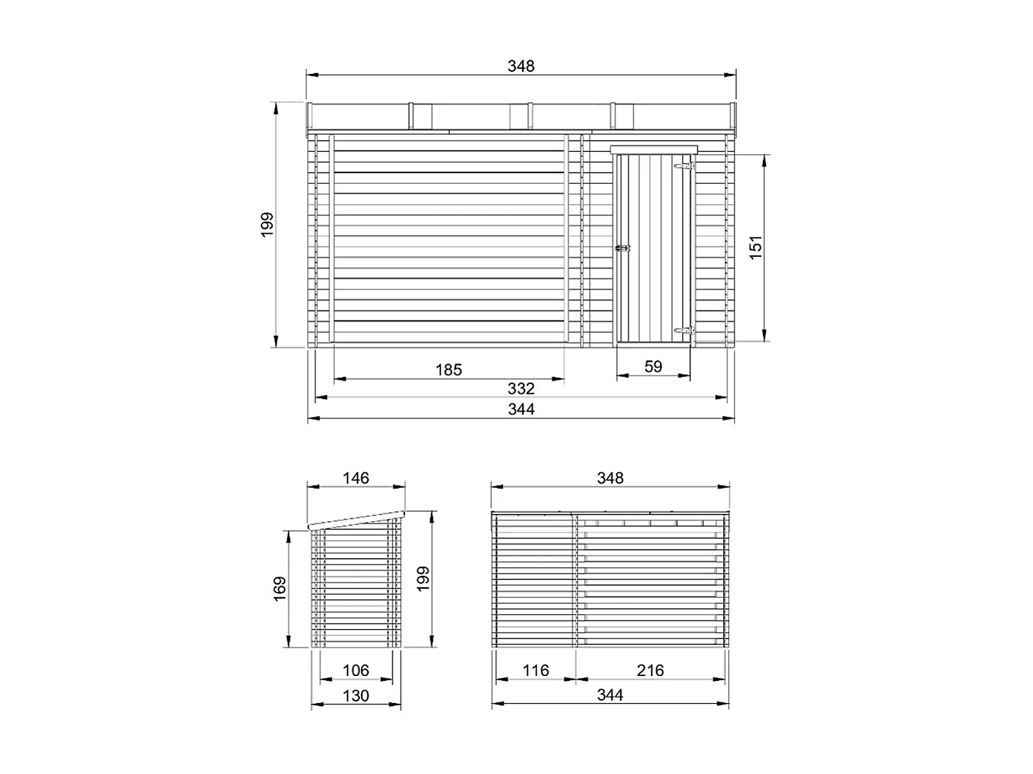 Casetta da giardino in legno - A199x348x146 cm / 2.54+1.1 m² - M205