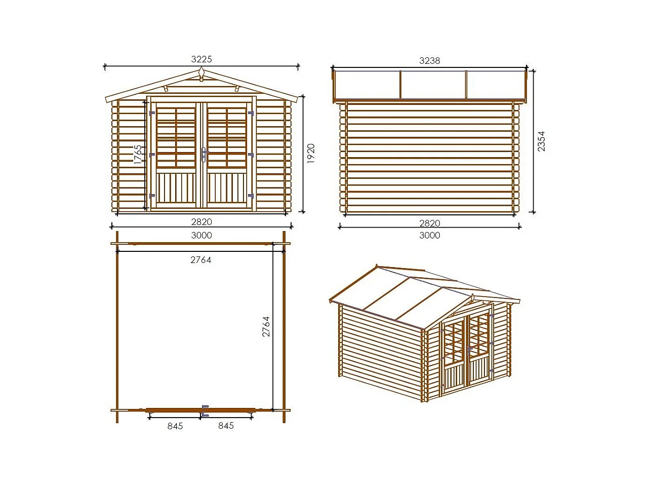Casetta da giardino in legno – 3.00x3.00 m con estensione 3.00x2.76 m - 9.00 m² - DOM676+DOS194 - ALTANKA