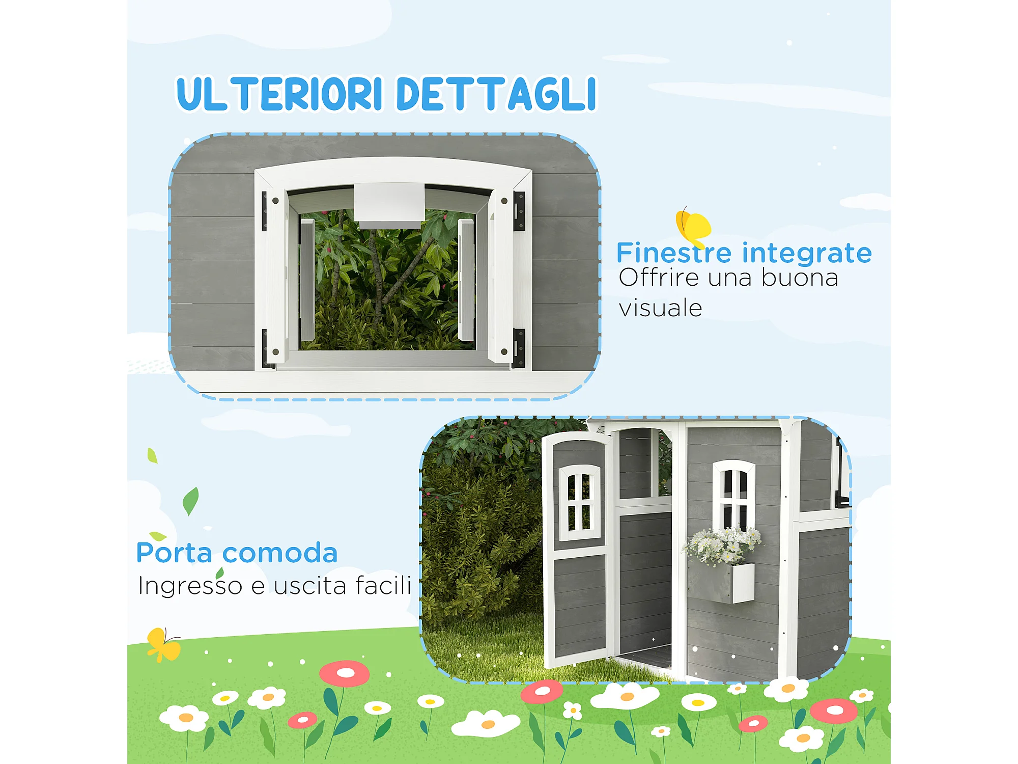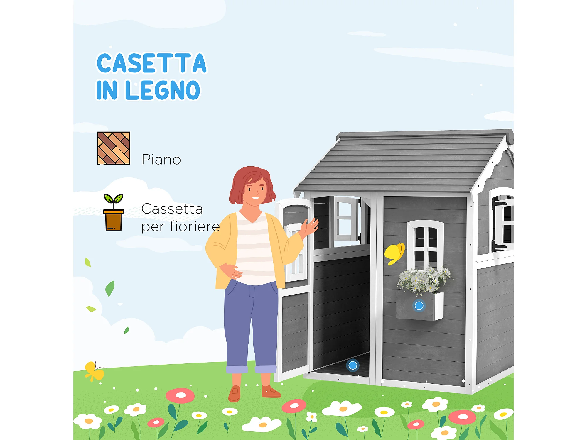 Casetta per bambini 3-8 anni con 6 finestre e fioriera in legno grigia