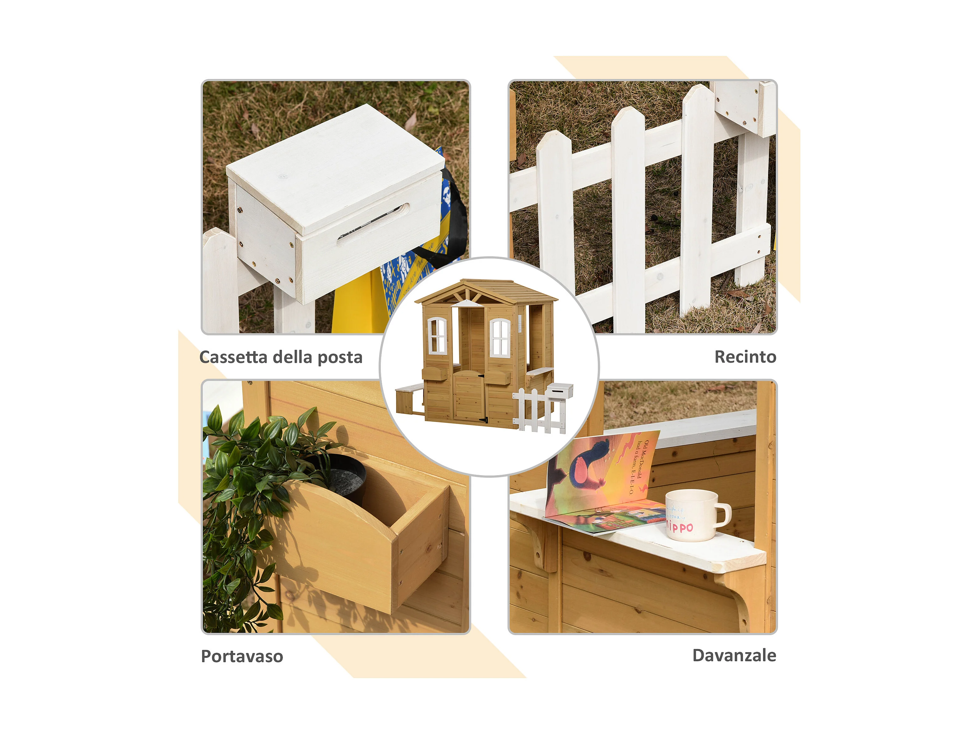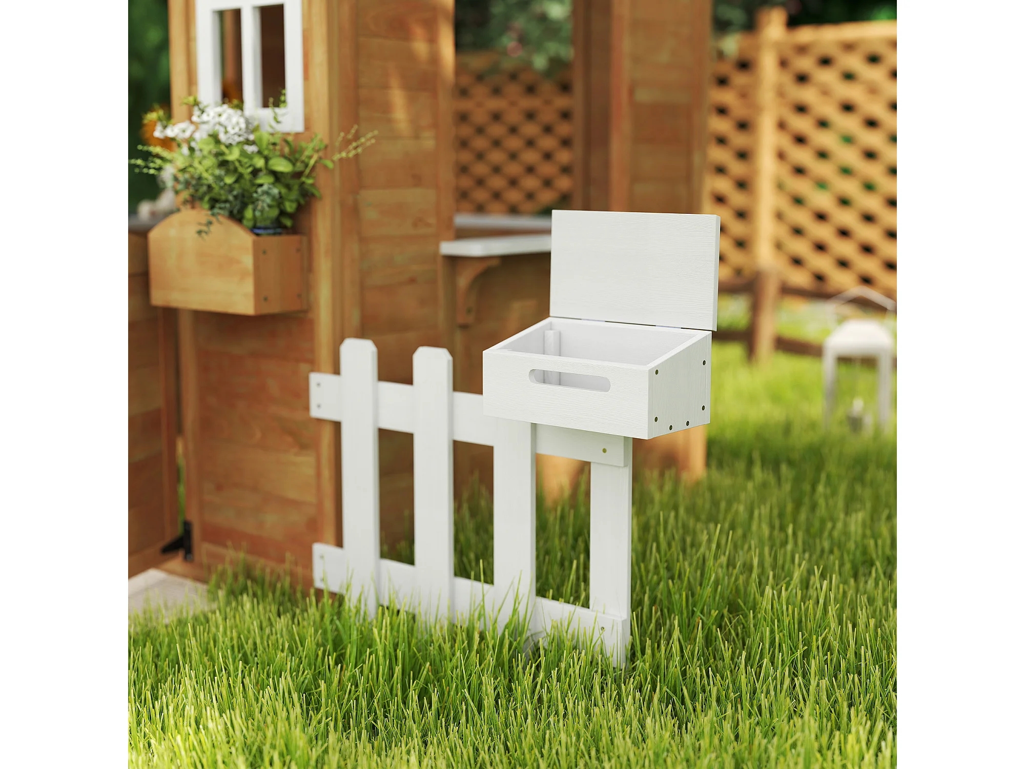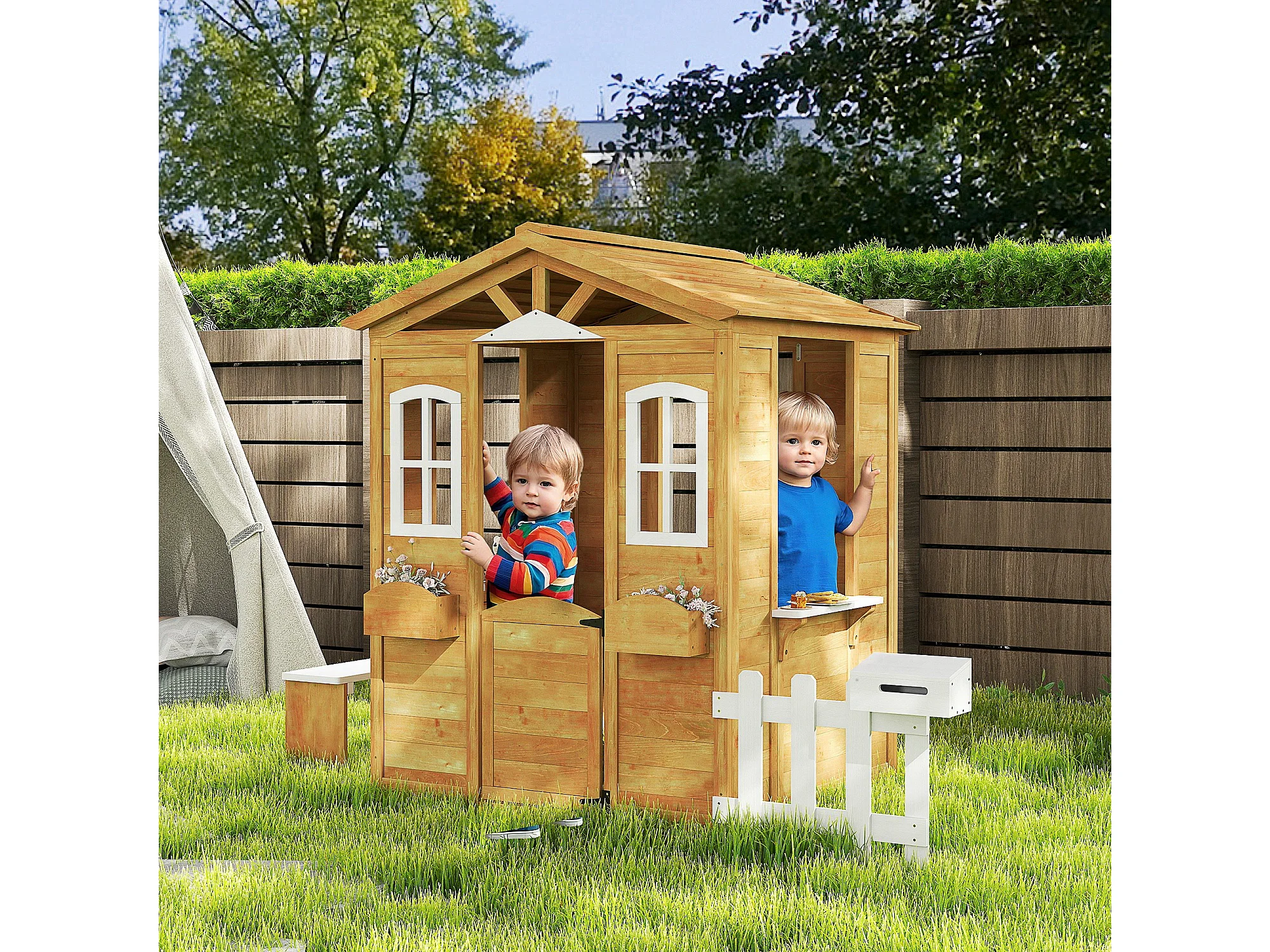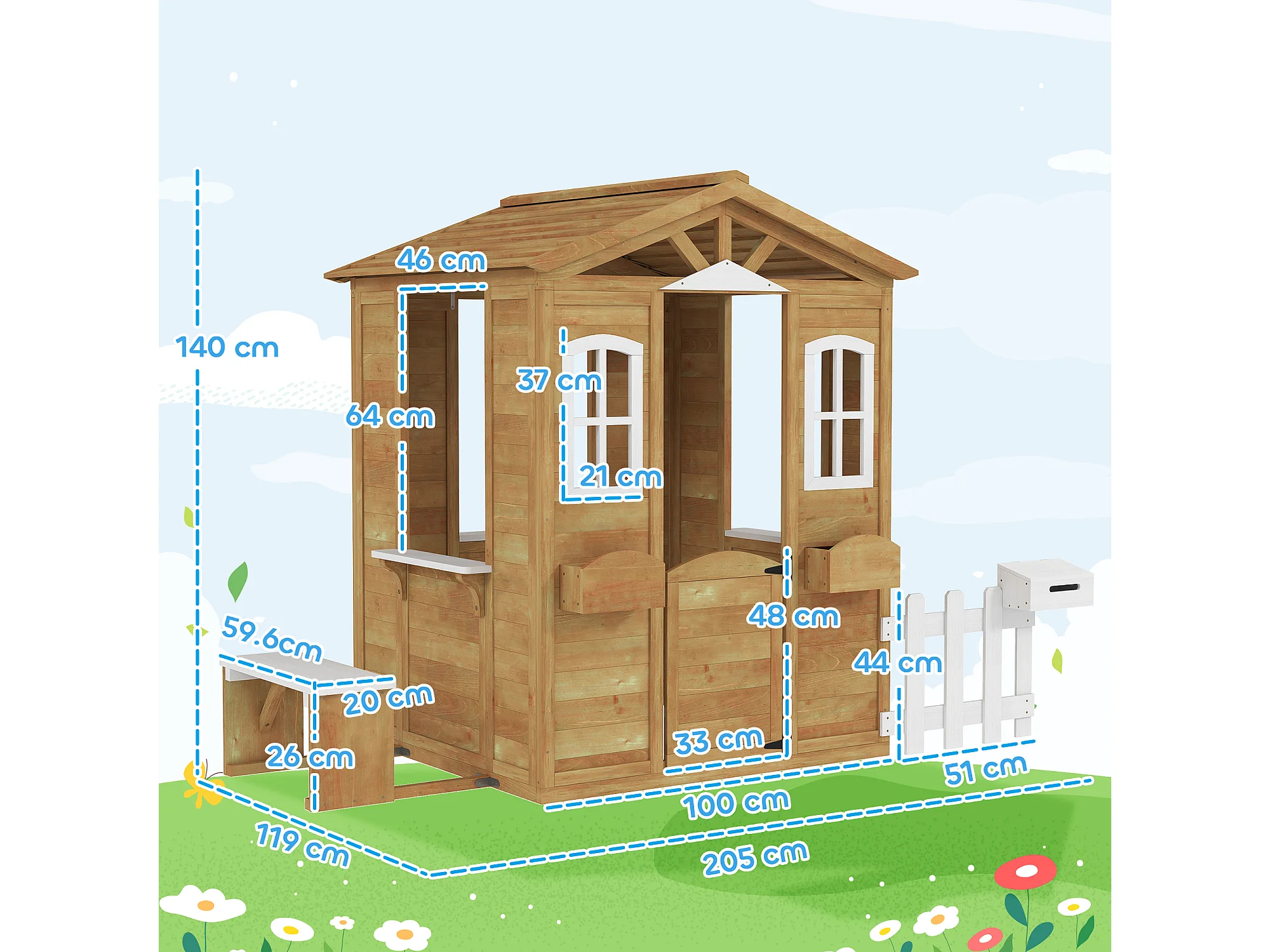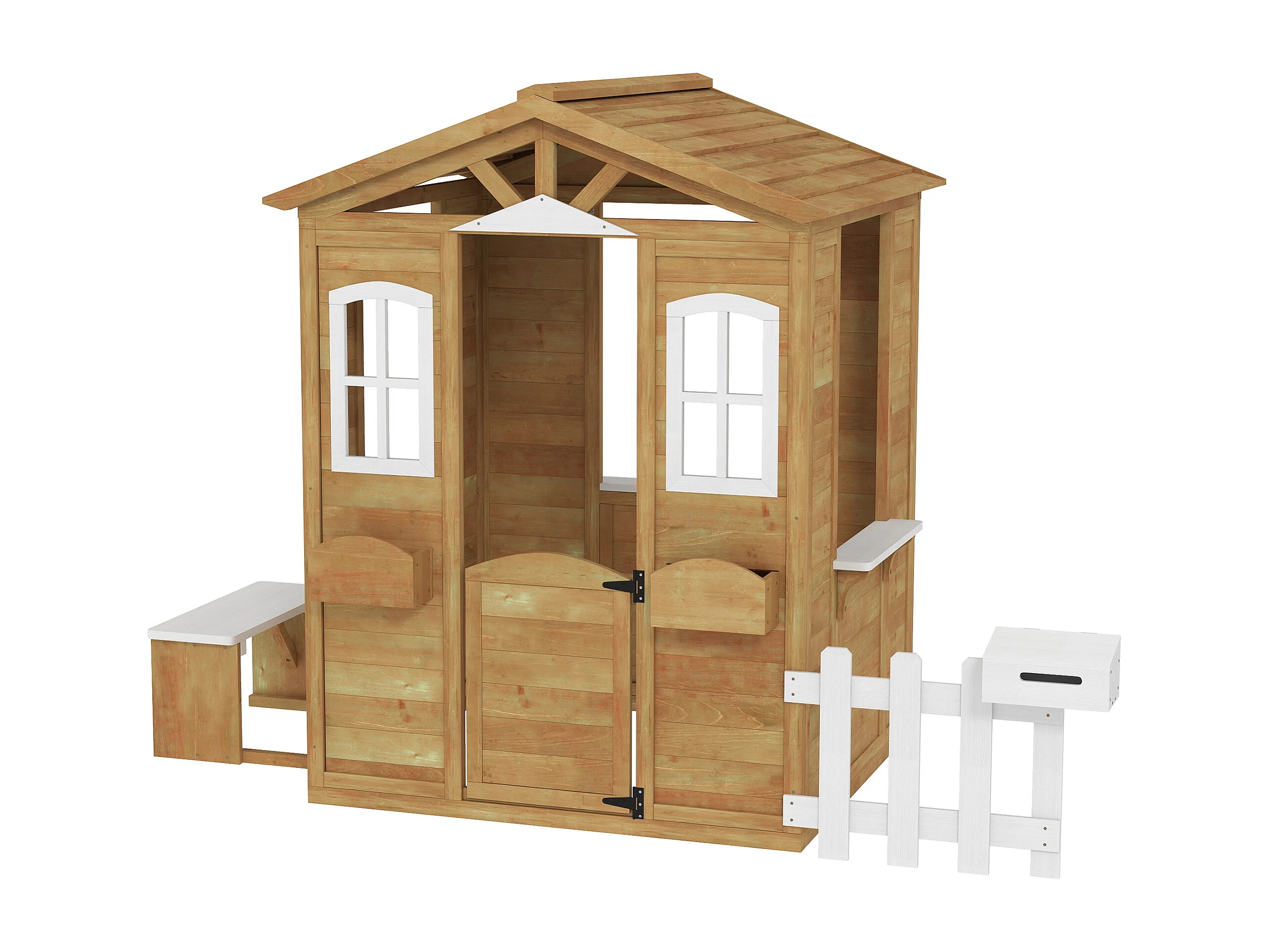 Casetta per bambini con staccionata e finestre in legno
