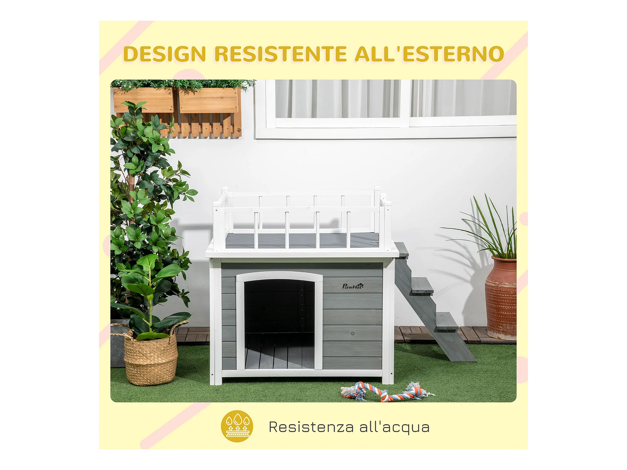Cuccia per cani da esterno in legno e plastica con portico e finestre