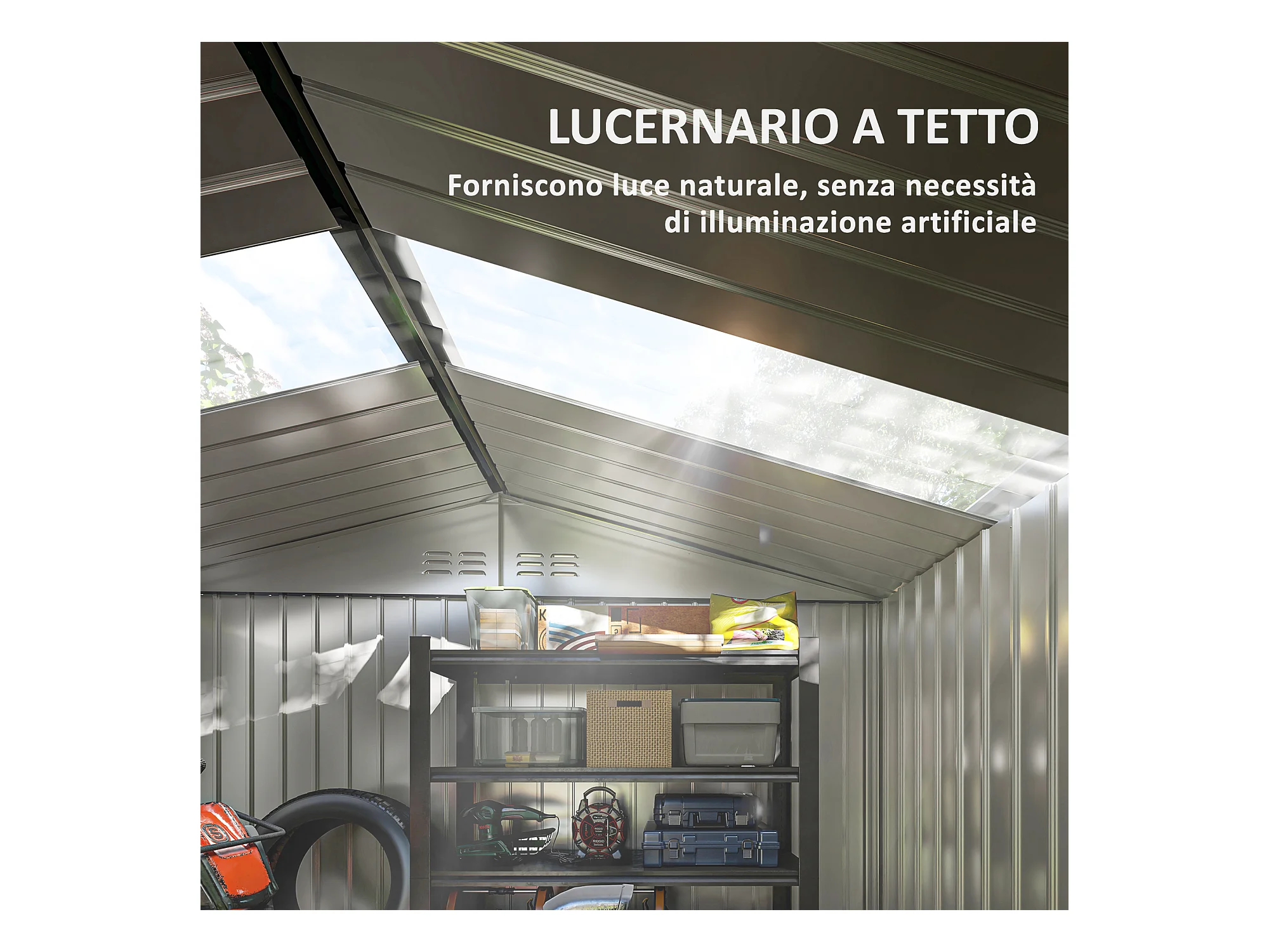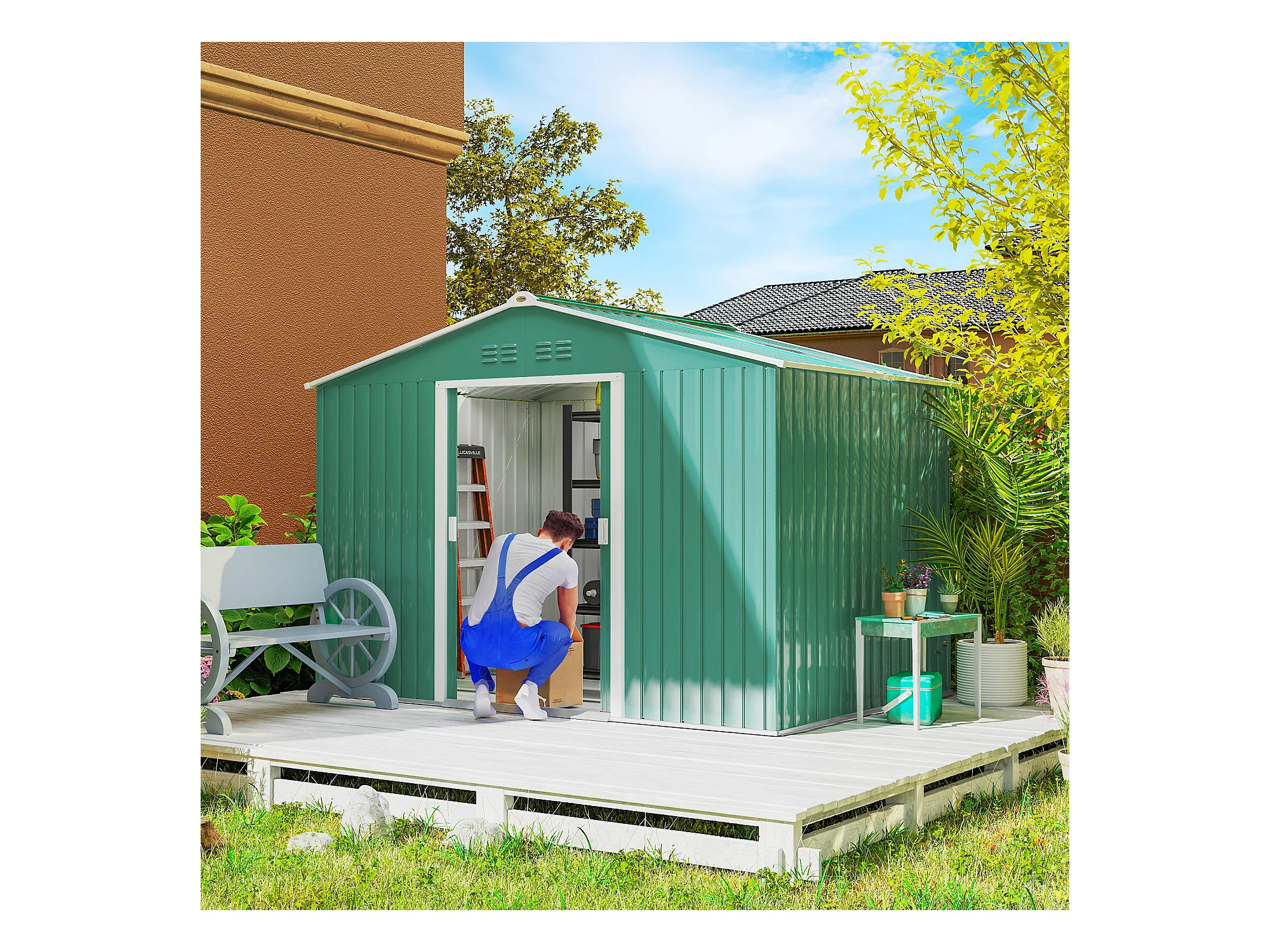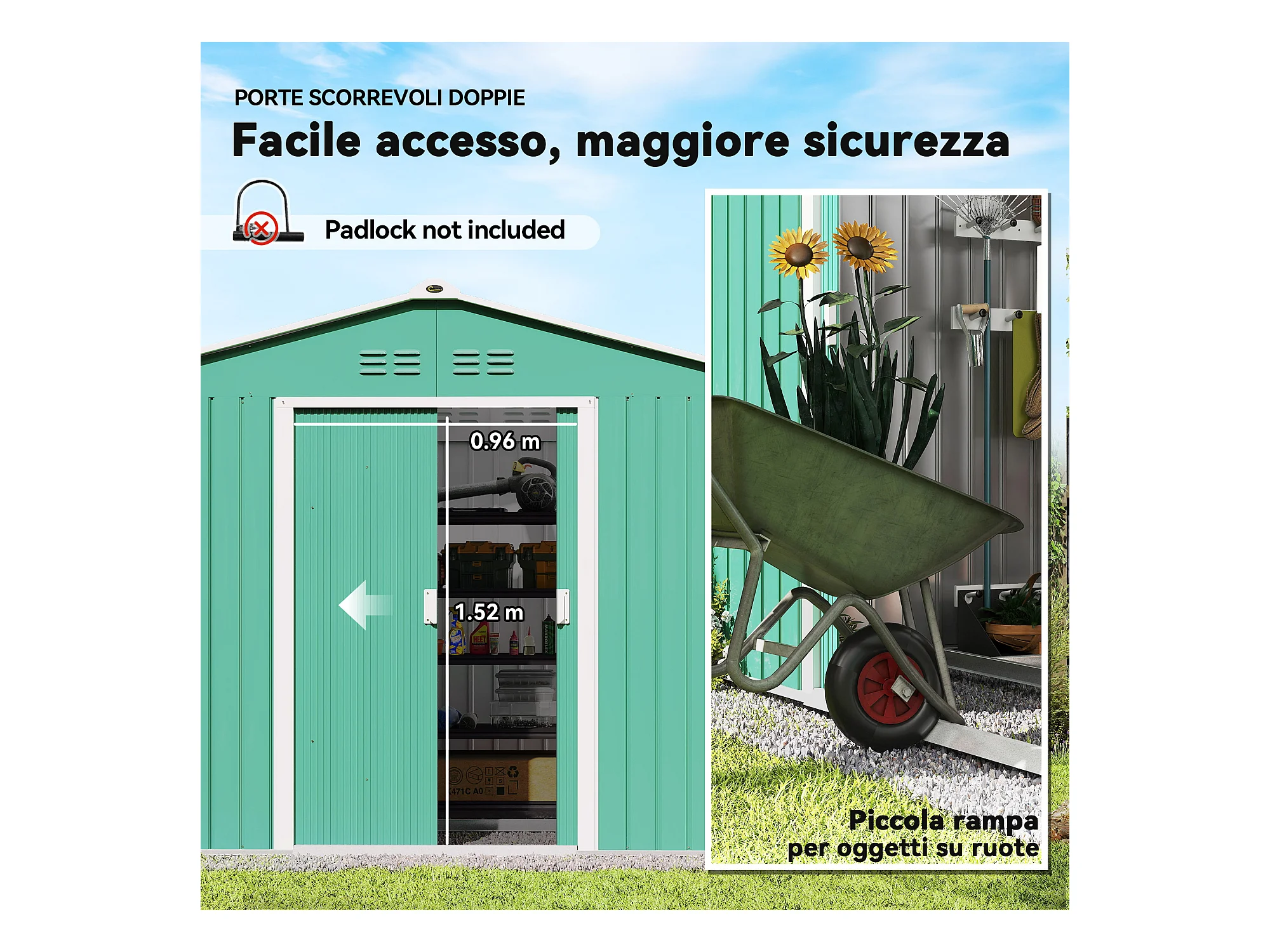 Casetta da giardino in lamiera d'acciaio con porte scorrevoli