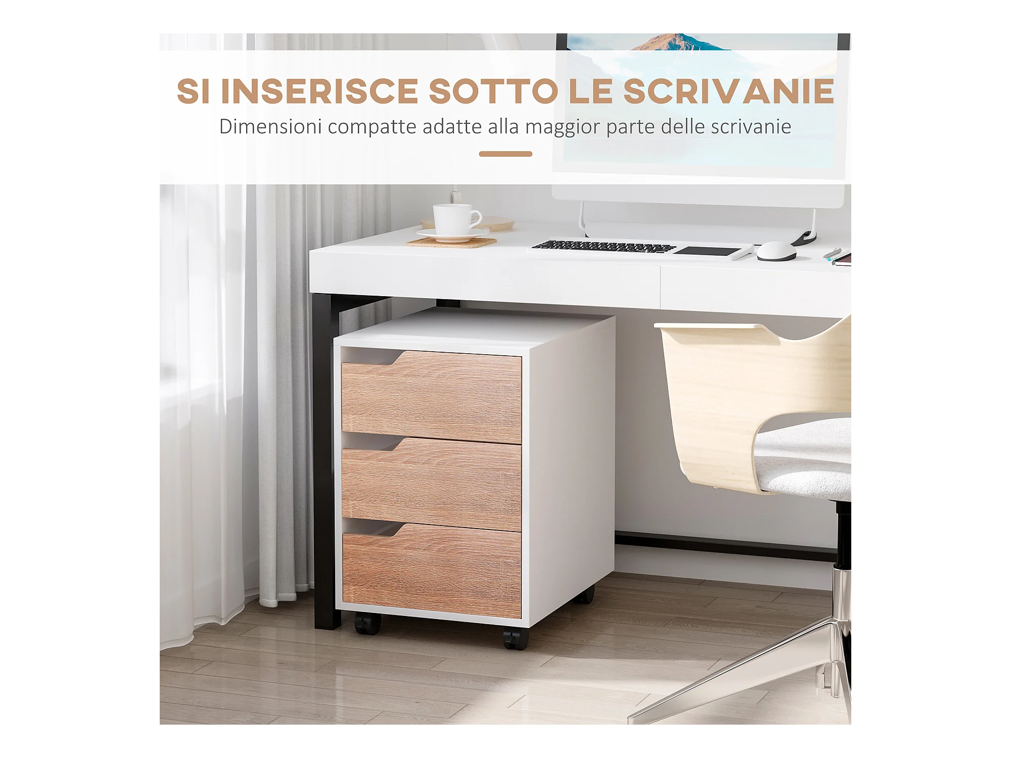 Cassettiera 3 cassetti bianca e color legno con 4 ruote