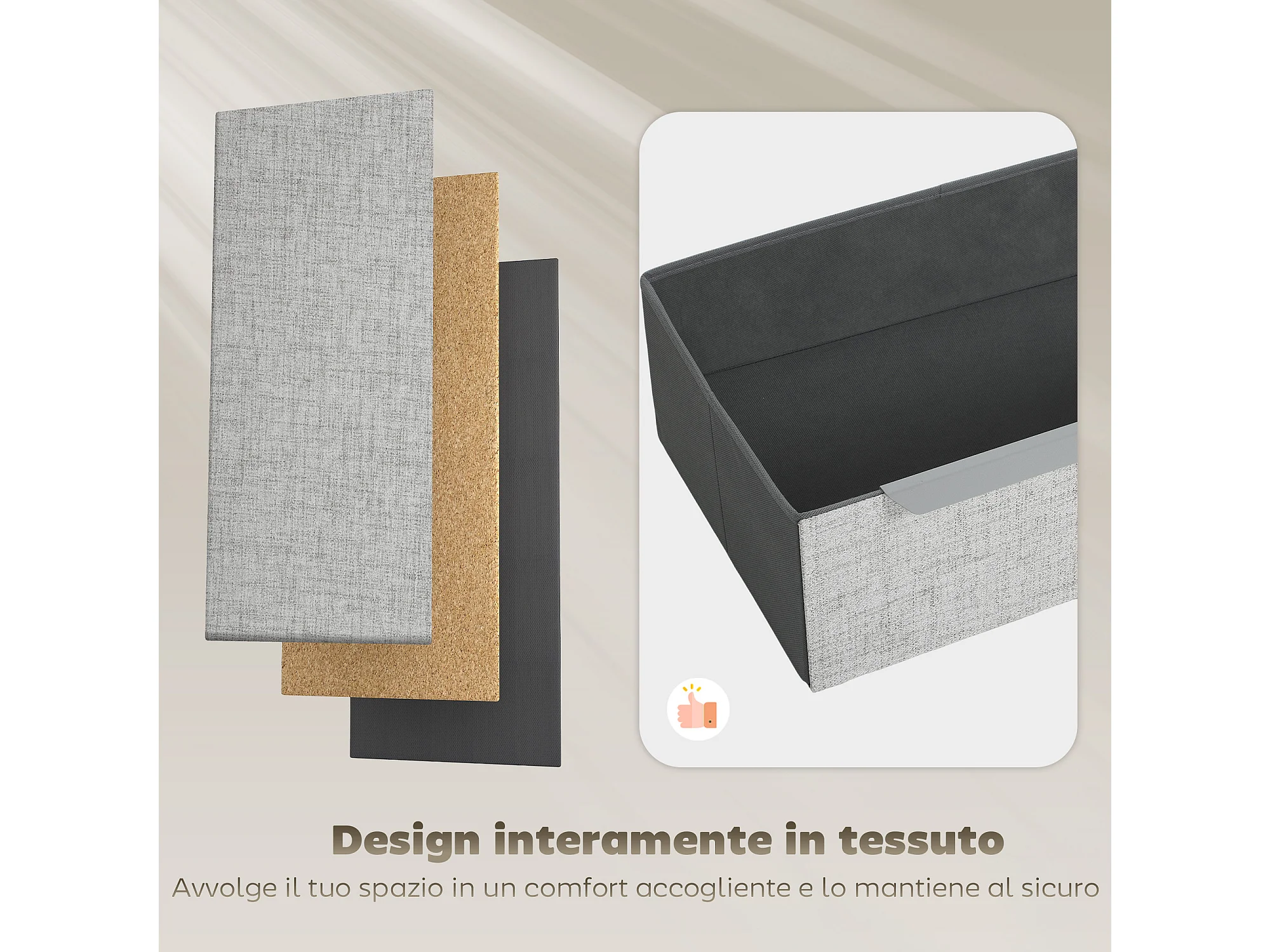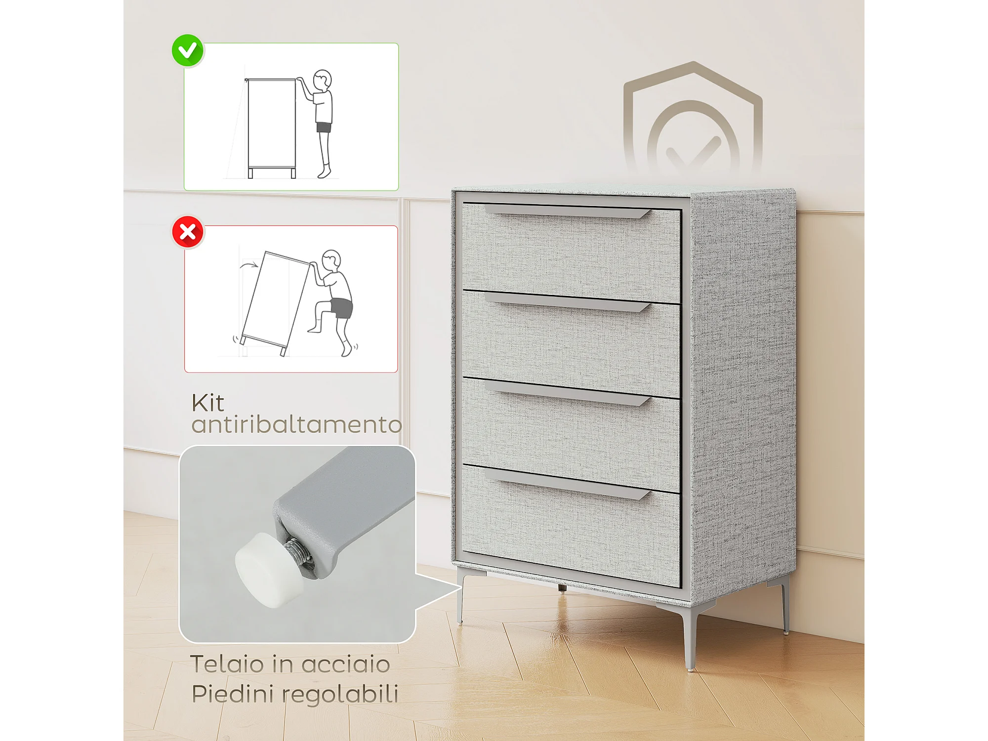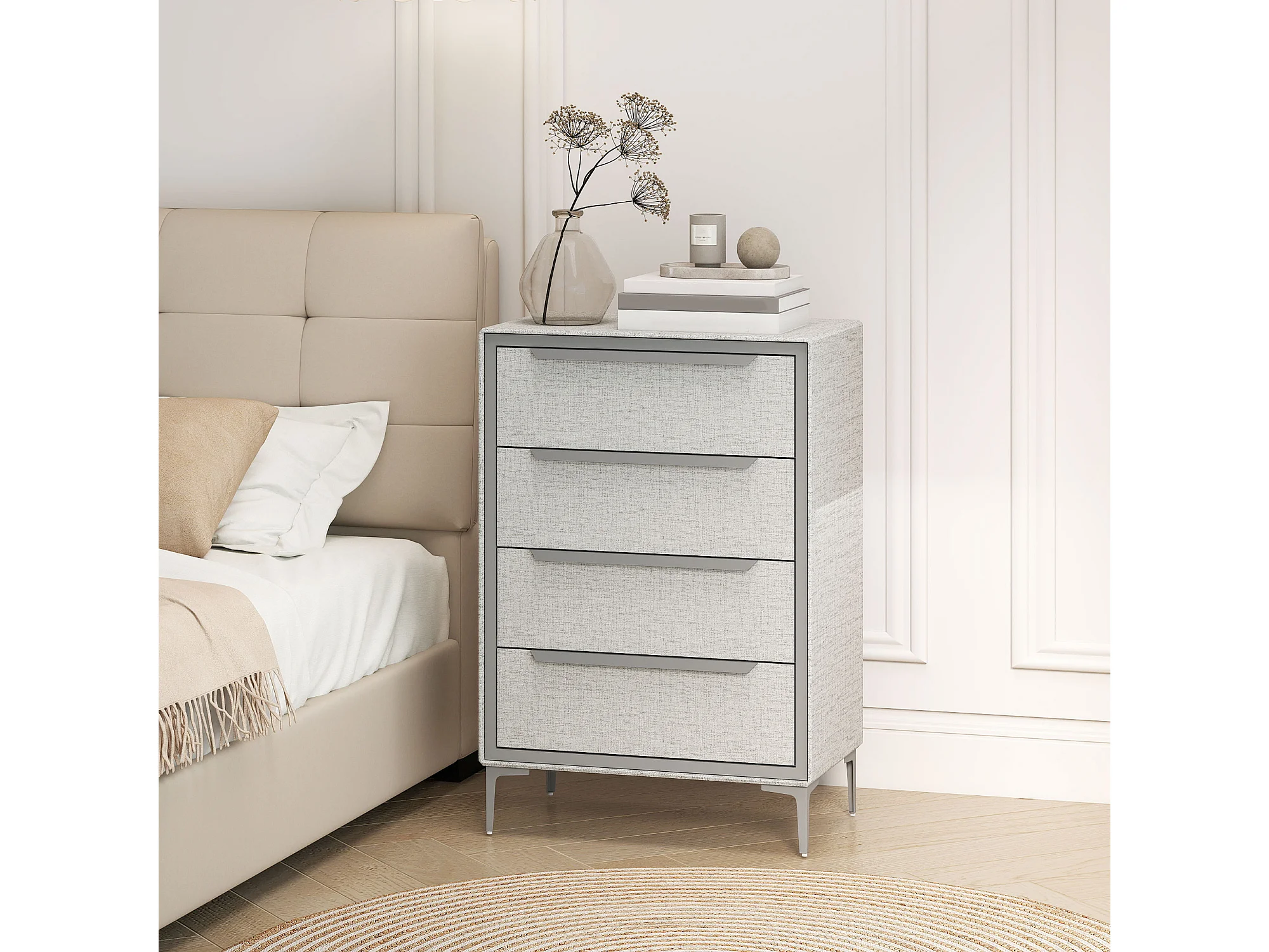 Cassettiera 4 cassetti rivestita in tessuto effetto lino grigio
