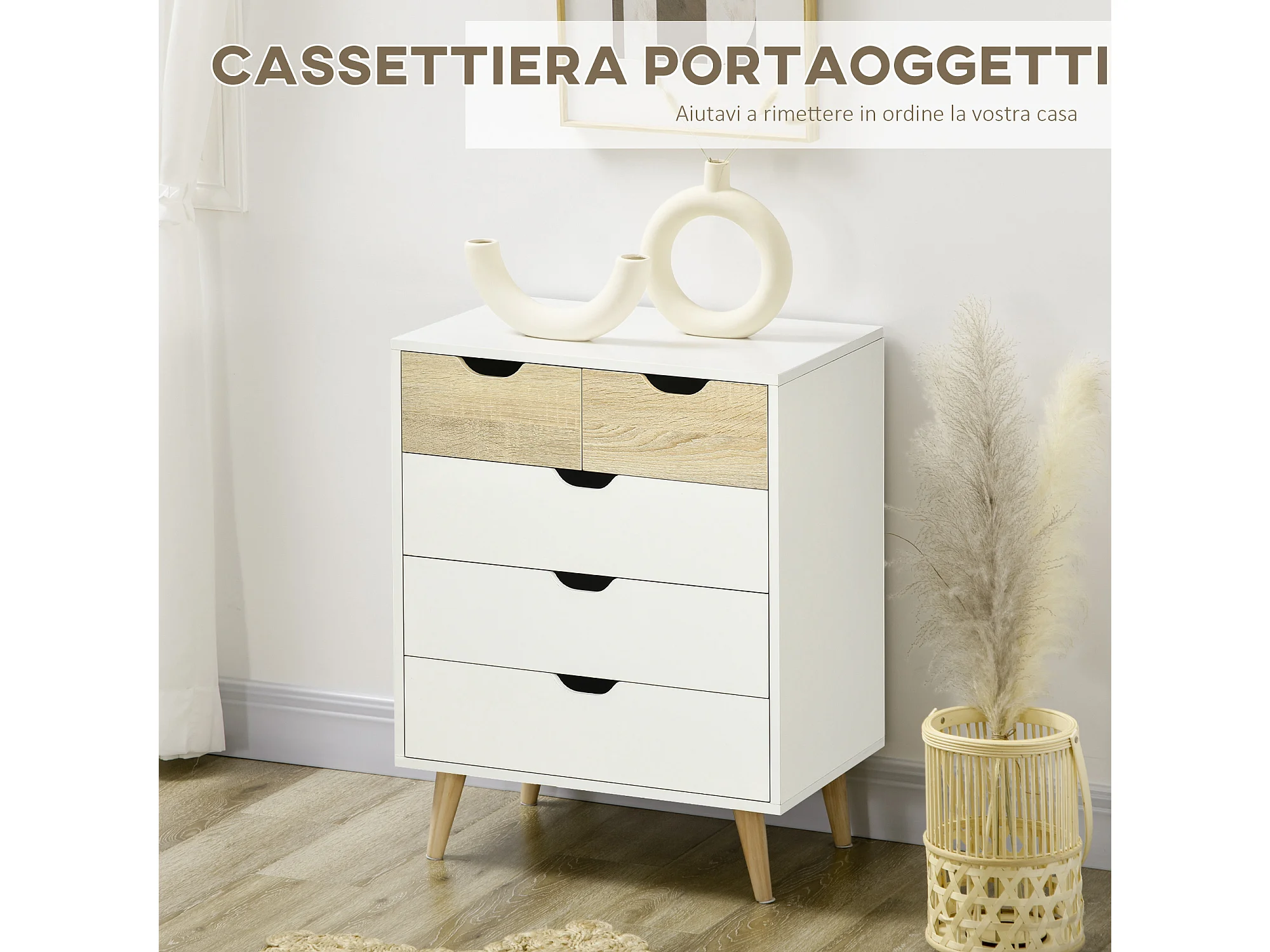 Cassettiera 5 cassetti minimal in truciolato bianco e rovere