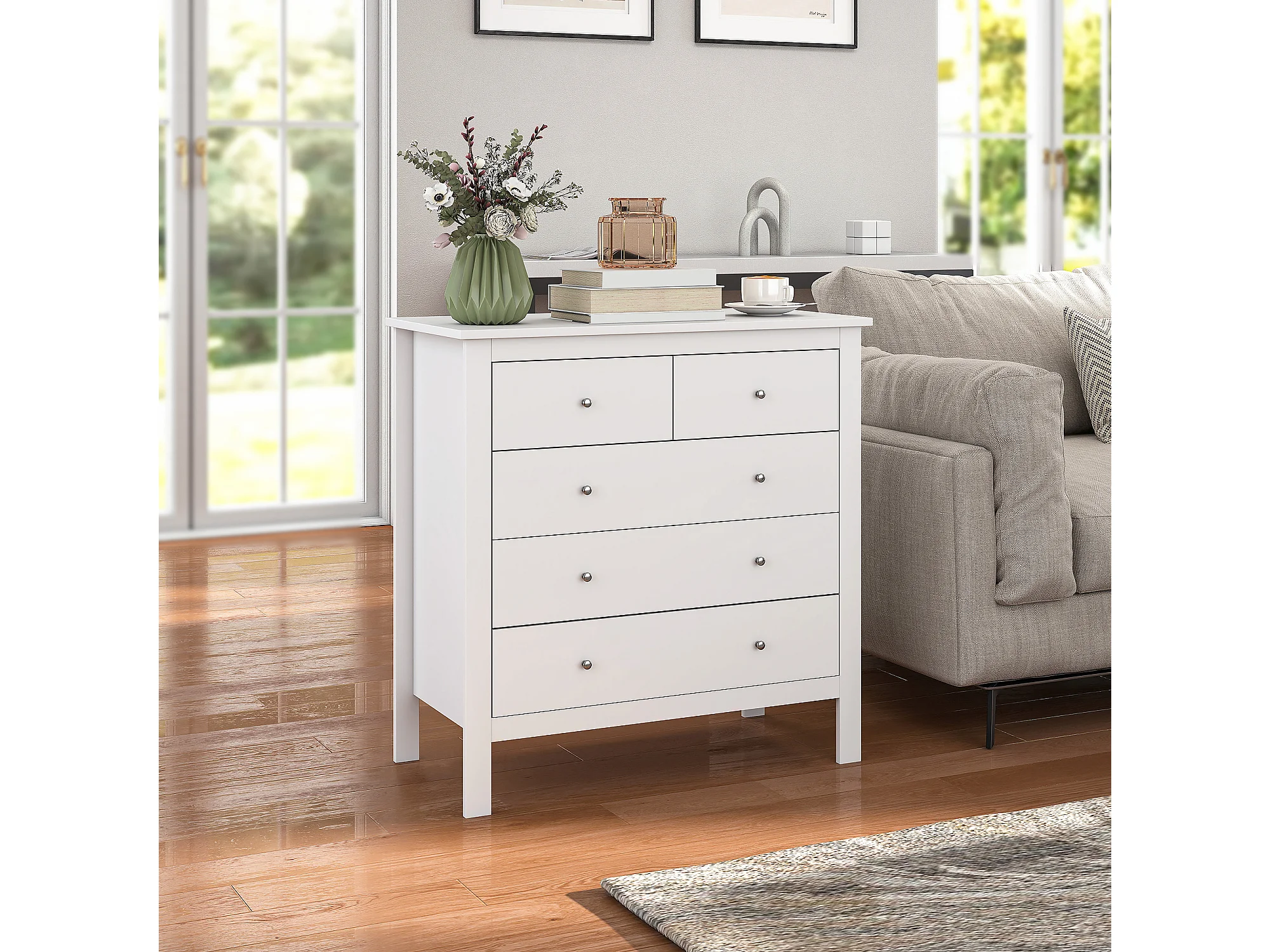 Cassettiera 5 cassetti per camera in legno bianco 79x39.5x80.5 cm