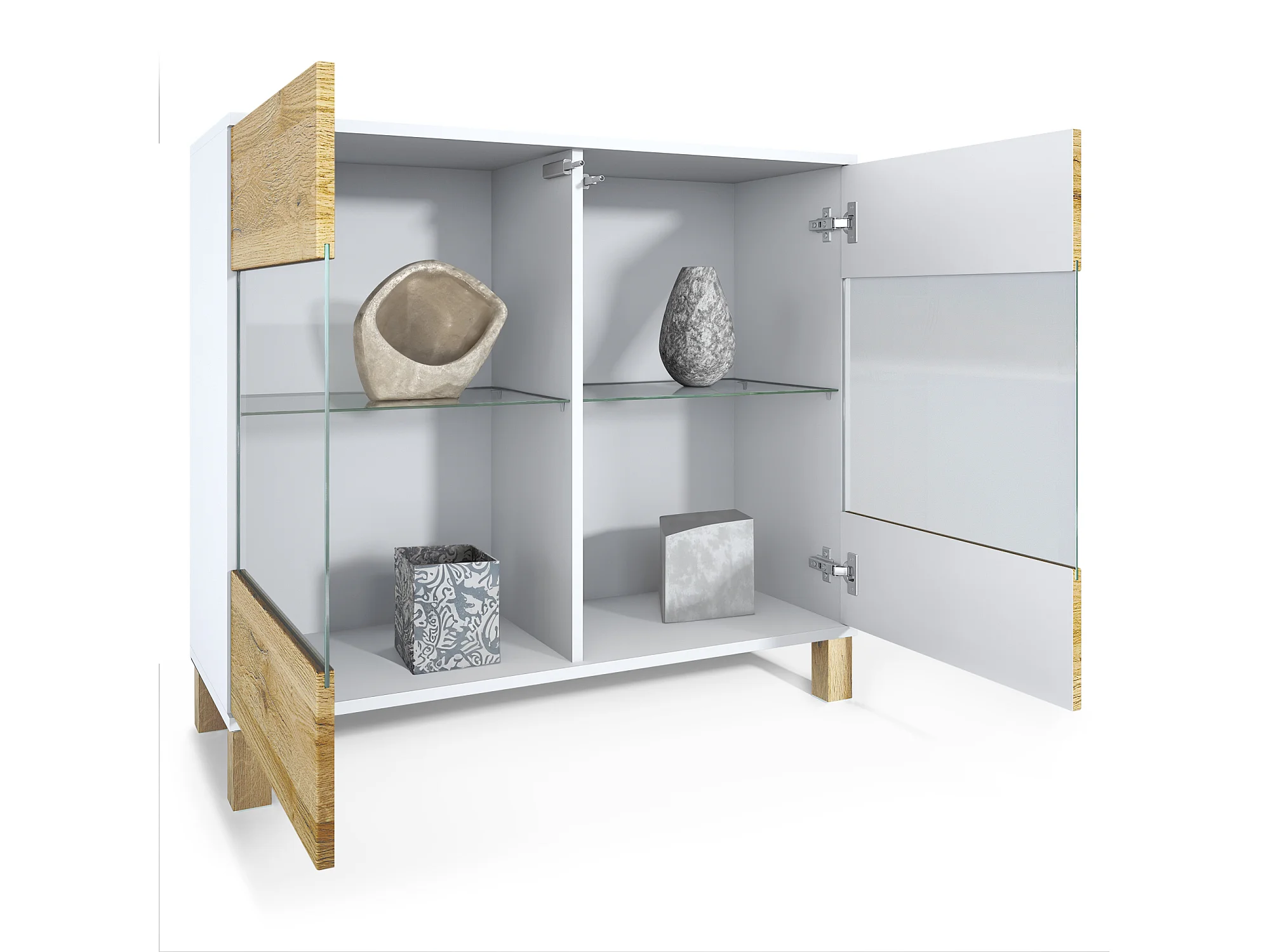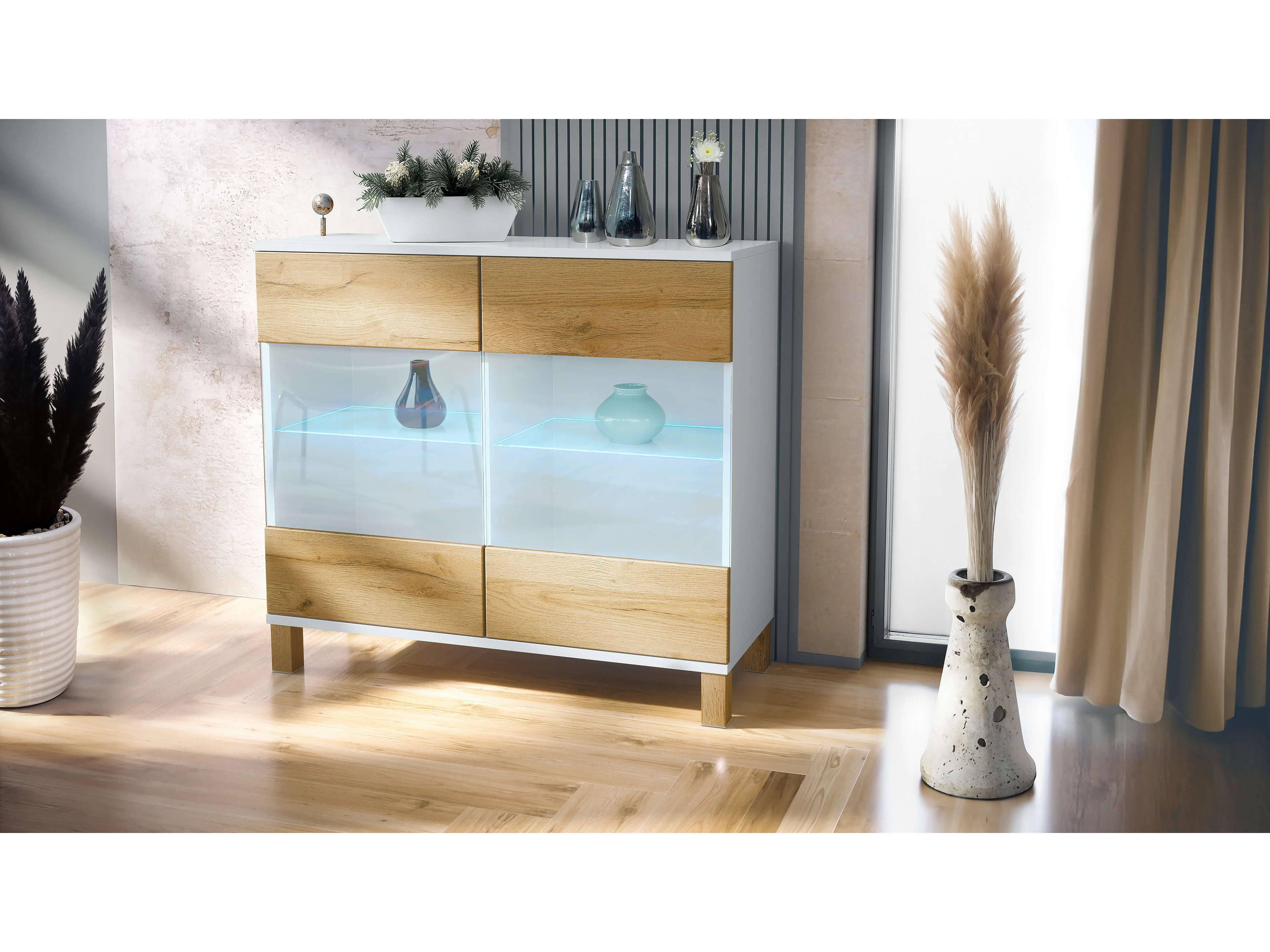 Cassettiera Bari V3 Edizione Legno, Mobile da cucina moderno con 2 grandi ante in vetro incl. illuminazione RGB bianco opaco / rovere naturale (92,5 x 84,5 x 35)