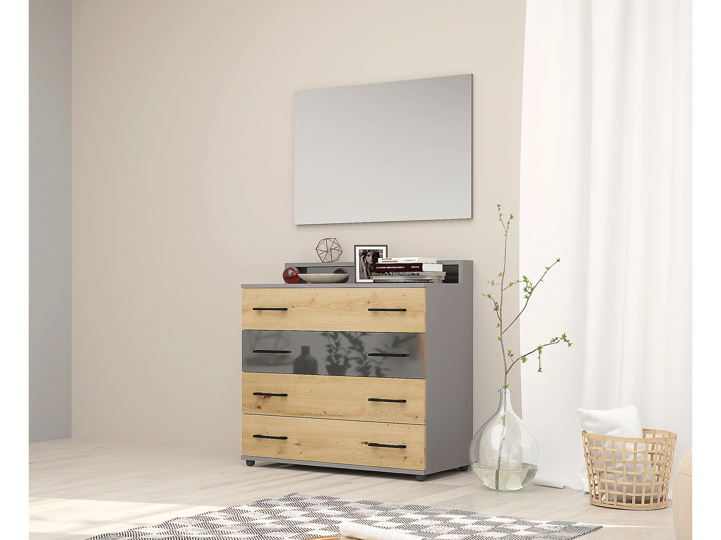 Cassettiera moderna con 4 cassetti rovere e grigio lucido CG31