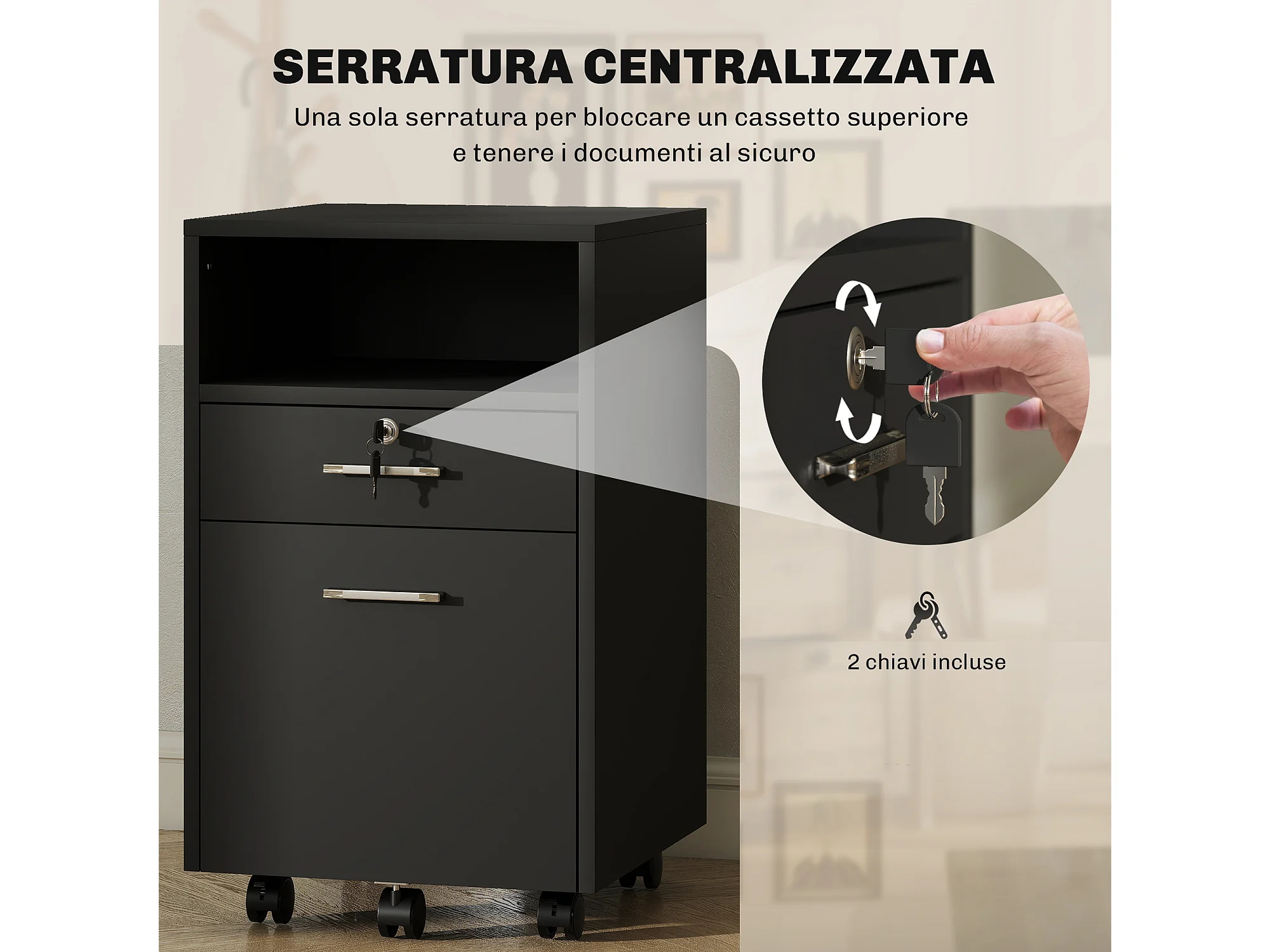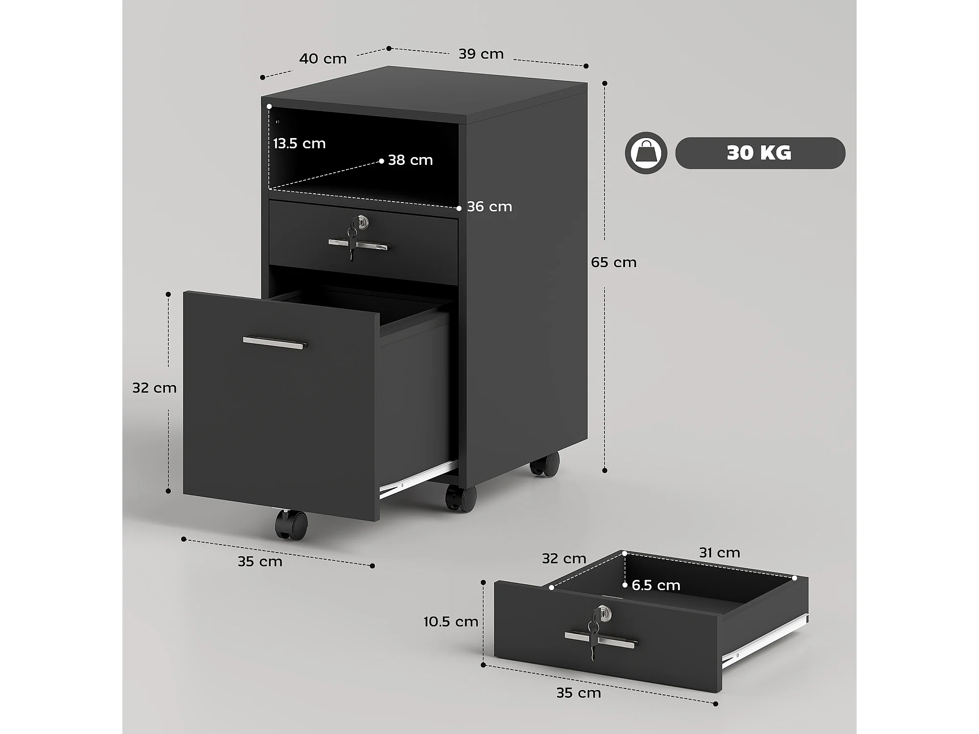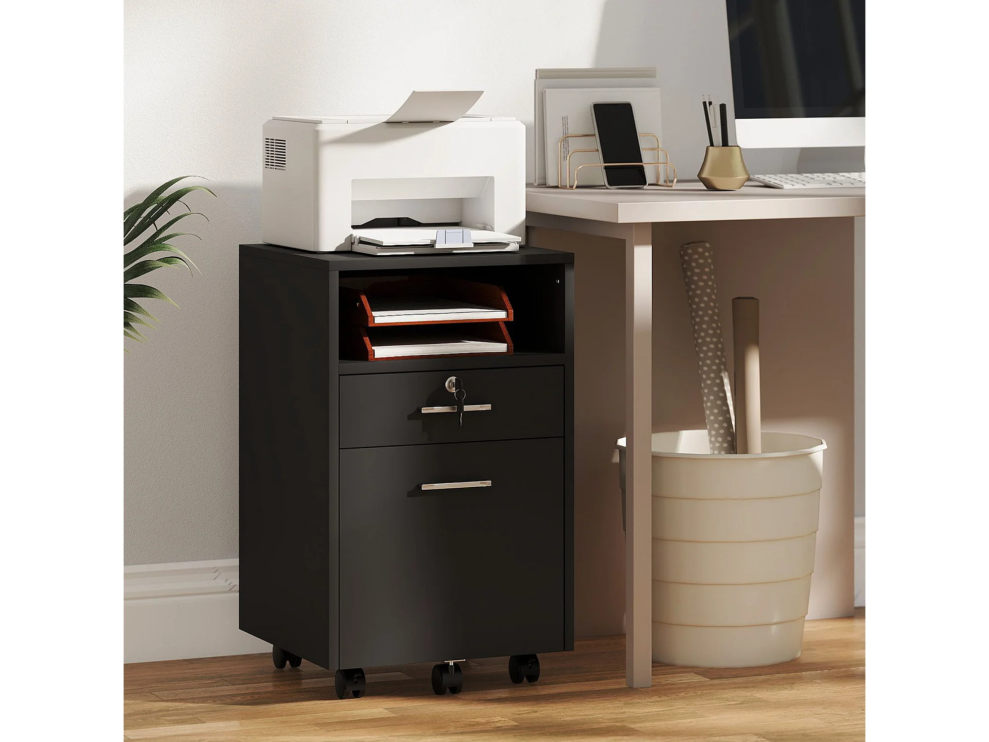 Classificatore Mobile SucceBuy in Legno, Mobile Contenitore da Ufficio a 2 Cassetti con Ripiani Aperti e Rotelle Bloccabili, per Ufficio, Nero