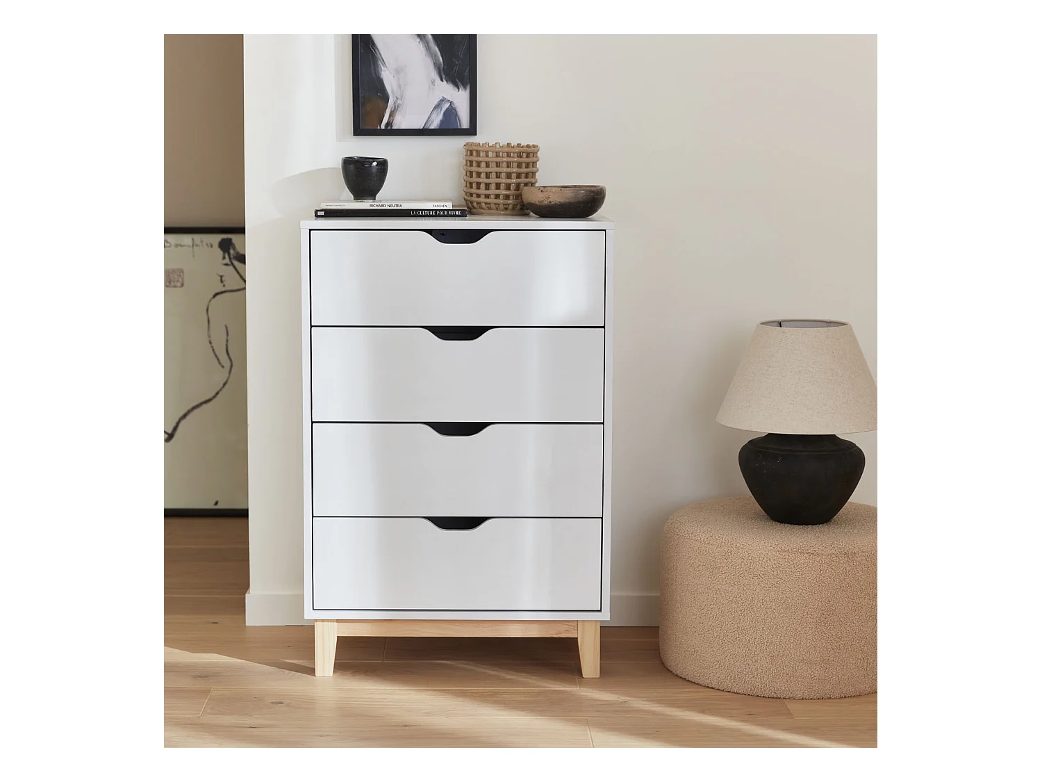 Cassettiera effetto legno con gambe in legno 4 cassetti, bianco