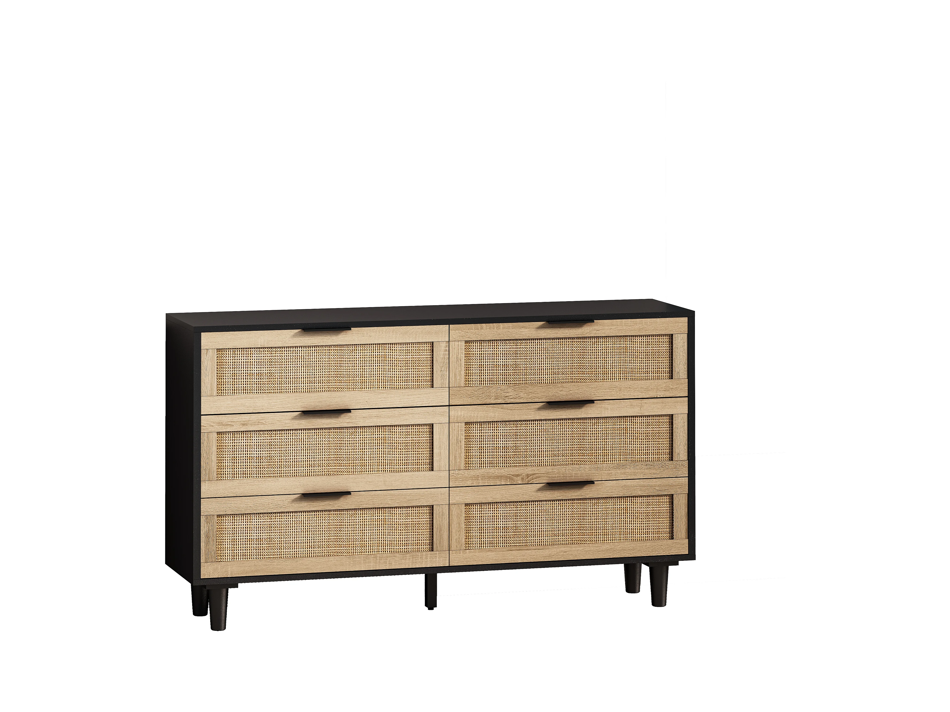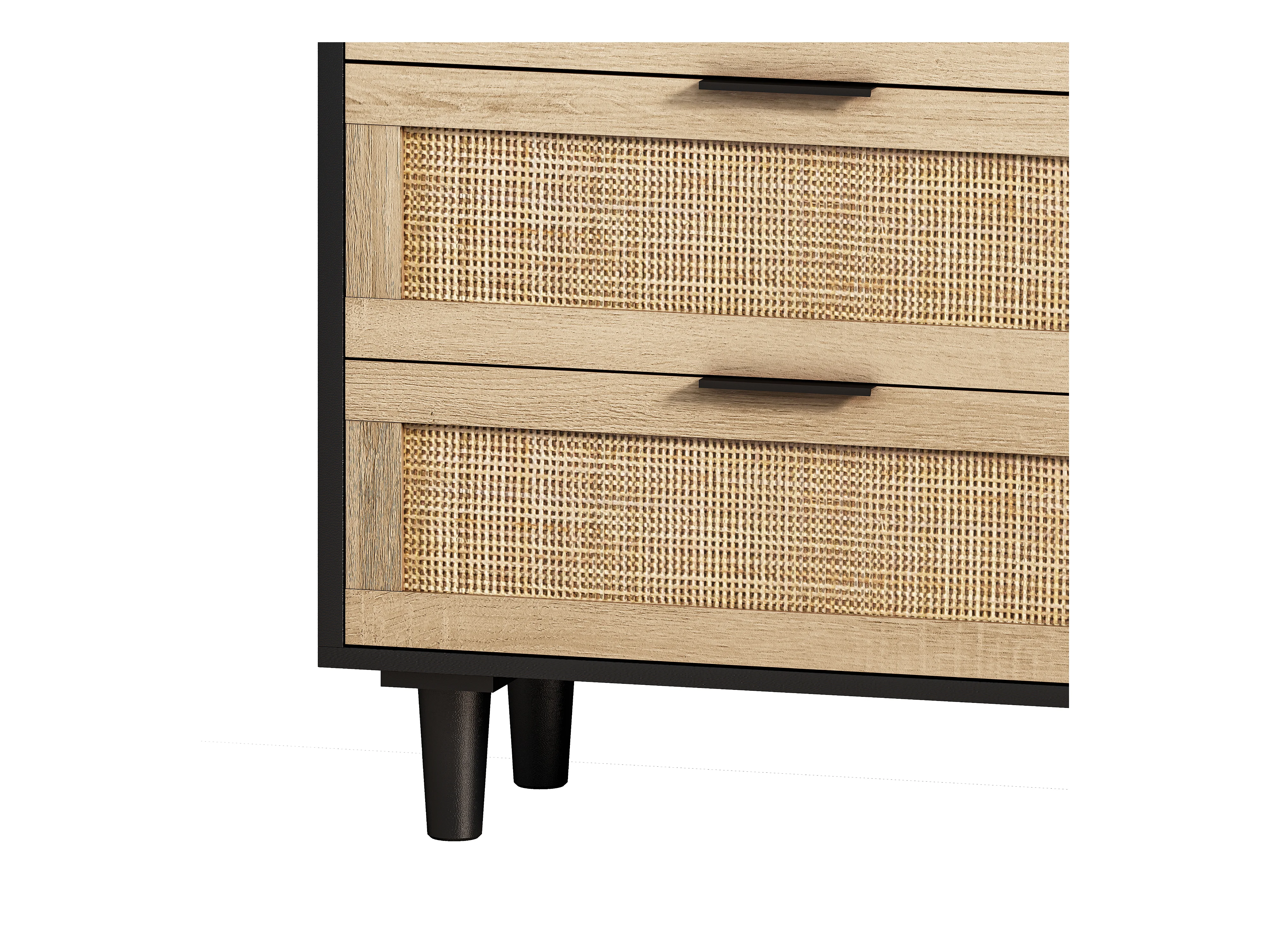 Comò rangement bois panneaux tiroirs rotin naturel salon chambre noire 90x40x80cm