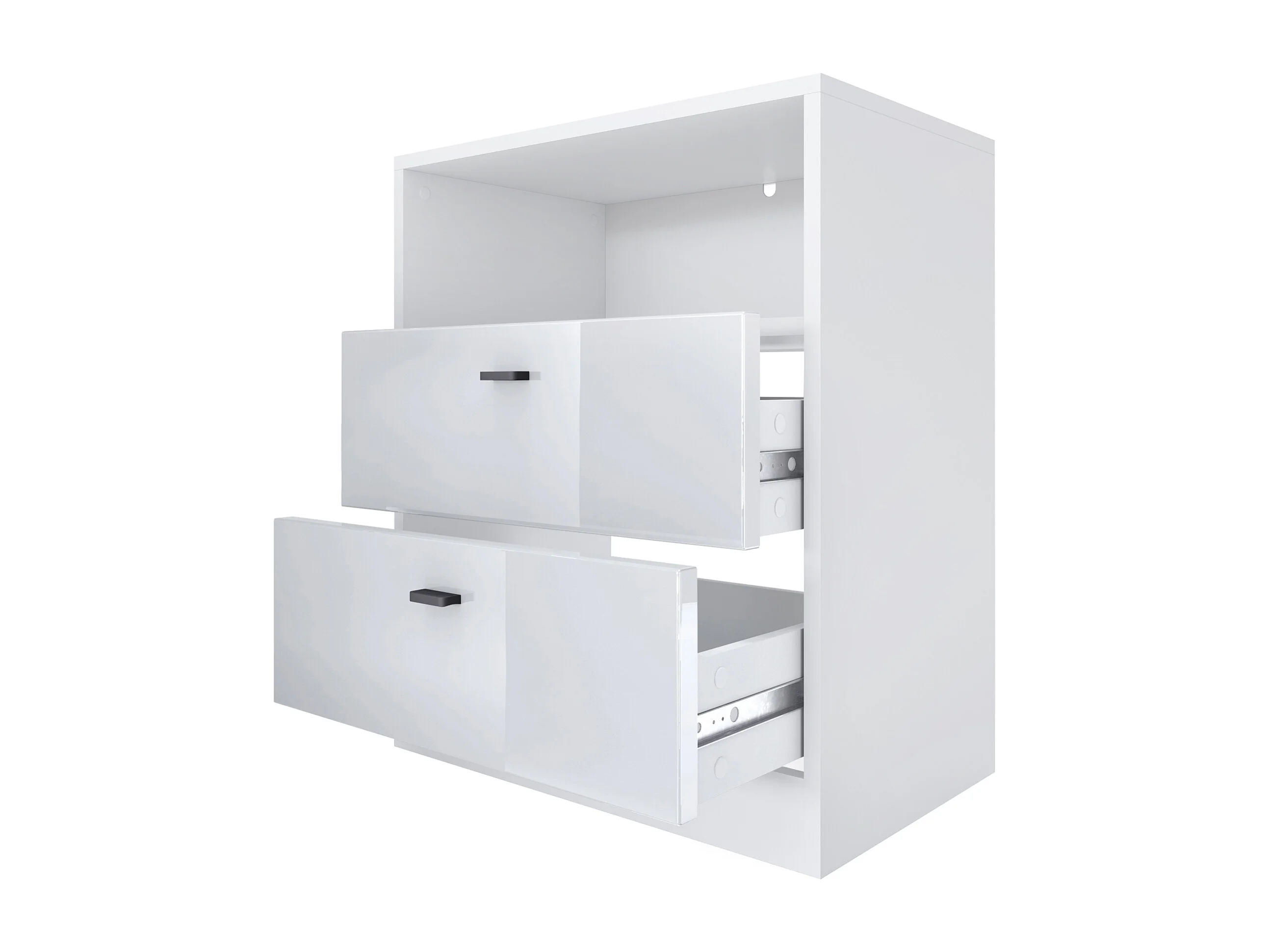 Cassettiera Pino V1, Comodino con 2 cassetti e 1 vano a giorno, Bianco opaco/Bianco lucido senza LED (56 x 67,5 x 36 cm)