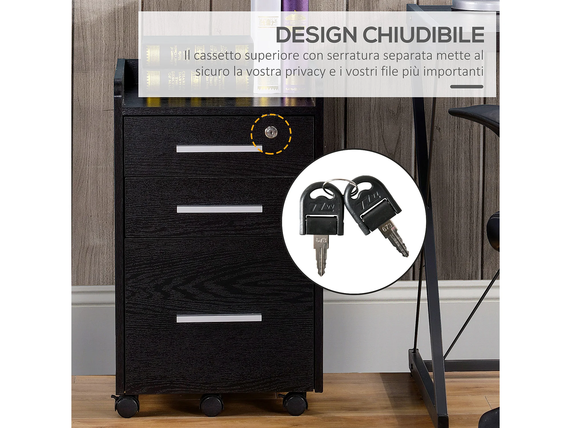 Cassettiera portadocumenti a 3 cassetti con chiavi e 5 ruote nero