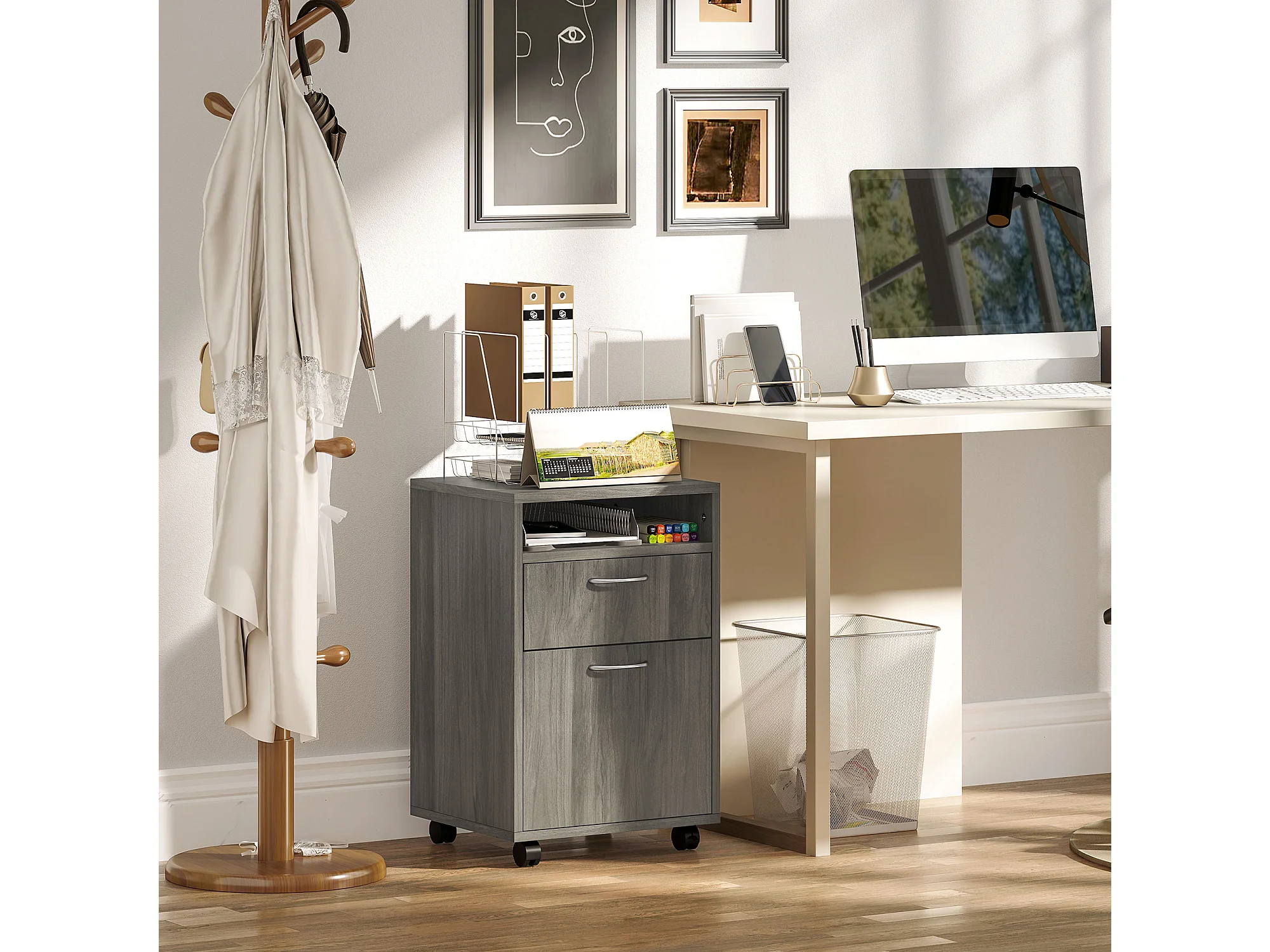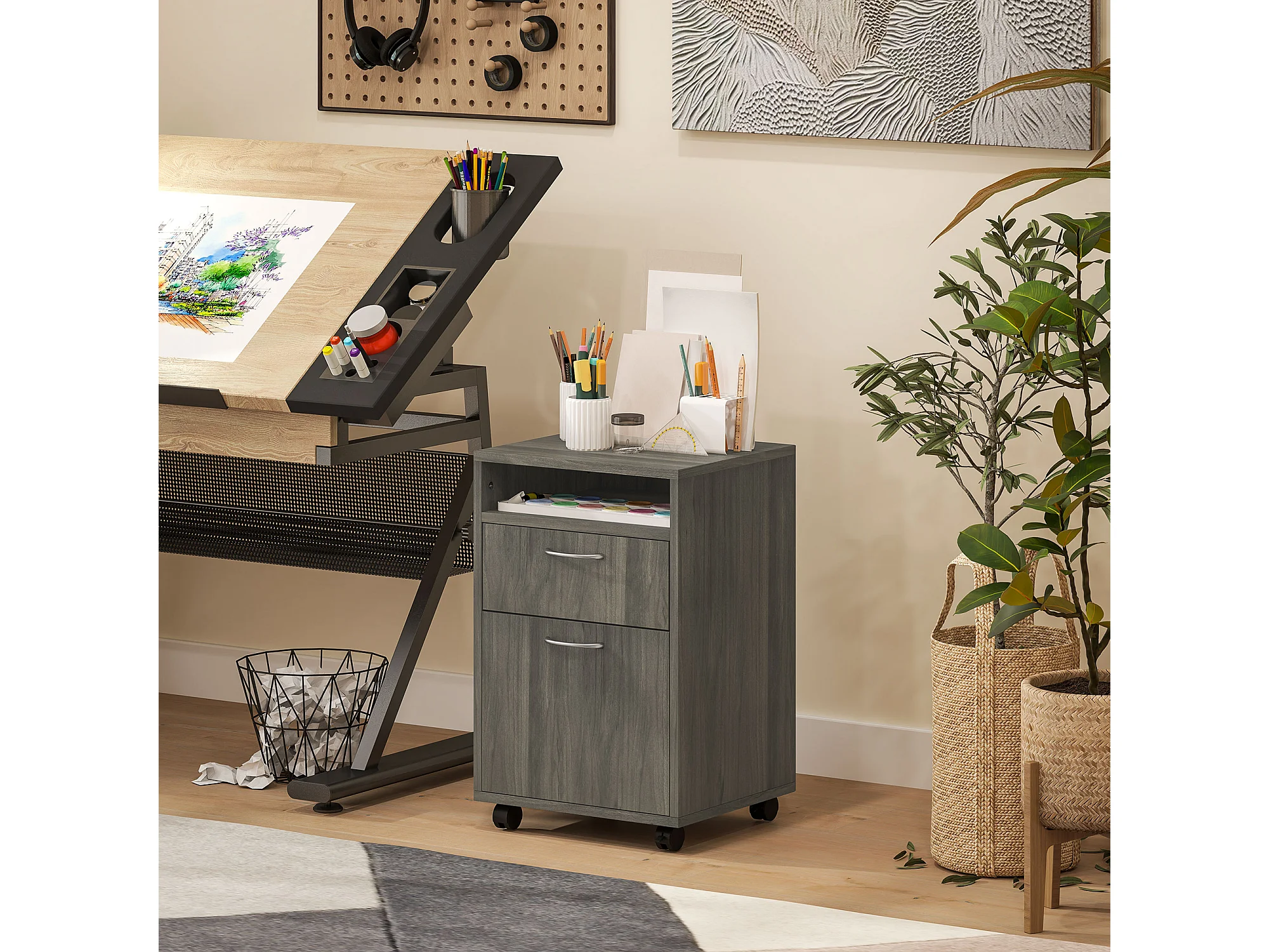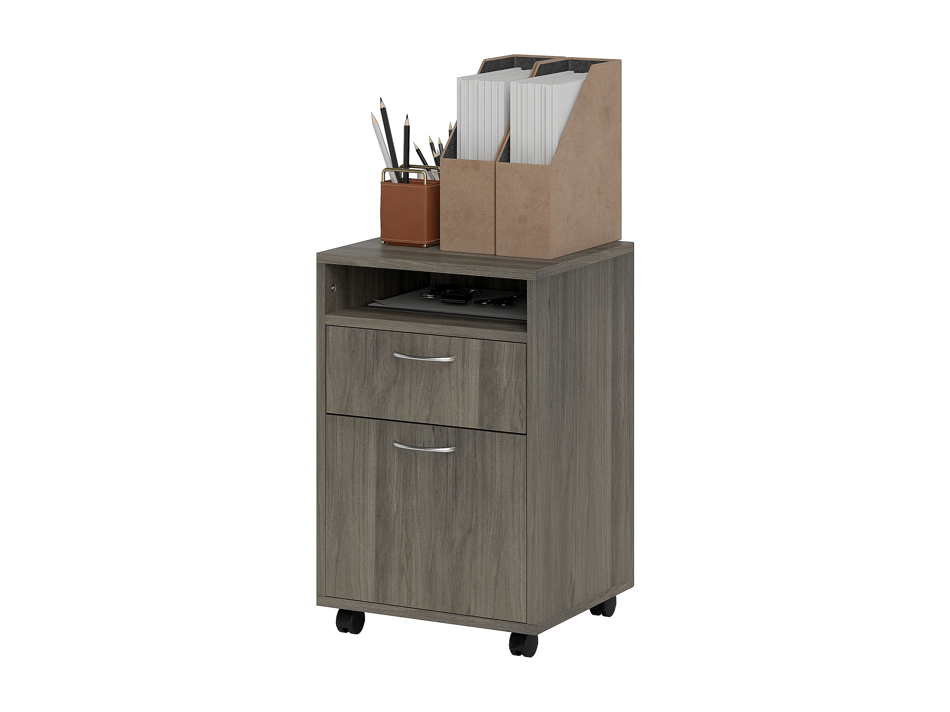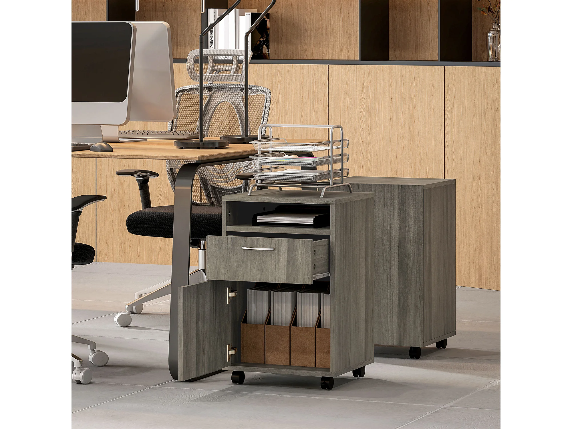 Cassettiera portadocumenti con ripiano aperto e cassetti grigio